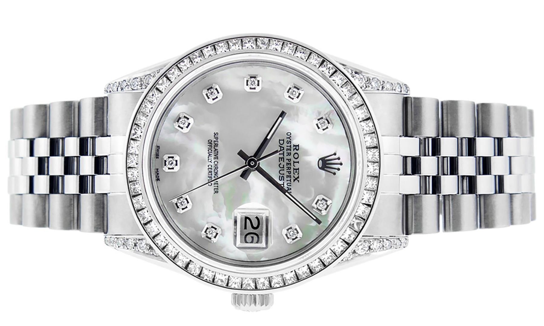 One Men's Rolex Datejust Polished Bright with Satin Finish, Serviced & Electronically Tested, Stainless Steel Case: 36mm, Custom Diamond Lugs: 28 Diamonds In Lugs, Color: G to H, Clarity: SI-VS. Stainless Steel Crown, Custom Bezel: New 14K White Gold Princess Cut Diamond Bezel, Diamond Count: 53 Diamonds, Total Weight 2.75 Carat, Clarity: SI-VS, Color: G to H. Custom Crystal: New Synthetic Sapphire Cyclops Lens. Custom Hands: New Luminescent Hands. Movement: Automatic Winding Movement Caliber 3035. Custom Dial: Mother Of Pearl Diamond Dial, Diamond Count: 10 Diamonds In Dial, Diamond Color: G To H In Color, Clarity: SI-VS. Date Window: 3 O'clock Position Date Display, Quickset, Model: Datejust Condition: G-6 Extra Fine. Bracelet: Stainless Steel Jubilee Band. Bright Polish & Satin Finish. 7.0 Inch Length, Adjustable. Standard Clasp, With Rolex Logo. This Watch Has Been Serviced And Polished And Its Free Of All Dents And Scratches.