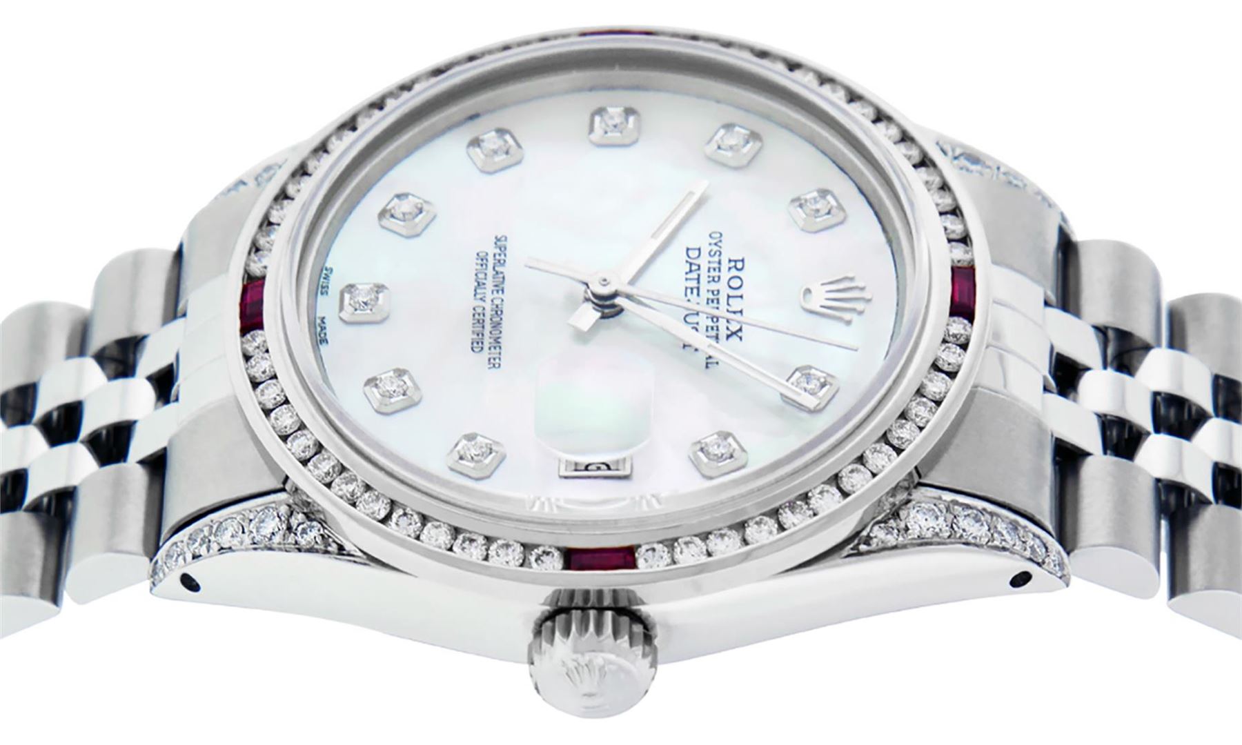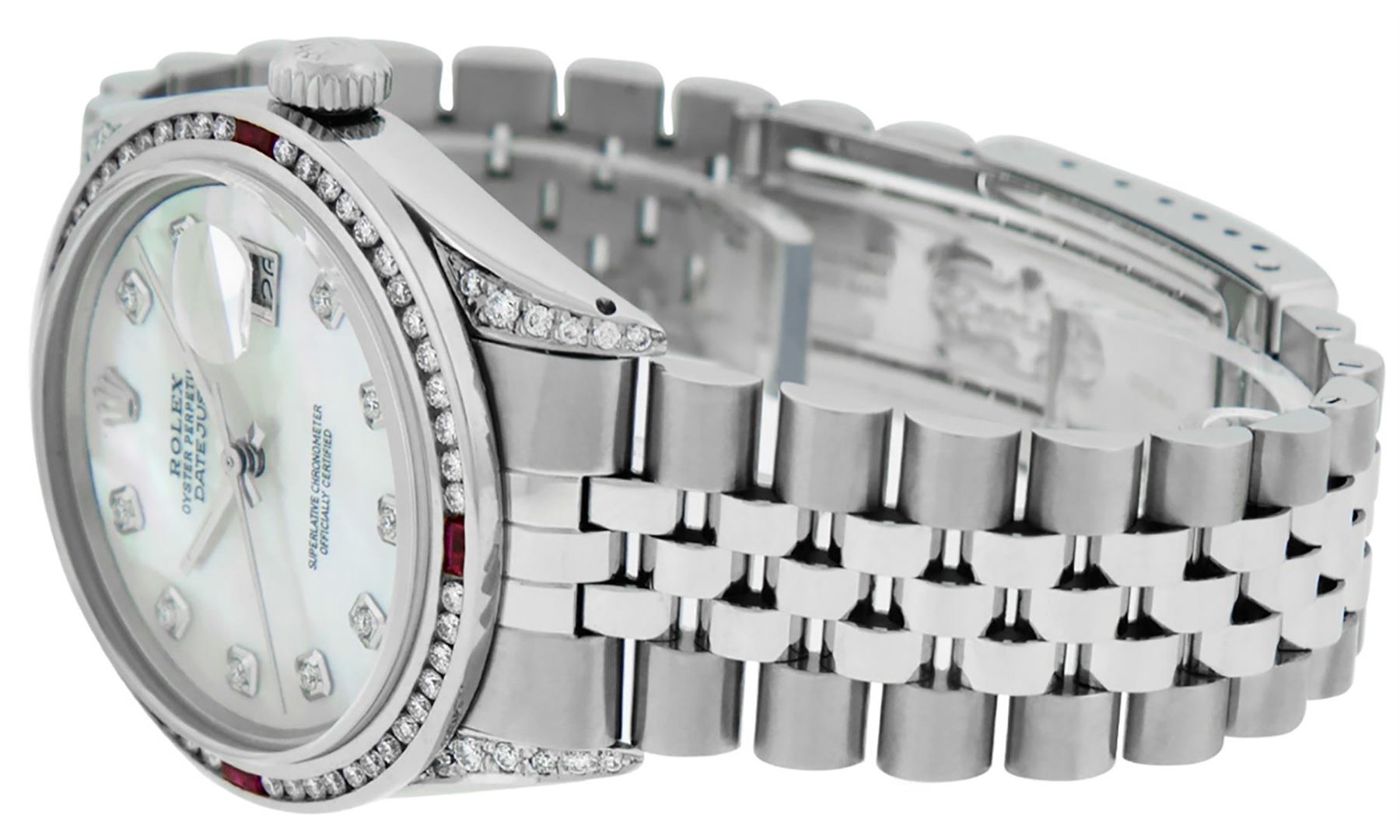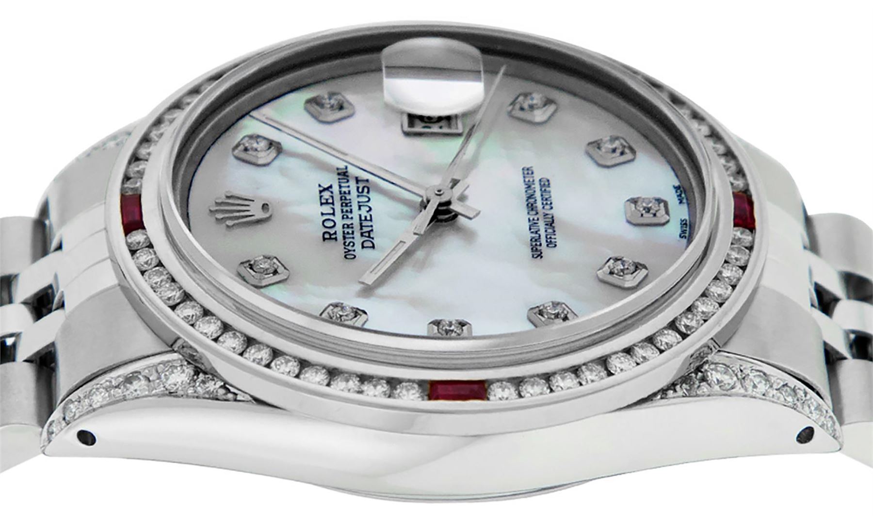 One Men's Rolex Datejust Polished Bright with Satin Finish, Serviced & Electronically Tested, Stainless Steel Case: 36mm, Custom Diamond Lugs: 28 Diamonds In Lugs, Color: G to H, Clarity: SI-VS. Stainless Steel Crown, Custom Bezel: New 18K White Gold Ruby Channel Set Diamond Bezel, Diamond + Gem Count: 52 Diamonds + 4 Rubies, Total Weight 1.30 Carat, Clarity: SI-VS, Color: G to H. Custom Crystal: New Synthetic Sapphire Cyclops Lens. Custom Hands: New Luminescent Hands. Movement: Automatic Winding Movement Caliber 3035. Custom Dial: Mother Of Pearl Diamond Dial, Diamond Count: 10 Diamonds In Dial, Diamond Color: G To H In Color, Clarity: SI-VS. Date Window: 3 O'clock Position Date Display, Quickset, Model: Datejust Condition: G-6 Extra Fine. Bracelet: Stainless Steel Jubilee Band. Bright Polish & Satin Finish. 7.0 Inch Length, Adjustable. Standard Clasp, With Rolex Logo. This Watch Has Been Serviced And Polished And Its Free Of All Dents And Scratches.