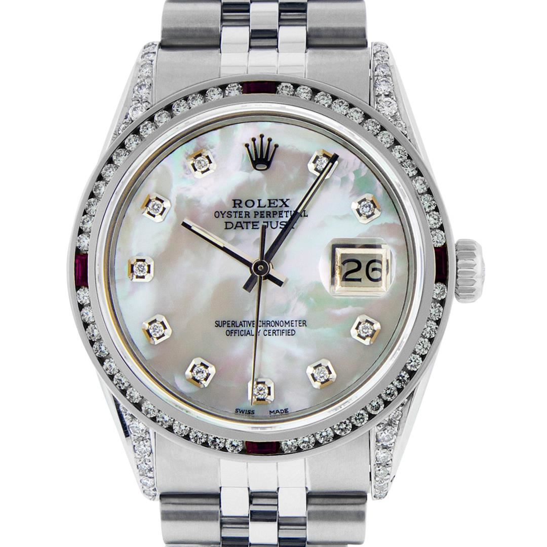 One Men's Rolex Datejust Polished Bright with Satin Finish, Serviced & Electronically Tested, Stainless Steel Case: 36mm, Custom Diamond Lugs: 28 Diamonds In Lugs, Color: G to H, Clarity: SI-VS. Stainless Steel Crown, Custom Bezel: New 18K White Gold Ruby Channel Set Diamond Bezel, Diamond + Gem Count: 52 Diamonds + 4 Rubies, Total Weight 1.30 Carat, Clarity: SI-VS, Color: G to H. Custom Crystal: New Synthetic Sapphire Cyclops Lens. Custom Hands: New Luminescent Hands. Movement: Automatic Winding Movement Caliber 3035. Custom Dial: Mother Of Pearl Diamond Dial, Diamond Count: 10 Diamonds In Dial, Diamond Color: G To H In Color, Clarity: SI-VS. Date Window: 3 O'clock Position Date Display, Quickset, Model: Datejust Condition: G-6 Extra Fine. Bracelet: Stainless Steel Jubilee Band. Bright Polish & Satin Finish. 7.0 Inch Length, Adjustable. Standard Clasp, With Rolex Logo. This Watch Has Been Serviced And Polished And Its Free Of All Dents And Scratches.