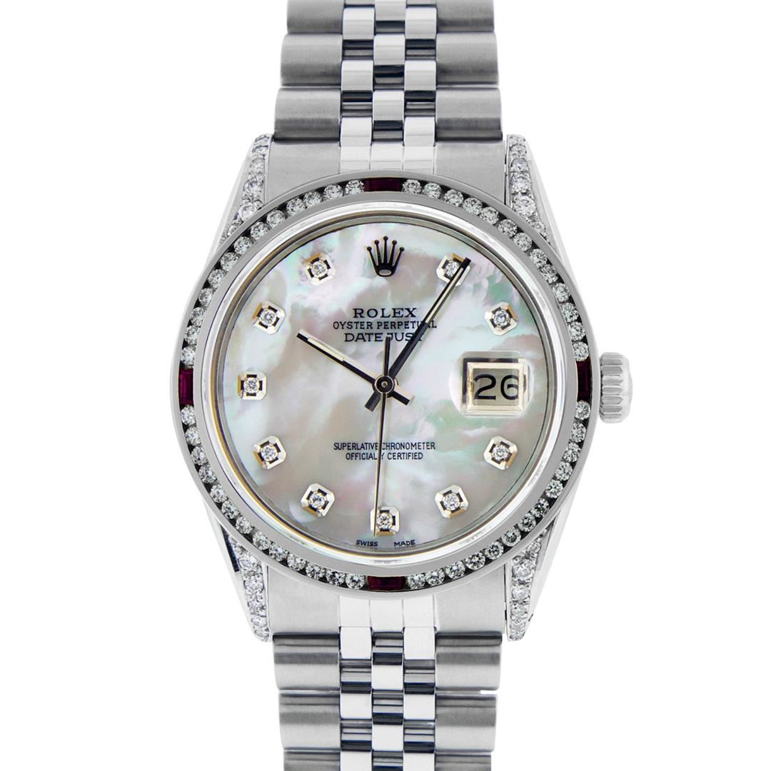 One Men's Rolex Datejust Polished Bright with Satin Finish, Serviced & Electronically Tested, Stainless Steel Case: 36mm, Custom Diamond Lugs: 28 Diamonds In Lugs, Color: G to H, Clarity: SI-VS. Stainless Steel Crown, Custom Bezel: New 18K White Gold Ruby Channel Set Diamond Bezel, Diamond + Gem Count: 52 Diamonds + 4 Rubies, Total Weight 1.30 Carat, Clarity: SI-VS, Color: G to H. Custom Crystal: New Synthetic Sapphire Cyclops Lens. Custom Hands: New Luminescent Hands. Movement: Automatic Winding Movement Caliber 3035. Custom Dial: Mother Of Pearl Diamond Dial, Diamond Count: 10 Diamonds In Dial, Diamond Color: G To H In Color, Clarity: SI-VS. Date Window: 3 O'clock Position Date Display, Quickset, Model: Datejust Condition: G-6 Extra Fine. Bracelet: Stainless Steel Jubilee Band. Bright Polish & Satin Finish. 7.0 Inch Length, Adjustable. Standard Clasp, With Rolex Logo. This Watch Has Been Serviced And Polished And Its Free Of All Dents And Scratches.