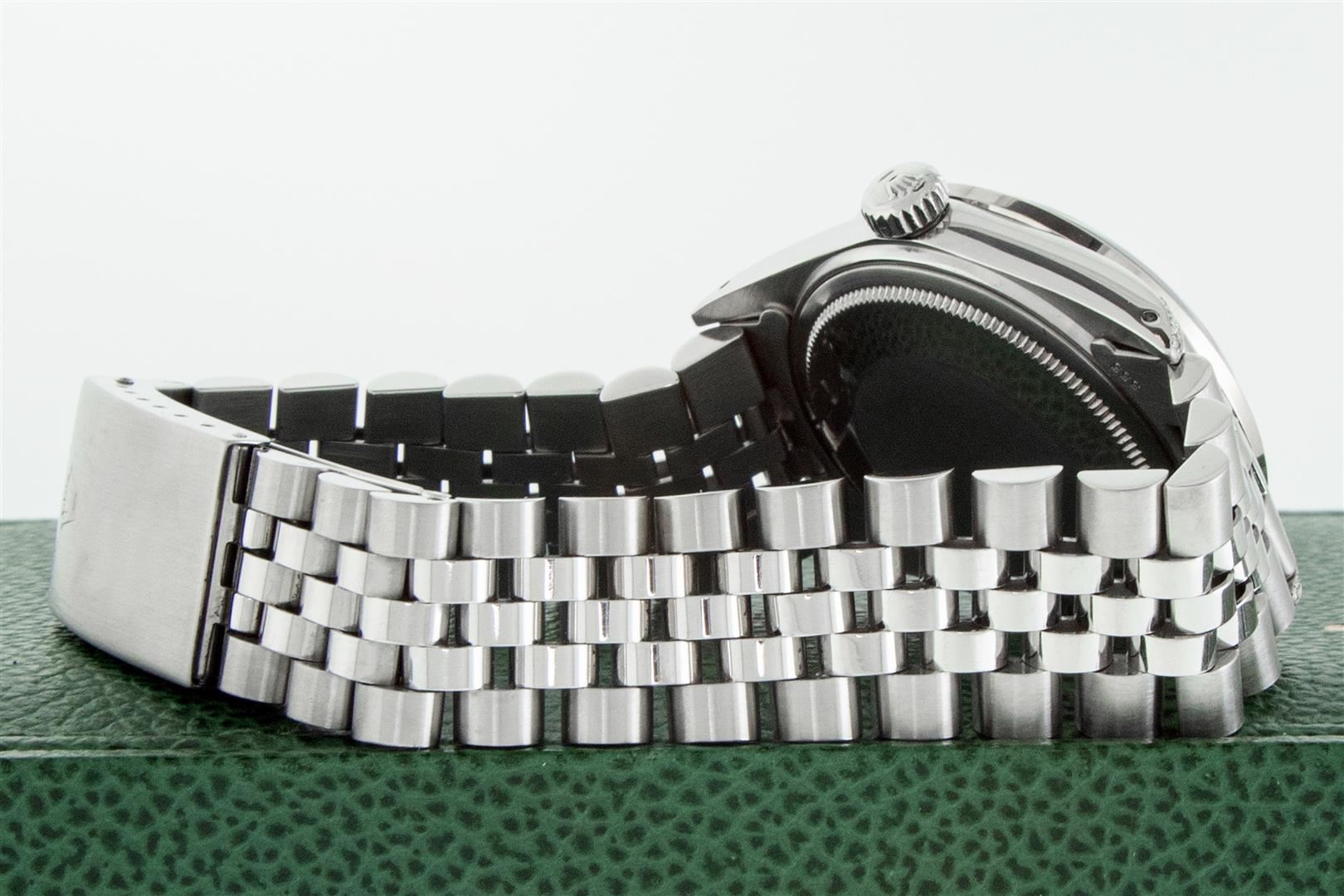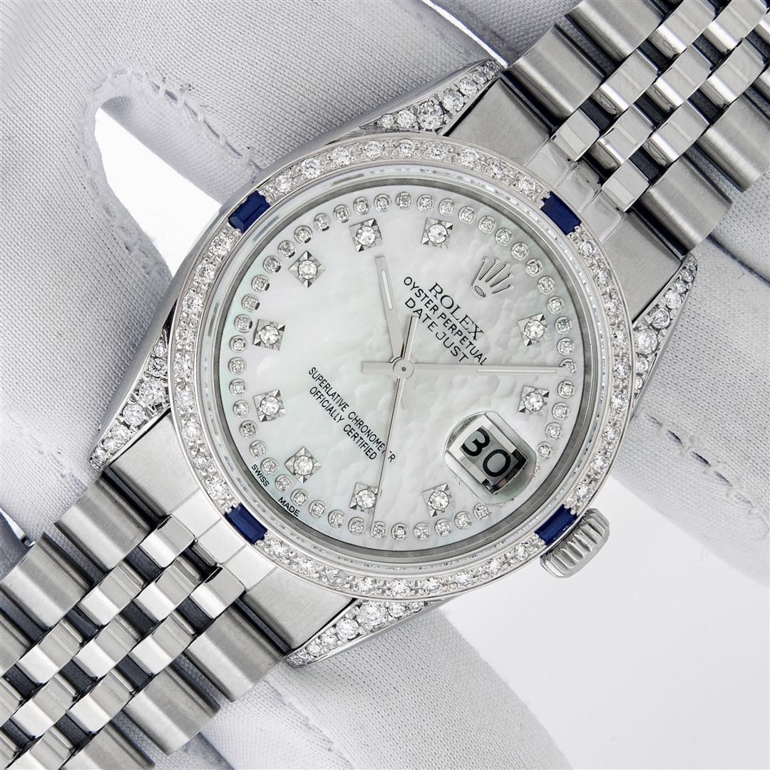 One Men's Rolex Datejust Polished Bright with Satin Finish, Serviced & Electronically Tested, Rolex Stainless Steel Case: 36mm, Custom Diamond Lugs: 28 Diamonds In Lugs, Color: G to H, Clarity: SI-VS. Rolex Stainless Steel Crown, New Custom Bezel: 18K White Gold Diamond + Sapphire Beadset, Diamond Count: 36 Diamonds + 4 Sapphires, Total Weight 1.00 Carat, Clarity: SI-VS, Color: G to H. Custom Crystal: New Sapphire With Magnified Date Window. Custom Hands: New Luminescent Hands. Rolex Movement: Automatic Winding Movement. Custom Dial: Mother Of Pearl String Diamond Dial, Stone Count: 58 Diamonds In Dial, Diamond Color: G To H In Color, Clarity: VS. Date Window: 3 O'clock Position Date Display, Quickset, Model: Datejust Condition: G-6 Extra Fine. Rolex Bracelet: Stainless Steel Jubilee Band. Bright Polish & Satin Finish. 7.0 Inch Length, Adjustable. Standard Clasp, With Rolex Logo. This Pre Owned Watch Has Been Serviced And Polished And Its Free Of All Dents And Scratches. This Watch Comes With A Rolex Box.