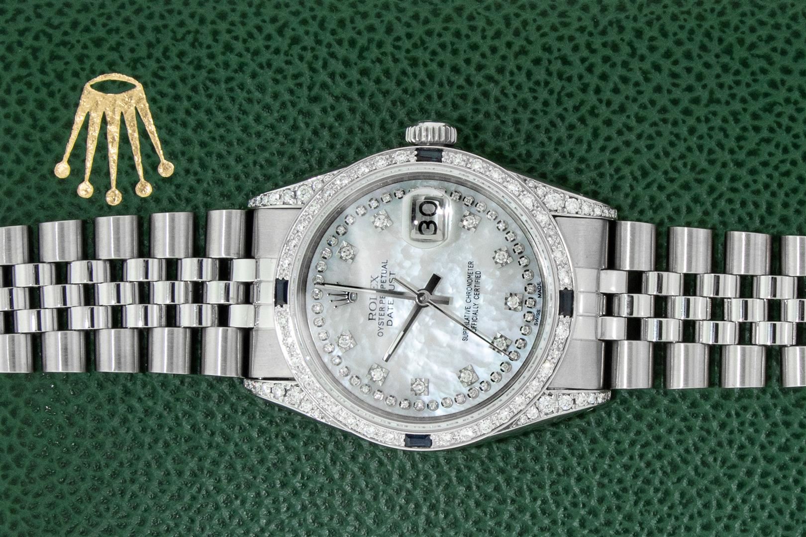 One Men's Rolex Datejust Polished Bright with Satin Finish, Serviced & Electronically Tested, Rolex Stainless Steel Case: 36mm, Custom Diamond Lugs: 28 Diamonds In Lugs, Color: G to H, Clarity: SI-VS. Rolex Stainless Steel Crown, New Custom Bezel: 18K White Gold Diamond + Sapphire Beadset, Diamond Count: 36 Diamonds + 4 Sapphires, Total Weight 1.00 Carat, Clarity: SI-VS, Color: G to H. Custom Crystal: New Sapphire With Magnified Date Window. Custom Hands: New Luminescent Hands. Rolex Movement: Automatic Winding Movement. Custom Dial: Mother Of Pearl String Diamond Dial, Stone Count: 58 Diamonds In Dial, Diamond Color: G To H In Color, Clarity: VS. Date Window: 3 O'clock Position Date Display, Quickset, Model: Datejust Condition: G-6 Extra Fine. Rolex Bracelet: Stainless Steel Jubilee Band. Bright Polish & Satin Finish. 7.0 Inch Length, Adjustable. Standard Clasp, With Rolex Logo. This Pre Owned Watch Has Been Serviced And Polished And Its Free Of All Dents And Scratches. This Watch Comes With A Rolex Box.