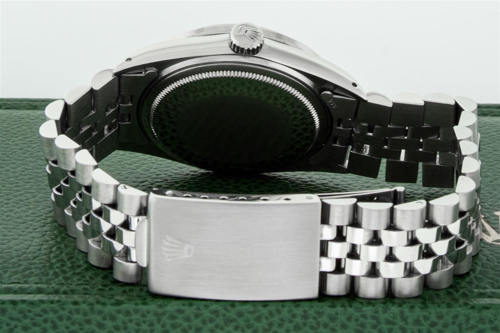 One Men's Rolex Datejust Polished Bright with Satin Finish, Serviced & Electronically Tested, Rolex Stainless Steel Case: 36mm, Custom Diamond Lugs: 28 Diamonds In Lugs, Color: G to H, Clarity: SI-VS. Rolex Stainless Steel Crown, New Custom Bezel: 18K White Gold Diamond + Sapphire Beadset, Diamond Count: 36 Diamonds + 4 Sapphires, Total Weight 1.00 Carat, Clarity: SI-VS, Color: G to H. Custom Crystal: New Sapphire With Magnified Date Window. Custom Hands: New Luminescent Hands. Rolex Movement: Automatic Winding Movement. Custom Dial: Mother Of Pearl String Diamond Dial, Stone Count: 58 Diamonds In Dial, Diamond Color: G To H In Color, Clarity: VS. Date Window: 3 O'clock Position Date Display, Quickset, Model: Datejust Condition: G-6 Extra Fine. Rolex Bracelet: Stainless Steel Jubilee Band. Bright Polish & Satin Finish. 7.0 Inch Length, Adjustable. Standard Clasp, With Rolex Logo. This Pre Owned Watch Has Been Serviced And Polished And Its Free Of All Dents And Scratches. This Watch Comes With A Rolex Box.