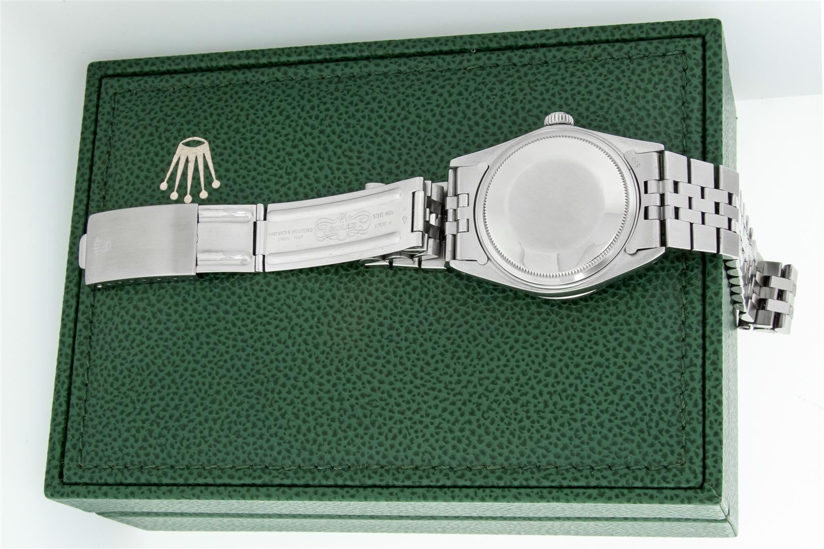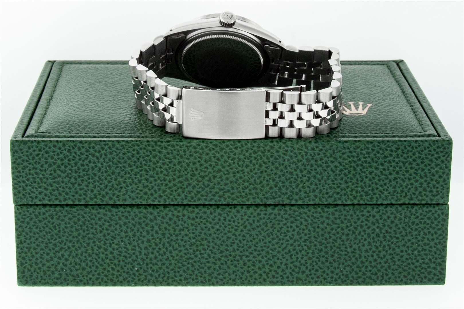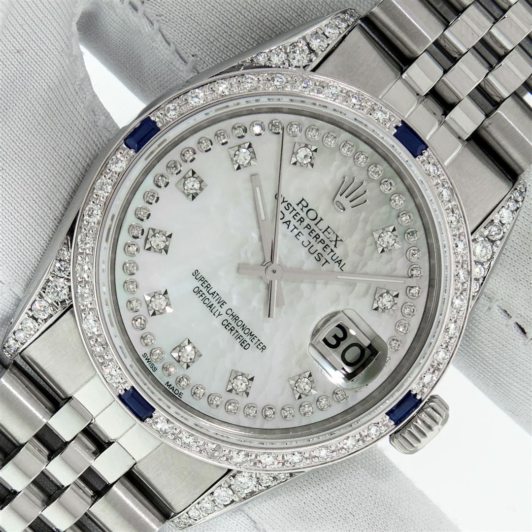 One Men's Rolex Datejust Polished Bright with Satin Finish, Serviced & Electronically Tested, Rolex Stainless Steel Case: 36mm, Custom Diamond Lugs: 28 Diamonds In Lugs, Color: G to H, Clarity: SI-VS. Rolex Stainless Steel Crown, New Custom Bezel: 18K White Gold Diamond + Sapphire Beadset, Diamond Count: 36 Diamonds + 4 Sapphires, Total Weight 1.00 Carat, Clarity: SI-VS, Color: G to H. Custom Crystal: New Sapphire With Magnified Date Window. Custom Hands: New Luminescent Hands. Rolex Movement: Automatic Winding Movement. Custom Dial: Mother Of Pearl String Diamond Dial, Stone Count: 58 Diamonds In Dial, Diamond Color: G To H In Color, Clarity: VS. Date Window: 3 O'clock Position Date Display, Quickset, Model: Datejust Condition: G-6 Extra Fine. Rolex Bracelet: Stainless Steel Jubilee Band. Bright Polish & Satin Finish. 7.0 Inch Length, Adjustable. Standard Clasp, With Rolex Logo. This Pre Owned Watch Has Been Serviced And Polished And Its Free Of All Dents And Scratches. This Watch Comes With A Rolex Box.
