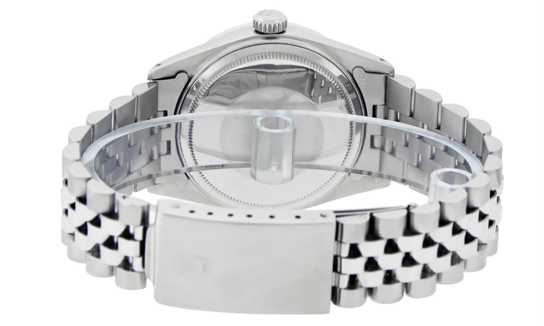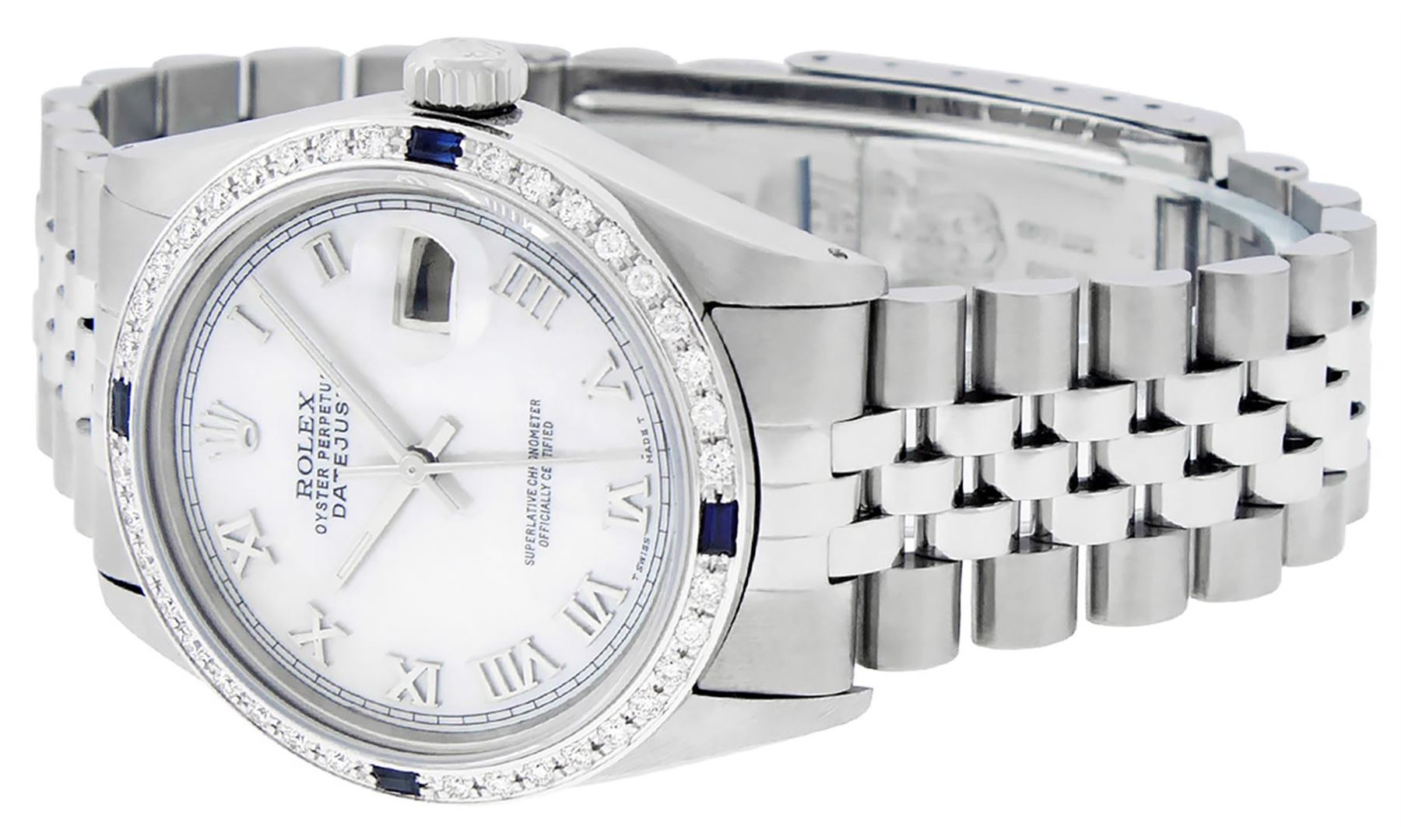 One Men's Stainless Steel Rolex Datejust Polished Bright with Satin Finish, This Watch Has Been Serviced & Electronically Tested, Stainless Steel Case: 36mm, Stainless Steel Crown, Custom Bezel: New 18K White Gold Sapphire Beadset Diamond Bezel, Diamond + Gem Count: 36 Diamonds + 4 Sapphires, Total Weight 1.00 Carat, Clarity: SI-VS, Color: G to H. Custom Crystal: New Synthetic Sapphire Cyclops Lens. Custom Hands: New Luminescent Hands. Movement: Automatic Winding Movement.. Custom Dial: Mother Of Pearl With Roman Track. Date Window: 3 O'clock Position Date Display, Quickset, Model: Datejust, Condition: G-6 Extra Fine. Bracelet: Stainless Steel Jubilee. Bracelet: 7.0 Inch Length, Adjustable. Standard Clasp, With Rolex Logo. This Watch Has Been Serviced Time Tested And Is In Excellent Condition It Is Free Of All Scratches And Dents.