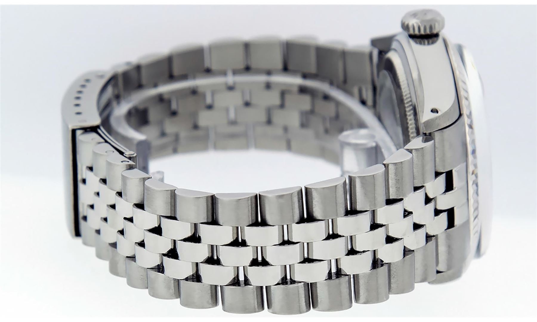 One Men's Stainless Steel Rolex Datejust Polished Bright with Satin Finish, This Watch Has Been Serviced & Electronically Tested, Stainless Steel Case: 36mm, Stainless Steel Crown, Original Bezel: 14K White Gold Fluted Bezel. Custom Crystal: New Acrylic Cyclops Lens. Custom Hands: New Luminescent Hands. Movement: Automatic Winding Movement Caliber 3035. Custom Dial: Meteorite Diamond Dial With Diamond Hour Markers, Diamond Count: 10 Diamonds in Dial, G To H In Color, SI-VS Clarity. Date Window: 3 O'clock Position Date Display, Quickset, Model: Datejust, Condition: G-6 Extra Fine. Bracelet: Stainless Steel Jubilee. Bright Polish & Satin Finish. 7.0 Inch Length, Adjustable. Standard Clasp, With Rolex Logo. This Watch Has Been Serviced Time Tested And Is In Excellent Condition It Is Free Of All Scratches And Dents