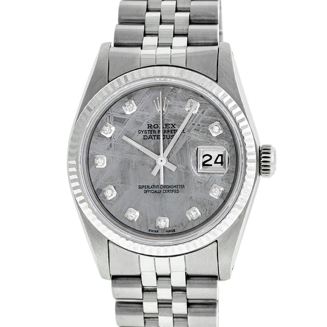 One Men's Stainless Steel Rolex Datejust Polished Bright with Satin Finish, This Watch Has Been Serviced & Electronically Tested, Stainless Steel Case: 36mm, Stainless Steel Crown, Original Bezel: 14K White Gold Fluted Bezel. Custom Crystal: New Acrylic Cyclops Lens. Custom Hands: New Luminescent Hands. Movement: Automatic Winding Movement Caliber 3035. Custom Dial: Meteorite Diamond Dial With Diamond Hour Markers, Diamond Count: 10 Diamonds in Dial, G To H In Color, SI-VS Clarity. Date Window: 3 O'clock Position Date Display, Quickset, Model: Datejust, Condition: G-6 Extra Fine. Bracelet: Stainless Steel Jubilee. Bright Polish & Satin Finish. 7.0 Inch Length, Adjustable. Standard Clasp, With Rolex Logo. This Watch Has Been Serviced Time Tested And Is In Excellent Condition It Is Free Of All Scratches And Dents