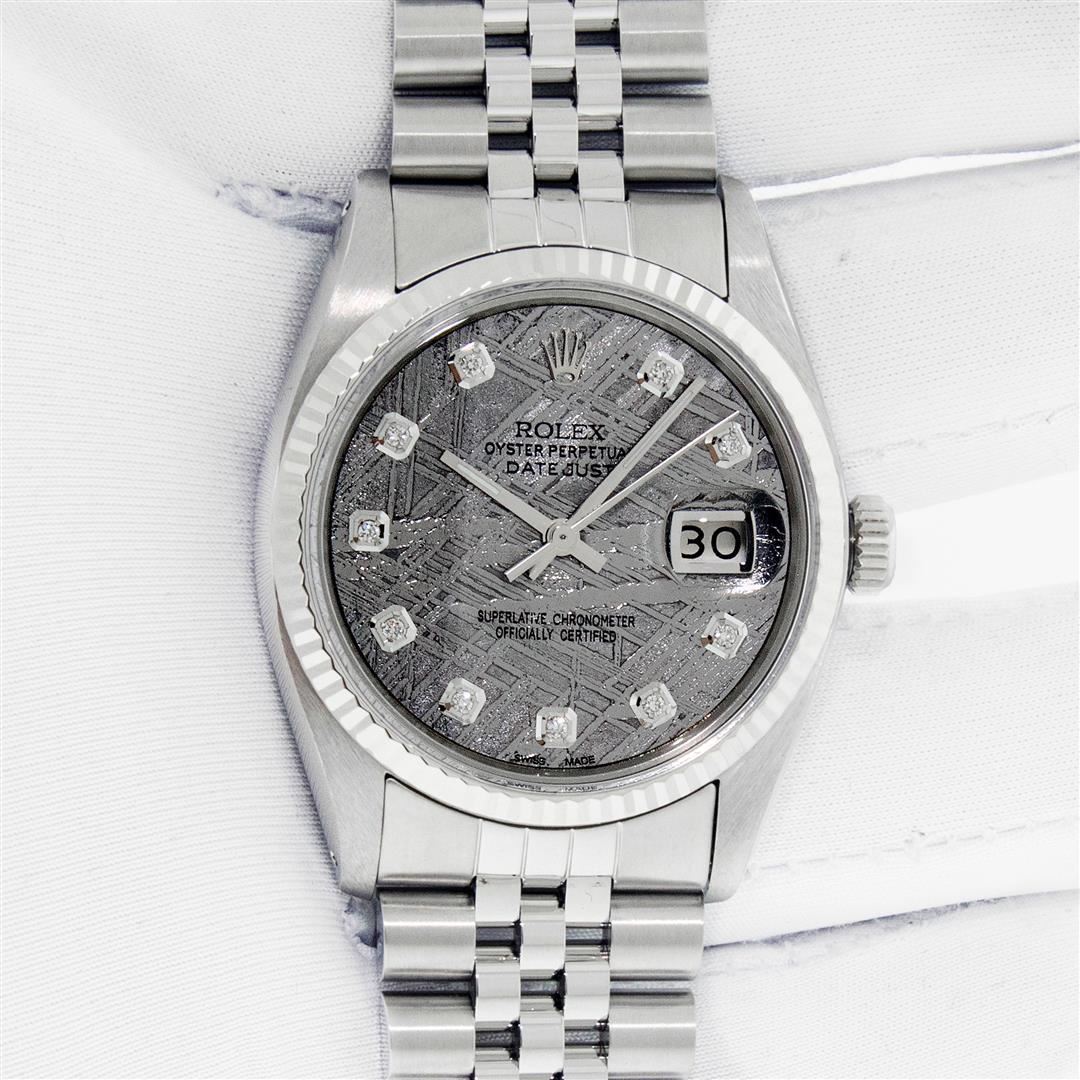 One Men's Pre Owned Stainless Steel Rolex Datejust Polished Bright with Satin Finish, This Watch Has Been Serviced & Electronically Tested, Rolex Stainless Steel Case: 36mm, Rolex Stainless Steel Crown, Rolex Bezel: White Gold Fluted Bezel. Custom Crystal: New Acrylic With Magnified Date. Custom Hands: New Luminescent Hands. Rolex Movement: Automatic Winding Movement. Custom Dial: Custom Meteorite Diamond Dial With Added Diamond Hour Markers, Diamond Count: 10 Diamonds in Dial, G To H In Color, SI-VS Clarity. Date Window: 3 O'clock Position Date Display, Quickset, Model: Datejust, Condition: G-6 Extra Fine. Rolex Bracelet: Stainless Steel Jubilee Band. Bright Polish & Satin Finish. 7.0 Inch Length, Adjustable. Standard Clasp, With Rolex Logo. This Pre Owned Watch Has Been Serviced Time Tested And Is In Excellent Condition It Is Free Of All Scratches And Dents. This Watch Comes With A Rolex Box.