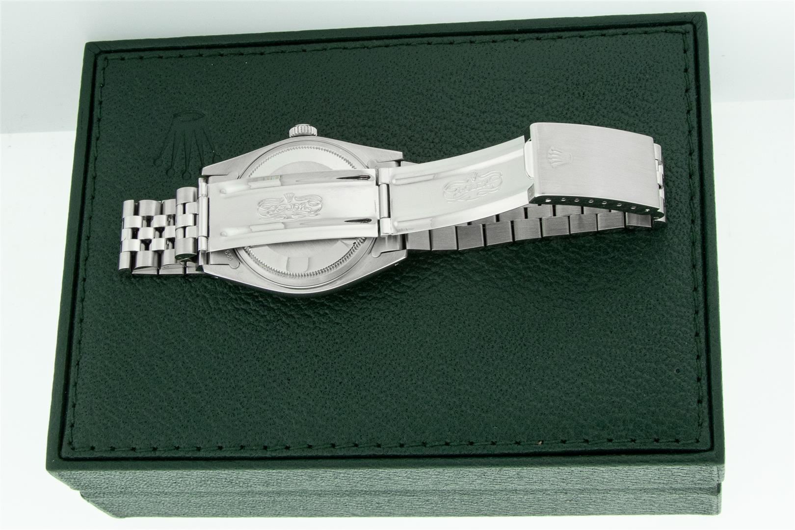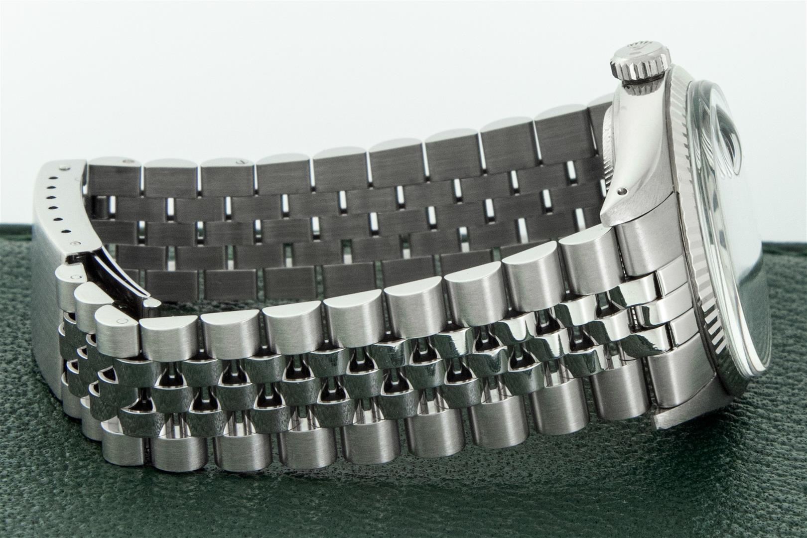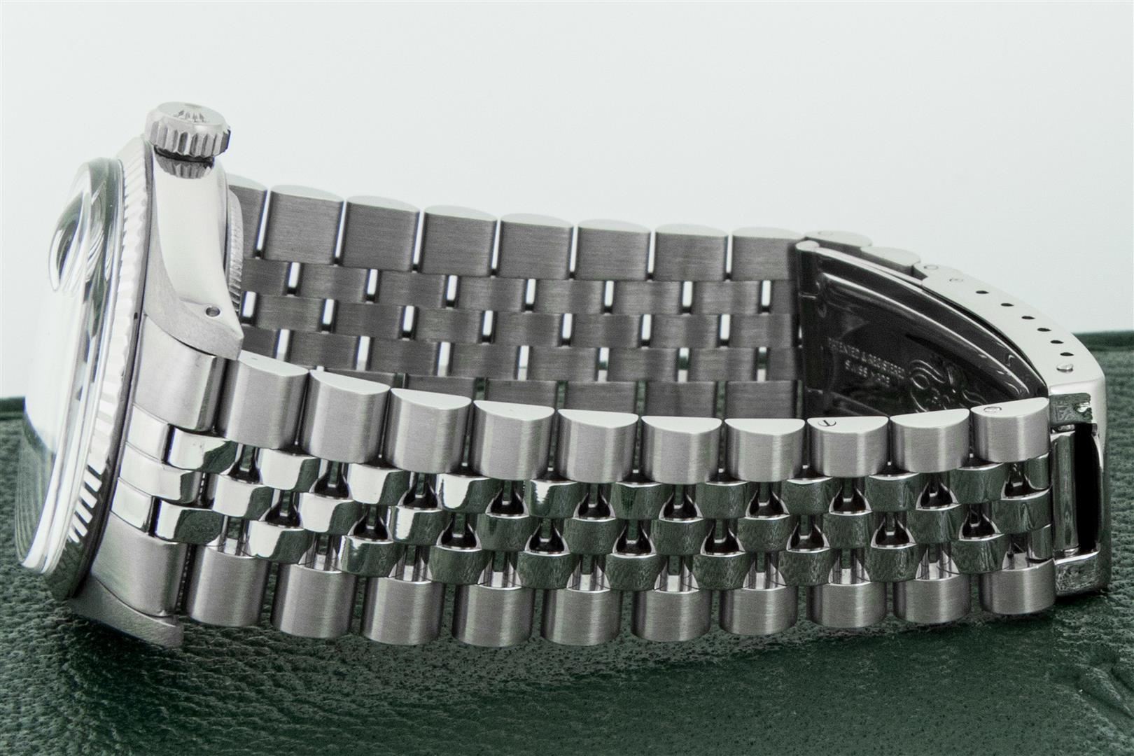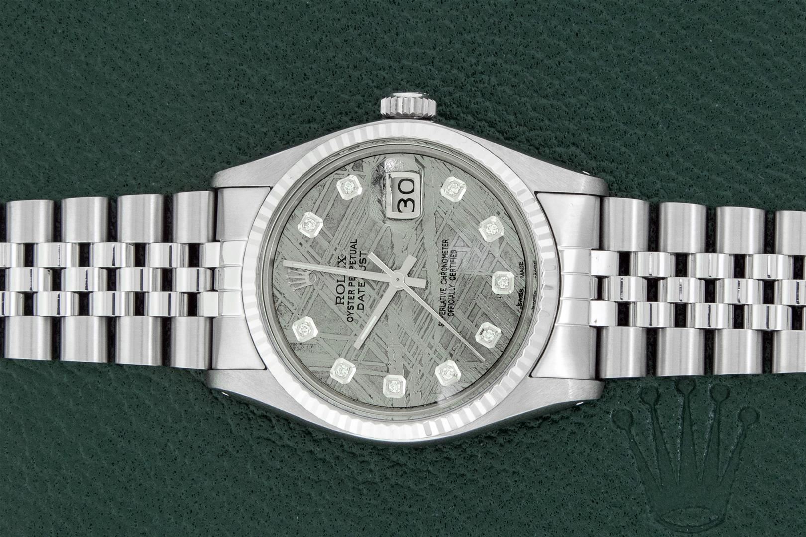 One Men's Pre Owned Stainless Steel Rolex Datejust Polished Bright with Satin Finish, This Watch Has Been Serviced & Electronically Tested, Rolex Stainless Steel Case: 36mm, Rolex Stainless Steel Crown, Rolex Bezel: White Gold Fluted Bezel. Custom Crystal: New Acrylic With Magnified Date. Custom Hands: New Luminescent Hands. Rolex Movement: Automatic Winding Movement. Custom Dial: Custom Meteorite Diamond Dial With Added Diamond Hour Markers, Diamond Count: 10 Diamonds in Dial, G To H In Color, SI-VS Clarity. Date Window: 3 O'clock Position Date Display, Quickset, Model: Datejust, Condition: G-6 Extra Fine. Rolex Bracelet: Stainless Steel Jubilee Band. Bright Polish & Satin Finish. 7.0 Inch Length, Adjustable. Standard Clasp, With Rolex Logo. This Pre Owned Watch Has Been Serviced Time Tested And Is In Excellent Condition It Is Free Of All Scratches And Dents. This Watch Comes With A Rolex Box.