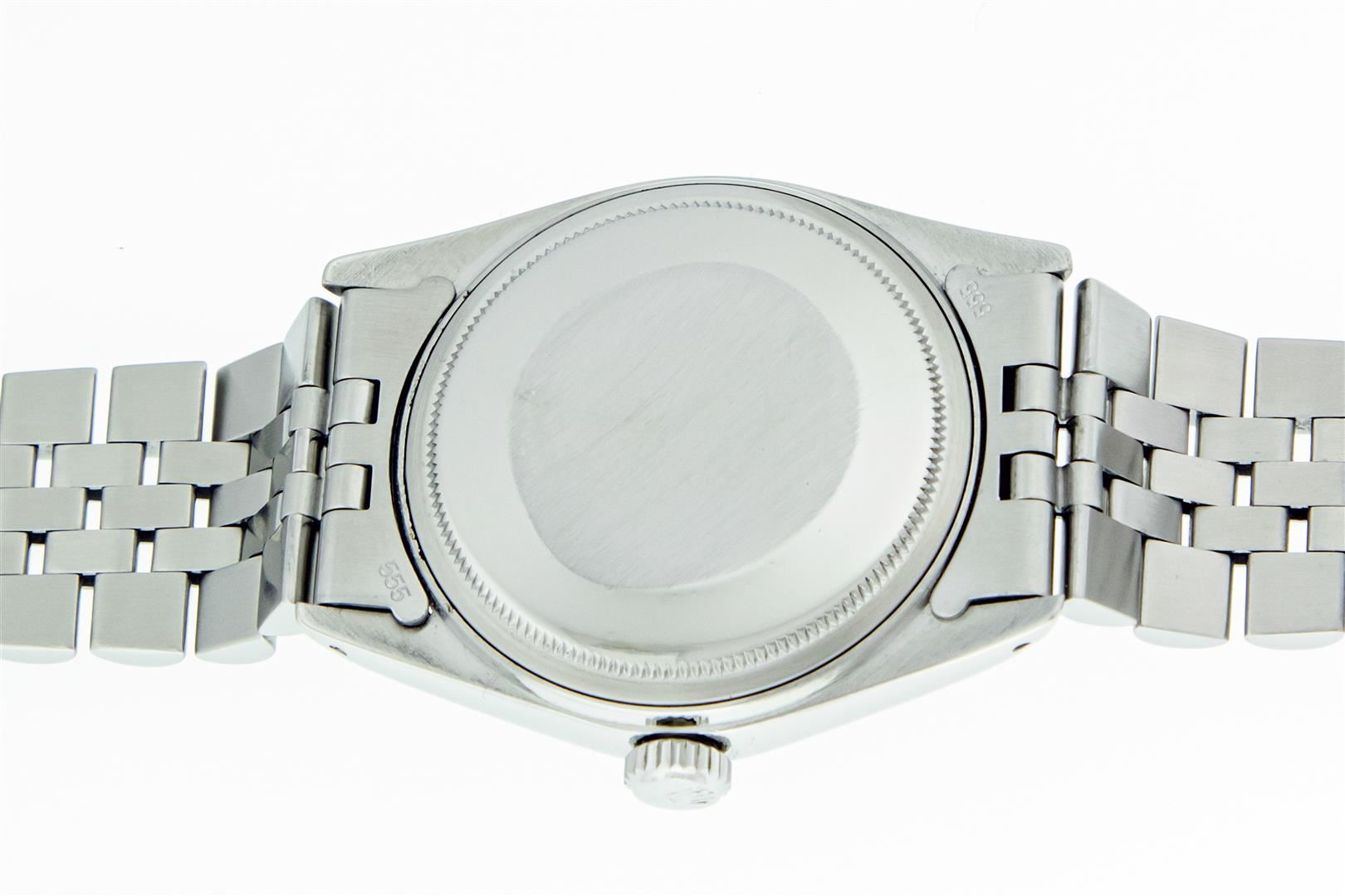 One Men's Pre Owned Stainless Steel Rolex Datejust Polished Bright with Satin Finish. This Watch Has Been Serviced & Electronically Tested, Rolex Stainless Steel Case: 36mm, Rolex Stainless Steel Crown, Rolex Bezel: Rolex White Gold Fluted Bezel. Custom Crystal: New Acrylic With Magnified Date Window. Custom Hands: New Luminescent Hands. Rolex Movement: Automatic Winding Rolex Movement. Custom Dial: Meteorite Diamond Dial With Added Diamond Hour Markers, Diamond Count: 8 Diamonds + 2 Diamond Baguettes in Dial G To H In Color, SI-VS Clarity. Date Window: 3 O'clock Position Date Display, Quickset, Model: Datejust, Condition: G-6 Extra Fine. Rolex Bracelet: Stainless Steel Jubilee Band. Bright Polish & Satin Finish. 7.0 Inch Length, Adjustable. Standard Clasp, With Rolex Logo. This Pre Owned Watch Has Been Serviced Time Tested And Is In Excellent Condition It Is Free Of All Scratches And Dents.