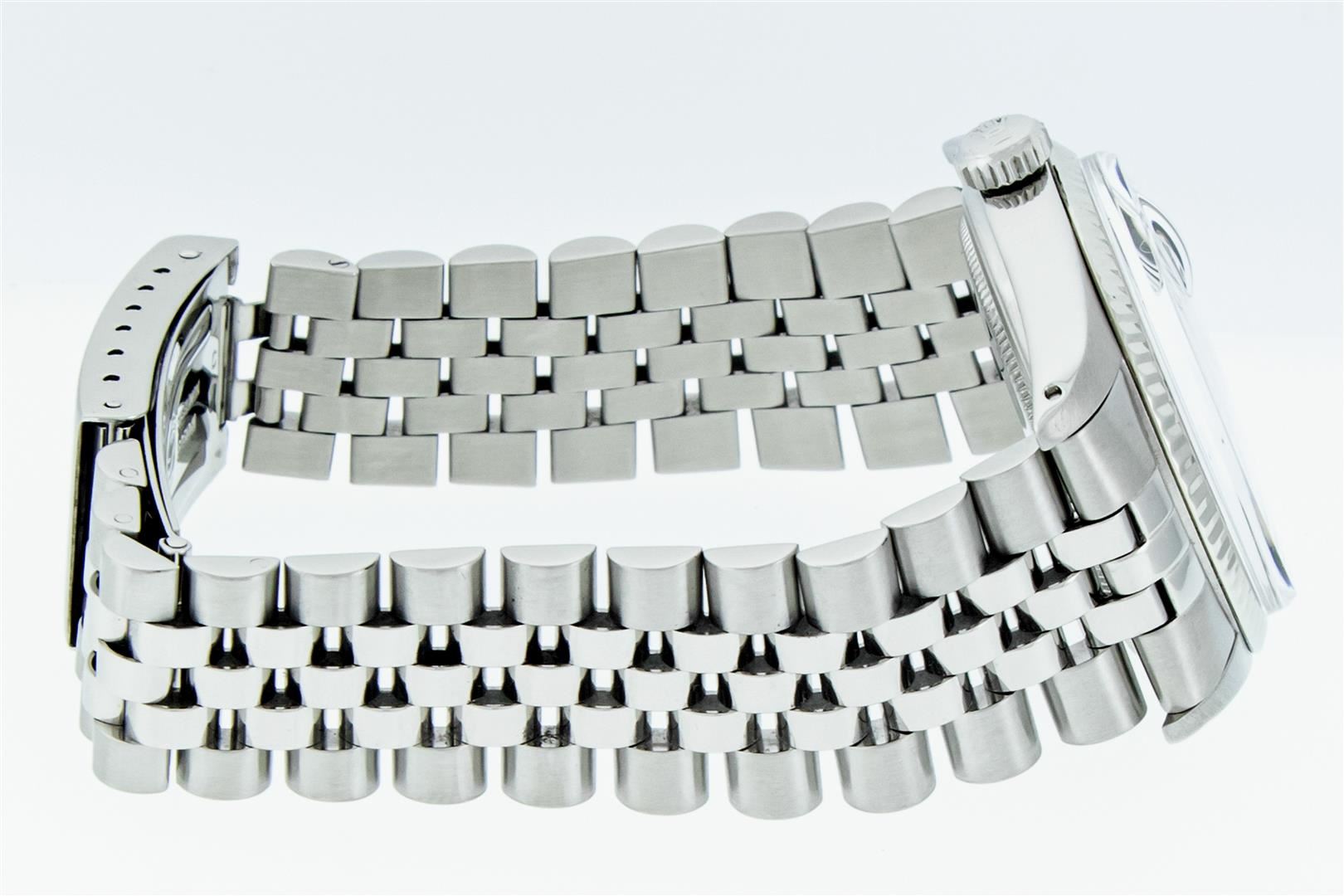 One Men's Pre Owned Stainless Steel Rolex Datejust Polished Bright with Satin Finish. This Watch Has Been Serviced & Electronically Tested, Rolex Stainless Steel Case: 36mm, Rolex Stainless Steel Crown, Rolex Bezel: Rolex White Gold Fluted Bezel. Custom Crystal: New Acrylic With Magnified Date Window. Custom Hands: New Luminescent Hands. Rolex Movement: Automatic Winding Rolex Movement. Custom Dial: Meteorite Diamond Dial With Added Diamond Hour Markers, Diamond Count: 8 Diamonds + 2 Diamond Baguettes in Dial G To H In Color, SI-VS Clarity. Date Window: 3 O'clock Position Date Display, Quickset, Model: Datejust, Condition: G-6 Extra Fine. Rolex Bracelet: Stainless Steel Jubilee Band. Bright Polish & Satin Finish. 7.0 Inch Length, Adjustable. Standard Clasp, With Rolex Logo. This Pre Owned Watch Has Been Serviced Time Tested And Is In Excellent Condition It Is Free Of All Scratches And Dents.