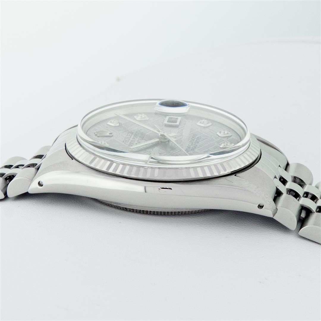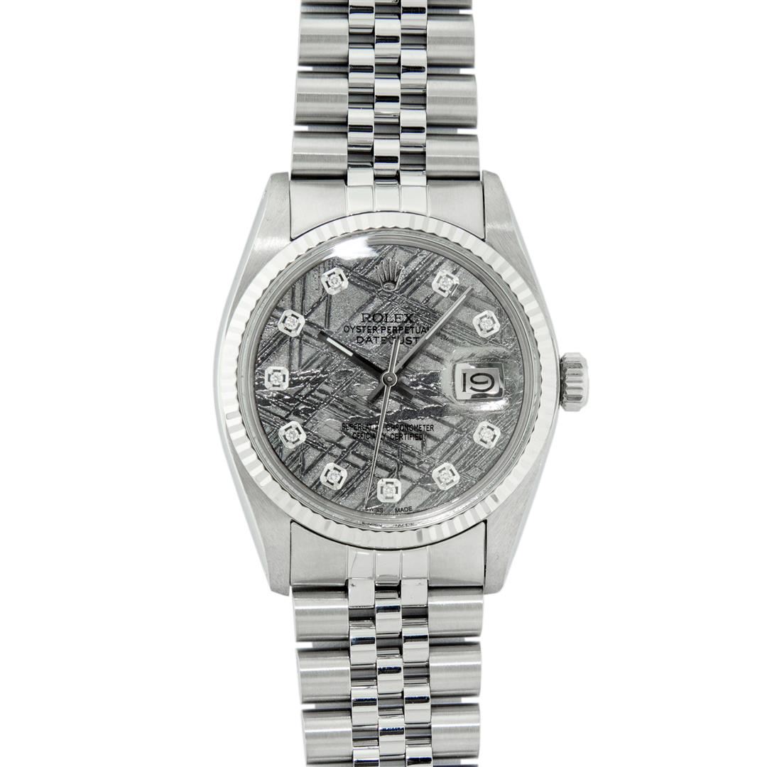 One Men's Stainless Steel Rolex Datejust Polished Bright with Satin Finish, This Watch Has Been Serviced & Electronically Tested, Stainless Steel Case: 36mm, Stainless Steel Crown, Original Bezel: 14K White Gold Fluted Bezel. Custom Crystal: New Acrylic Cyclops Lens. Custom Hands: New Luminescent Hands. Movement: Automatic Winding Movement. Custom Dial: Meteorite Diamond Dial With Diamond Hour Markers, Diamond Count: 10 Diamonds in Dial, G To H In Color, SI-VS Clarity. Date Window: 3 O'clock Position Date Display, Quickset, Model: Datejust, Condition: G-6 Extra Fine. Bracelet: Stainless Steel Jubilee. Bright Polish & Satin Finish. 7.0 Inch Length, Adjustable. Standard Clasp, With Rolex Logo. This Watch Has Been Serviced Time Tested And Is In Excellent Condition It Is Free Of All Scratches And Dents.