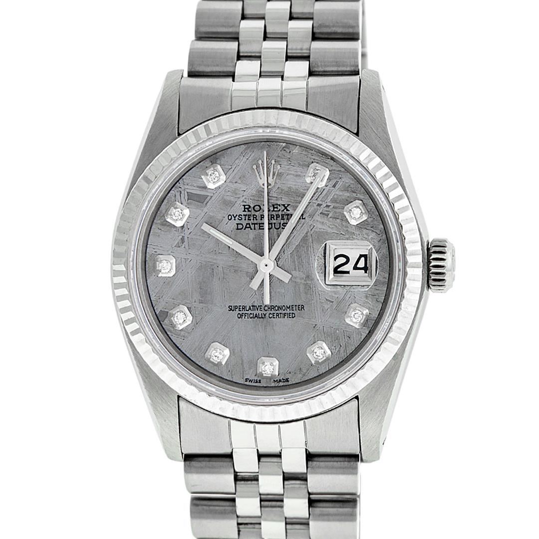 One Men's Pre Owned Stainless Steel Rolex Datejust Polished Bright with Satin Finish, This Watch Has Been Serviced & Electronically Tested, Rolex Stainless Steel Case: 36mm, Rolex Stainless Steel Crown, Original Rolex Bezel: White Gold Fluted Bezel. Custom Crystal: New Acrylic Cyclops Lens. Custom Hands: New Luminescent Hands. Rolex Movement: Automatic Winding Movement. Custom Dial: Custom Meteorite Diamond Dial With Added Diamond Hour Markers, Diamond Count: 10 Diamonds in Dial, G To H In Color, SI-VS Clarity. Date Window: 3 O'Clock Position Date Display, Quickset, Model: Datejust, Condition: G-6 Extra Fine. Rolex Bracelet: Stainless Steel Jubilee Band. Bright Polish & Satin Finish. 7.0 Inch Length, Adjustable. Standard Clasp, With Rolex Logo. This Watch Has Been Serviced Time Tested And Is In Excellent Condition It Is Free Of All Scratches And Dents.