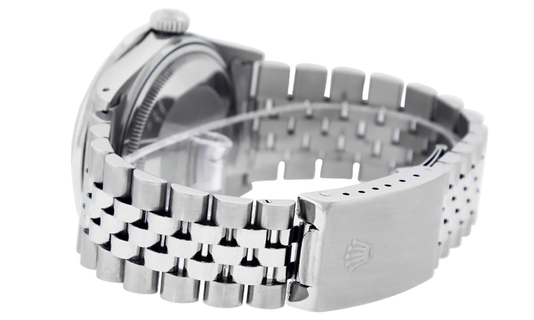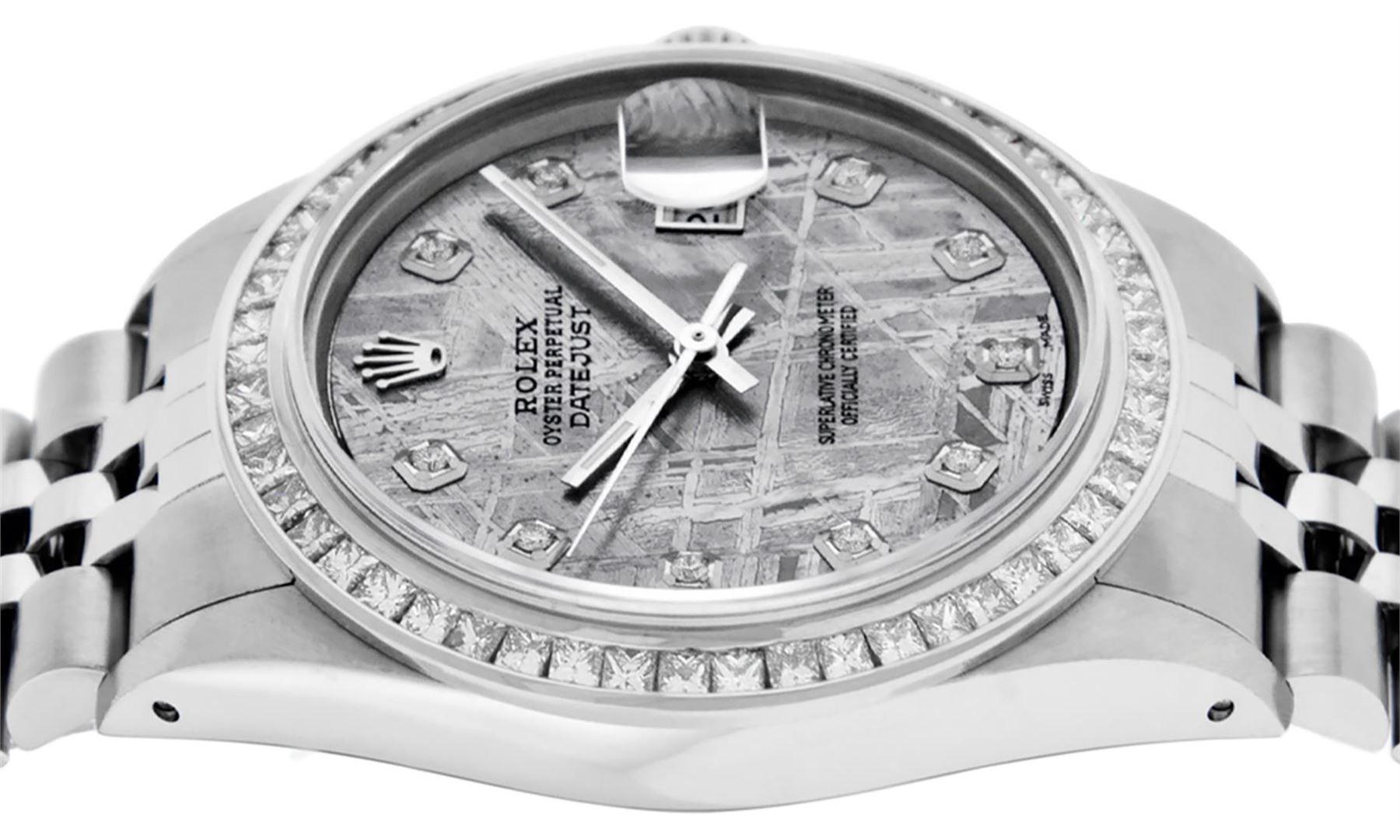 One Men's Stainless Steel Rolex Datejust Polished Bright with Satin Finish, Fully Serviced & Electronically Tested, Stainless Steel Case: 36mm, Stainless Steel Crown, Custom Bezel: New 14K White Gold 2.75 Carat Princess Cut Diamond Bezel, Diamond Count: 53 Diamonds, Total Weight 2.75 Carat, Clarity: SI-VS, Color: G to H. Custom Crystal: New Synthetic Sapphire Cyclops Lens. Custom Hands: New Luminescent Hands. Movement: Automatic Winding Movement Caliber 3035. Custom Dial: Meteorite Diamond Dial, 10 Diamonds in Dial, G To H In Color, Clarity: SI-VS. Date Window: 3 O'clock Position Date Display, Quickset, Model: Datejust 36mm, Condition: G-6 Extra Fine. Bracelet: Rolex Stainless Steel Jubilee Band. Bright Polish & Satin Finish. 7.0 Inch Length, Adjustable. Standard Clasp, With Rolex Logo. Watch Has Been Serviced And Polished It Is Free Of All Scratches And Dents.