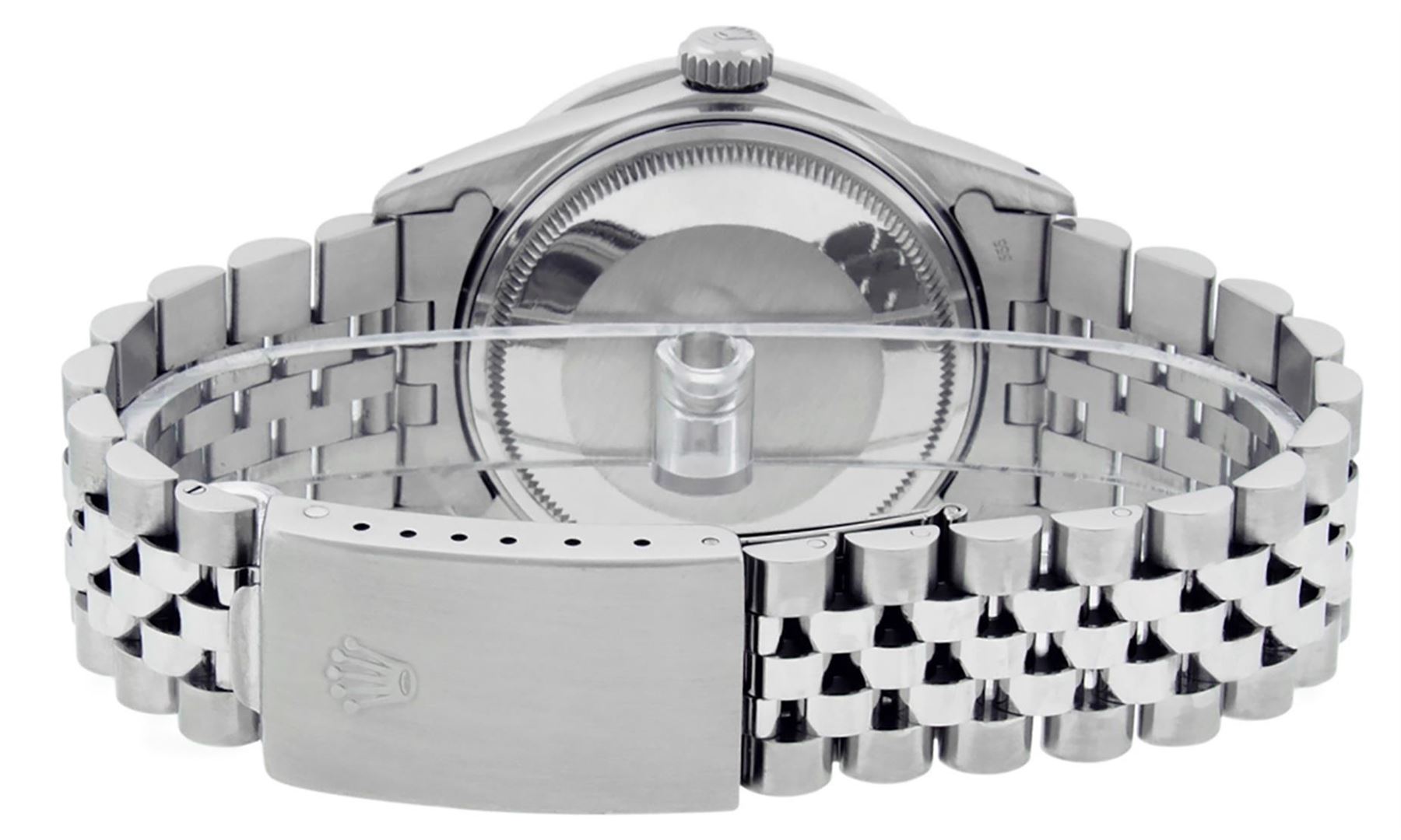 One Men's Stainless Steel Rolex Datejust Polished Bright with Satin Finish, Fully Serviced & Electronically Tested, Stainless Steel Case: 36mm, Stainless Steel Crown, Custom Bezel: New 14K White Gold 2.75 Carat Princess Cut Diamond Bezel, Diamond Count: 53 Diamonds, Total Weight 2.75 Carat, Clarity: SI-VS, Color: G to H. Custom Crystal: New Synthetic Sapphire Cyclops Lens. Custom Hands: New Luminescent Hands. Movement: Automatic Winding Movement Caliber 3035. Custom Dial: Meteorite Diamond Dial, 10 Diamonds in Dial, G To H In Color, Clarity: SI-VS. Date Window: 3 O'clock Position Date Display, Quickset, Model: Datejust 36mm, Condition: G-6 Extra Fine. Bracelet: Rolex Stainless Steel Jubilee Band. Bright Polish & Satin Finish. 7.0 Inch Length, Adjustable. Standard Clasp, With Rolex Logo. Watch Has Been Serviced And Polished It Is Free Of All Scratches And Dents.