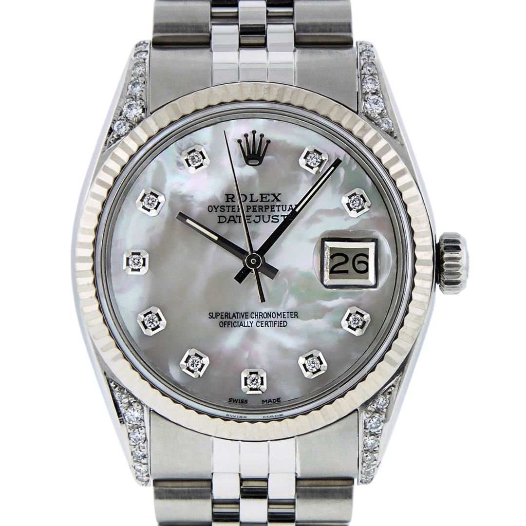 One Men's Pre Owned Stainless Steel Rolex Datejust Polished Bright with Satin Finish, Serviced & Electronically Tested, Rolex Stainless Steel Case: 36mm, Custom Diamond Lugs: 24 Added Diamonds On Lugs, Color: G to H, Clarity: SI-VS. Rolex Stainless Steel Crown, Rolex Bezel: 14K White Gold Fluted Bezel. Custom Crystal: New Acrylic Cyclops Lens. Rolex Movement: Automatic Winding Movement. Custom Dial: Refinished To Mother Of Pearl With Added Diamonds, Diamond Color: G To H In Color, Clarity: SI-VS. Date Window: 3 O'Clock Position Date Display, Quickset, Model: Quickset Datejust, Condition: G-6 Extra Fine. Rolex Bracelet: Stainless Steel Jubilee Band. Bright Polish & Satin Finish. 7.0 Inch Length, Adjustable. Standard Clasp, With Rolex Logo. This Watch Has Been Serviced Time Tested And Is In Excellent Condition It Is Free Of All Scratches And Dents.