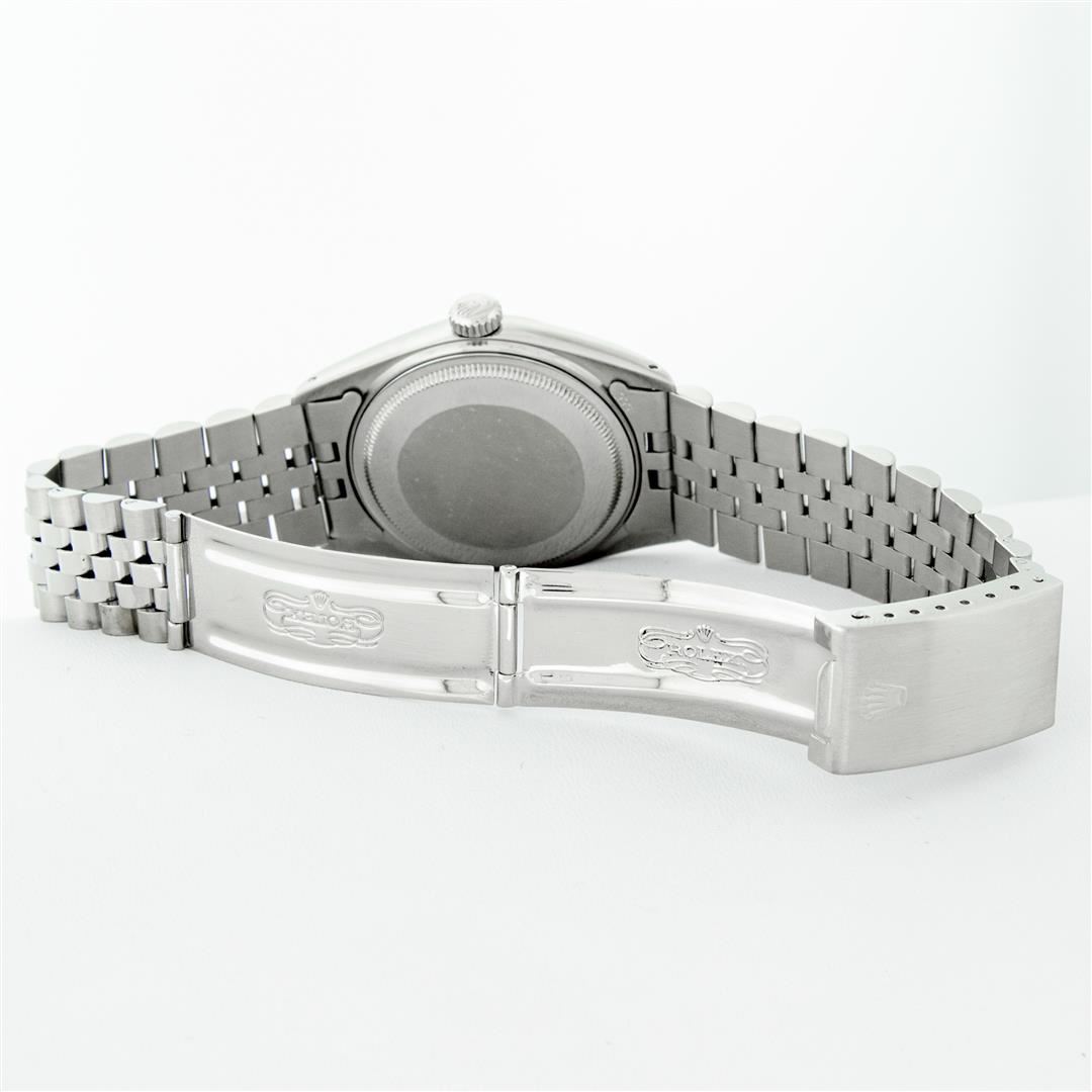 One Men's Pre Owned Stainless Steel Rolex Datejust Polished Bright with Satin Finish, This Watch Has Been Serviced & Electronically Tested, Rolex Stainless Steel Case: 36mm, Rolex Stainless Steel Crown, Rolex Bezel: 14K White Gold Fluted Bezel. Custom Crystal: New Acrylic Cyclops Lens. Custom Hands: New Luminescent Hands. Rolex Movement: Automatic Winding Movement. Custom Dial: Dial Refinished To Mother Of Pearl Diamond Dial With Custom Added Diamond Hour Markers, Diamond Count: 10 Diamonds in Dial G To H In Color, SI-VS Clarity. Date Window: 3 O'Clock Position Date Display, Quickset, Model: Datejust, Condition: G-6 Extra Fine. Rolex Bracelet: Stainless Steel Jubilee Band. Bright Polish & Satin Finish. 7.0 Inch Length, Adjustable. Standard Clasp, With Rolex Logo. This Watch Has Been Serviced Time Tested And Is In Excellent Condition It Is Free Of All Scratches And Dents.