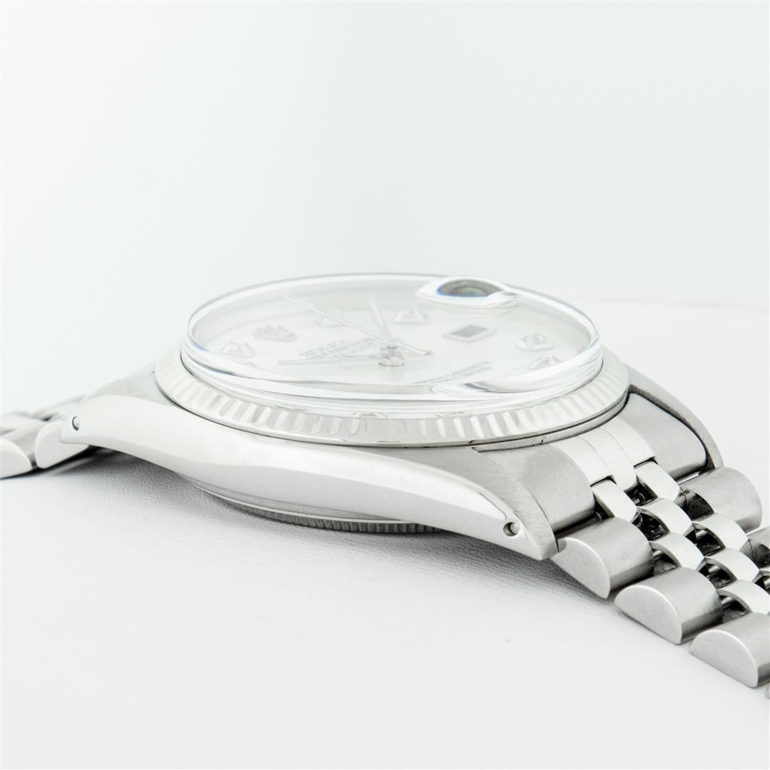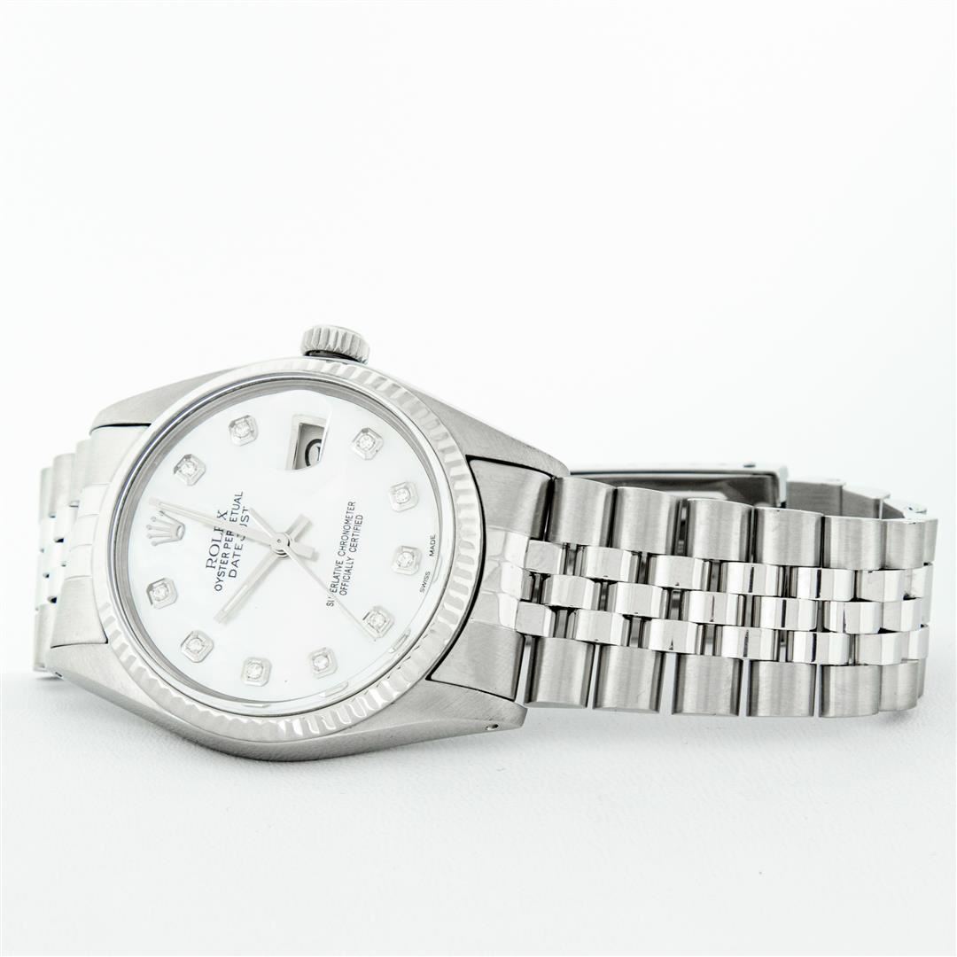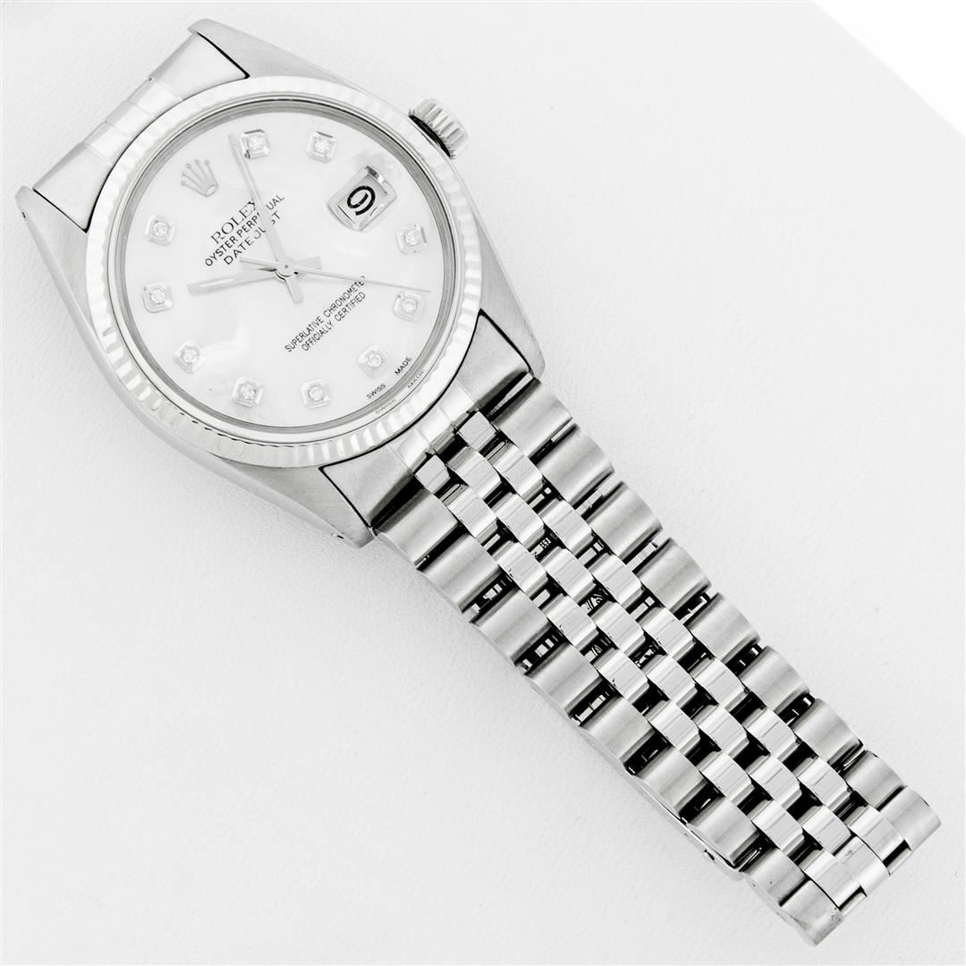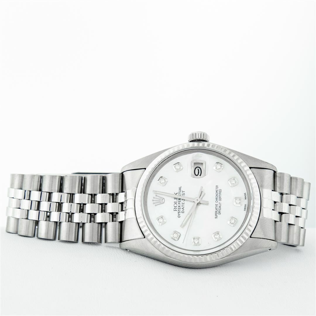 One Men's Pre Owned Stainless Steel Rolex Datejust Polished Bright with Satin Finish, This Watch Has Been Serviced & Electronically Tested, Rolex Stainless Steel Case: 36mm, Rolex Stainless Steel Crown, Rolex Bezel: 14K White Gold Fluted Bezel. Custom Crystal: New Acrylic Cyclops Lens. Custom Hands: New Luminescent Hands. Rolex Movement: Automatic Winding Movement. Custom Dial: Dial Refinished To Mother Of Pearl Diamond Dial With Custom Added Diamond Hour Markers, Diamond Count: 10 Diamonds in Dial G To H In Color, SI-VS Clarity. Date Window: 3 O'Clock Position Date Display, Quickset, Model: Datejust, Condition: G-6 Extra Fine. Rolex Bracelet: Stainless Steel Jubilee Band. Bright Polish & Satin Finish. 7.0 Inch Length, Adjustable. Standard Clasp, With Rolex Logo. This Watch Has Been Serviced Time Tested And Is In Excellent Condition It Is Free Of All Scratches And Dents.