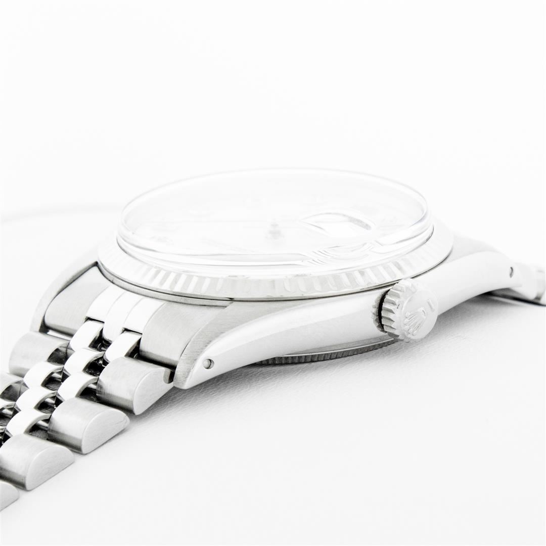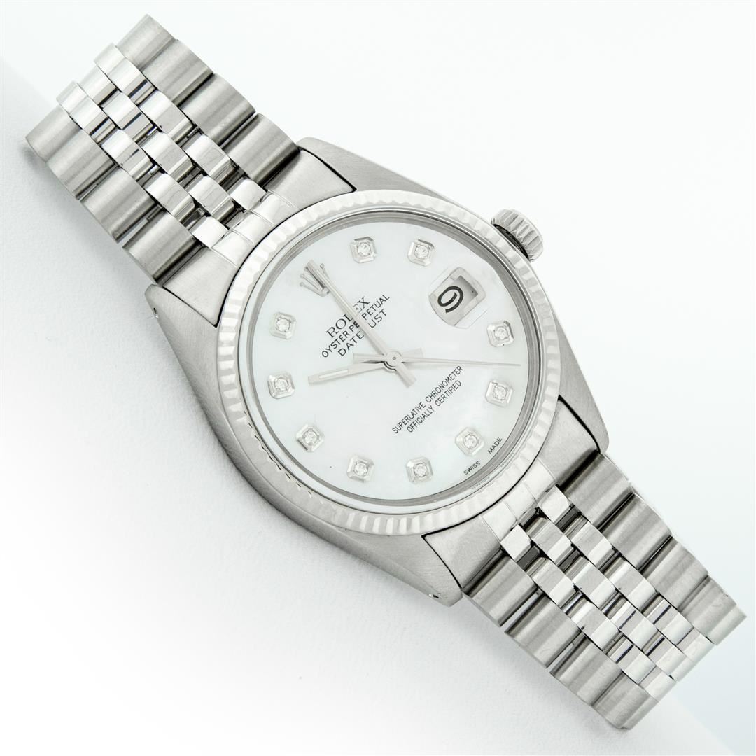 One Men's Pre Owned Stainless Steel Rolex Datejust Polished Bright with Satin Finish, This Watch Has Been Serviced & Electronically Tested, Rolex Stainless Steel Case: 36mm, Rolex Stainless Steel Crown, Rolex Bezel: 14K White Gold Fluted Bezel. Custom Crystal: New Acrylic Cyclops Lens. Custom Hands: New Luminescent Hands. Rolex Movement: Automatic Winding Movement. Custom Dial: Dial Refinished To Mother Of Pearl Diamond Dial With Custom Added Diamond Hour Markers, Diamond Count: 10 Diamonds in Dial G To H In Color, SI-VS Clarity. Date Window: 3 O'Clock Position Date Display, Quickset, Model: Datejust, Condition: G-6 Extra Fine. Rolex Bracelet: Stainless Steel Jubilee Band. Bright Polish & Satin Finish. 7.0 Inch Length, Adjustable. Standard Clasp, With Rolex Logo. This Watch Has Been Serviced Time Tested And Is In Excellent Condition It Is Free Of All Scratches And Dents.
