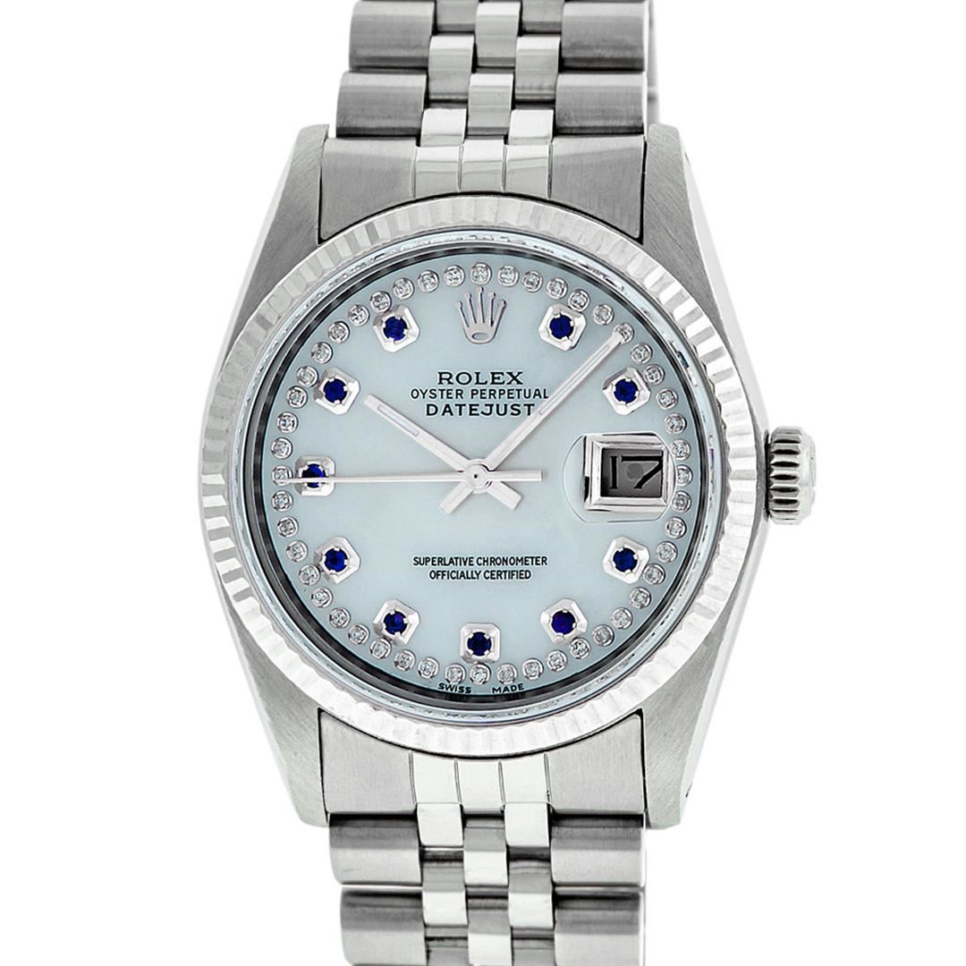 One Men's Stainless Steel Rolex Datejust Polished Bright with Satin Finish, Serviced & Electronically Tested, Stainless Steel Case: 36mm, Stainless Steel Crown, Bezel: 14K White Gold Fluted Bezel. Custom Crystal: New Acrylic Cyclops Lens. Custom Hands: New Luminescent Hands. Movement: Automatic Winding Movement Caliber 3035. Custom Dial: Mother Of Pearl Sapphire String Diamond Dial, Stone Count: 10 Sapphires + 48 Diamonds in Dial, G To H In Color, SI-VS Clarity. Date Window: 3 O'clock Position Date Display, Quickset, Model: Datejust, Condition: G-6 Extra Fine. Bracelet: Stainless Steel Jubilee. Bright Polish & Satin Finish. 7.0 Inch Length, Adjustable. Standard Clasp, With Rolex Logo. Watch Has Been Serviced And Polished It Is Free Of All Scratches And Dents.