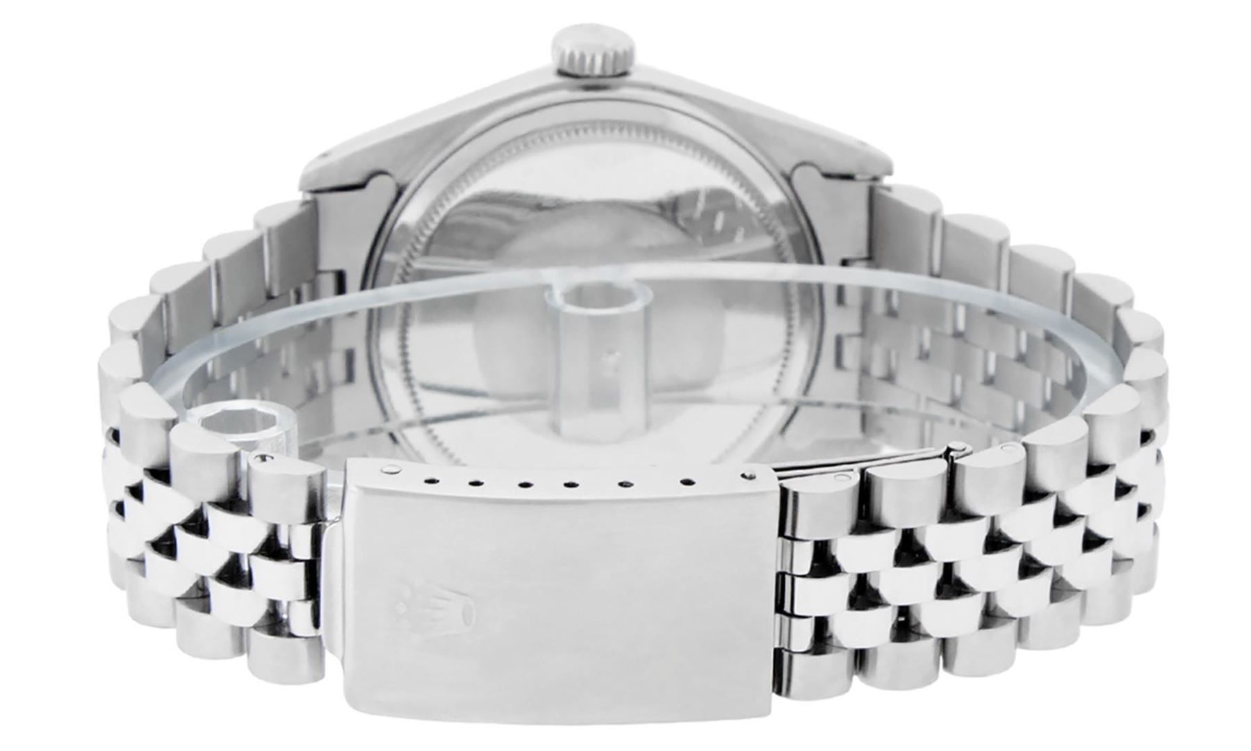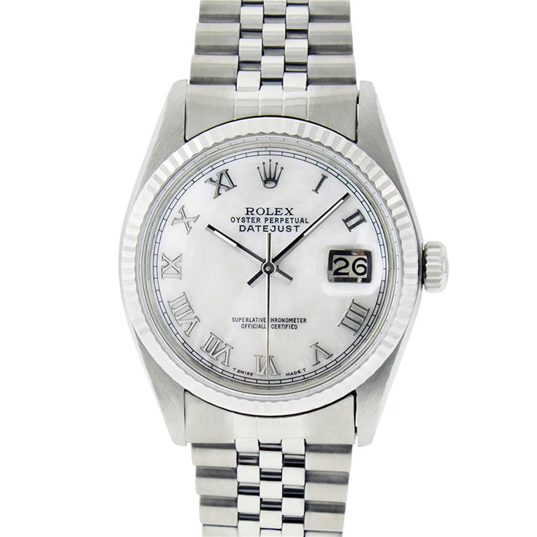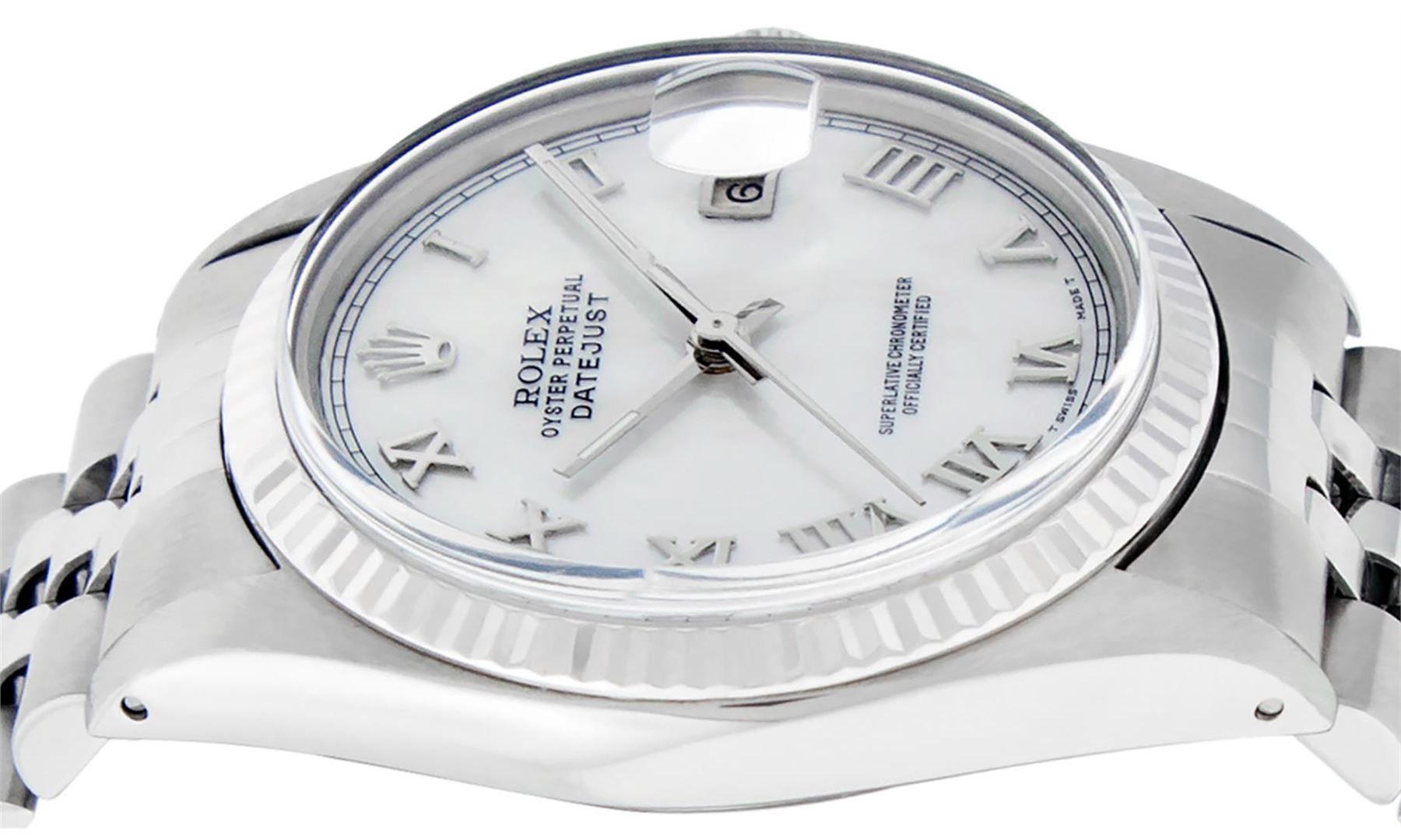 One Men's Stainless Steel Rolex Datejust Polished Bright with Satin Finish, Serviced & Electronically Tested, Stainless Steel Case: 36mm, Stainless Steel Crown, Bezel: 14K White Gold Fluted Bezel. Custom Crystal: New Acrylic Cyclops Lens. Custom Hands: New Luminescent Hands. Movement: Automatic Winding Movement Caliber 3035. Custom Dial: Mother Of Pearl Roman Dial With Square Track. Date Window: 3 O'clock Position Date Display, Quickset, Model: Datejust, Condition: G-6 Extra Fine. Bracelet: Stainless Steel Jubilee. Bright Polish & Satin Finish. 7.0 Inch Length, Adjustable. Standard Clasp, With Rolex Logo. Watch Has Been Serviced And Polished It Is Free Of All Scratches And Dents.