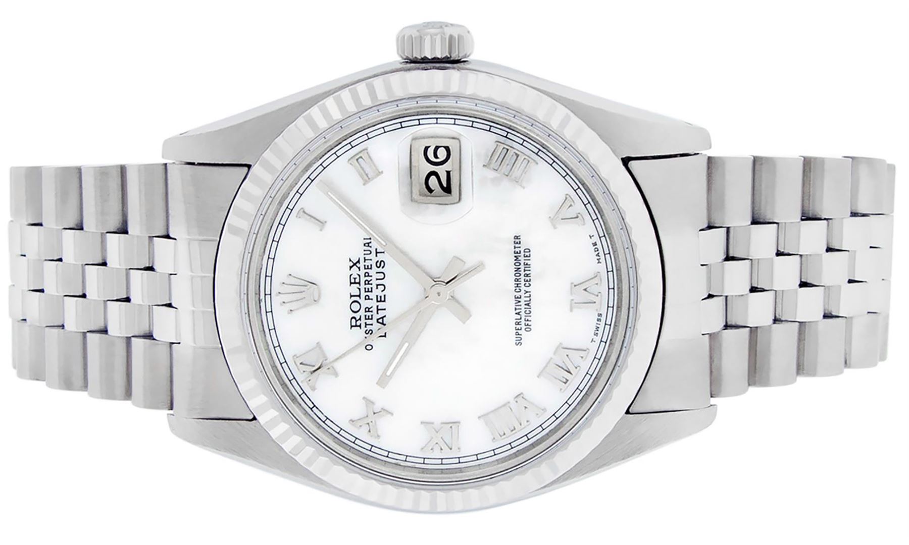 One Men's Stainless Steel Rolex Datejust Polished Bright with Satin Finish, Serviced & Electronically Tested, Stainless Steel Case: 36mm, Stainless Steel Crown, Bezel: 14K White Gold Fluted Bezel. Custom Crystal: New Acrylic Cyclops Lens. Custom Hands: New Luminescent Hands. Movement: Automatic Winding Movement Caliber 3035. Custom Dial: Mother Of Pearl Roman Dial With Square Track. Date Window: 3 O'clock Position Date Display, Quickset, Model: Datejust, Condition: G-6 Extra Fine. Bracelet: Stainless Steel Jubilee. Bright Polish & Satin Finish. 7.0 Inch Length, Adjustable. Standard Clasp, With Rolex Logo. Watch Has Been Serviced And Polished It Is Free Of All Scratches And Dents.