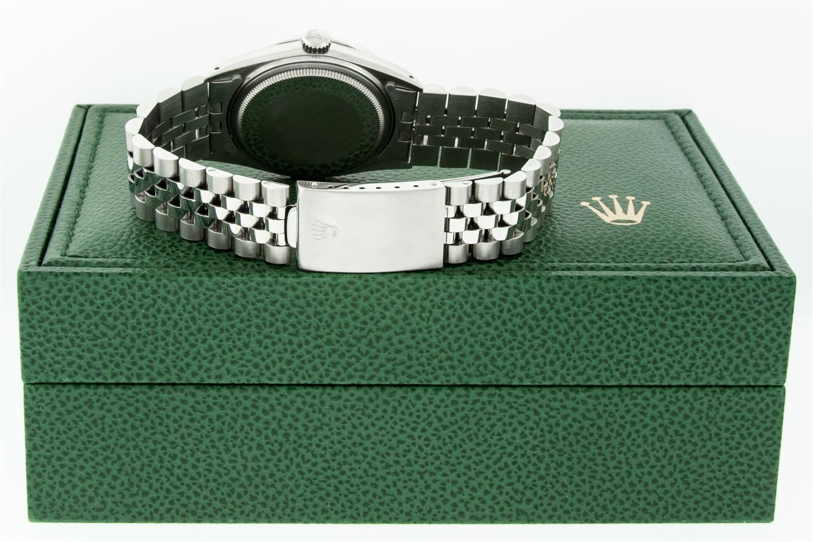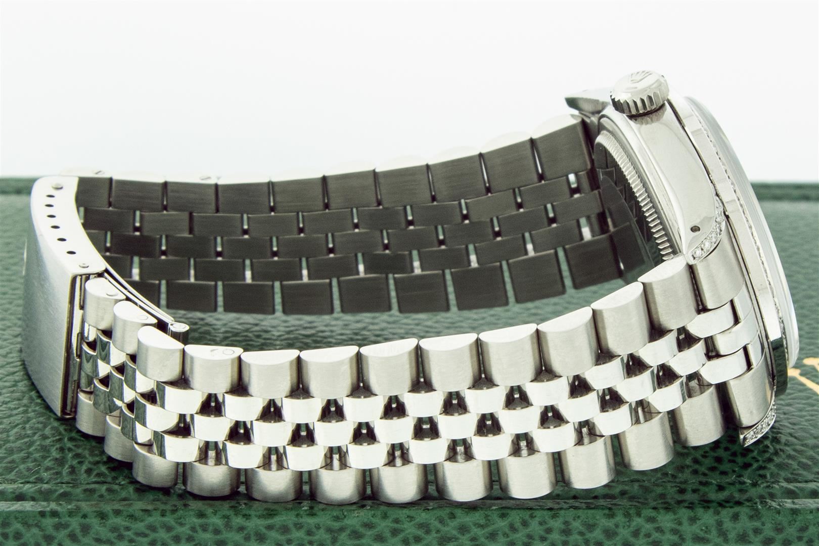 One Men's Rolex Datejust Polished Bright with Satin Finish, Serviced & Electronically Tested, Stainless Steel Case: 36mm, Custom Diamond Lugs: 28 Diamonds In Lugs, Color: G to H, Clarity: SI-VS. Rolex Stainless Steel Crown, Custom Bezel: New 18K White Gold Diamond Beadset Bezel, Diamond Count: 44 Diamonds, Total Weight 1.00 Carat, Clarity: SI-VS, Color: G to H. Custom Crystal: New Sapphire With Magnified Date Window. Custom Hands: New Luminescent Hands. Rolex Movement: Automatic Winding Movement. Custom Dial: Mother Of Pearl String Single Cut Diamond Dial, Stone Count: 58 Diamonds In Dial, Diamond Color: G To H In Color, Clarity: VS. Date Window: 3 O'clock Position Date Display, Quickset, Model: Datejust Condition: G-6 Extra Fine. Rolex Bracelet: Stainless Steel Jubilee Band. Bright Polish & Satin Finish. 7.0 Inch Length, Adjustable. Standard Clasp, With Rolex Logo. This Pre Owned Watch Has Been Serviced And Polished And It's Free Of All Dents And Scratches. This Watch Comes With A Rolex Box.