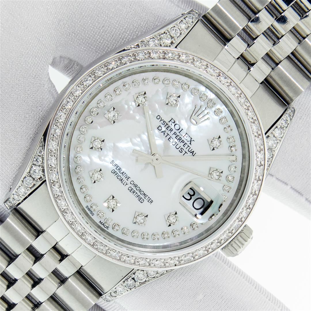 One Men's Rolex Datejust Polished Bright with Satin Finish, Serviced & Electronically Tested, Stainless Steel Case: 36mm, Custom Diamond Lugs: 28 Diamonds In Lugs, Color: G to H, Clarity: SI-VS. Rolex Stainless Steel Crown, Custom Bezel: New 18K White Gold Diamond Beadset Bezel, Diamond Count: 44 Diamonds, Total Weight 1.00 Carat, Clarity: SI-VS, Color: G to H. Custom Crystal: New Sapphire With Magnified Date Window. Custom Hands: New Luminescent Hands. Rolex Movement: Automatic Winding Movement. Custom Dial: Mother Of Pearl String Single Cut Diamond Dial, Stone Count: 58 Diamonds In Dial, Diamond Color: G To H In Color, Clarity: VS. Date Window: 3 O'clock Position Date Display, Quickset, Model: Datejust Condition: G-6 Extra Fine. Rolex Bracelet: Stainless Steel Jubilee Band. Bright Polish & Satin Finish. 7.0 Inch Length, Adjustable. Standard Clasp, With Rolex Logo. This Pre Owned Watch Has Been Serviced And Polished And It's Free Of All Dents And Scratches. This Watch Comes With A Rolex Box.