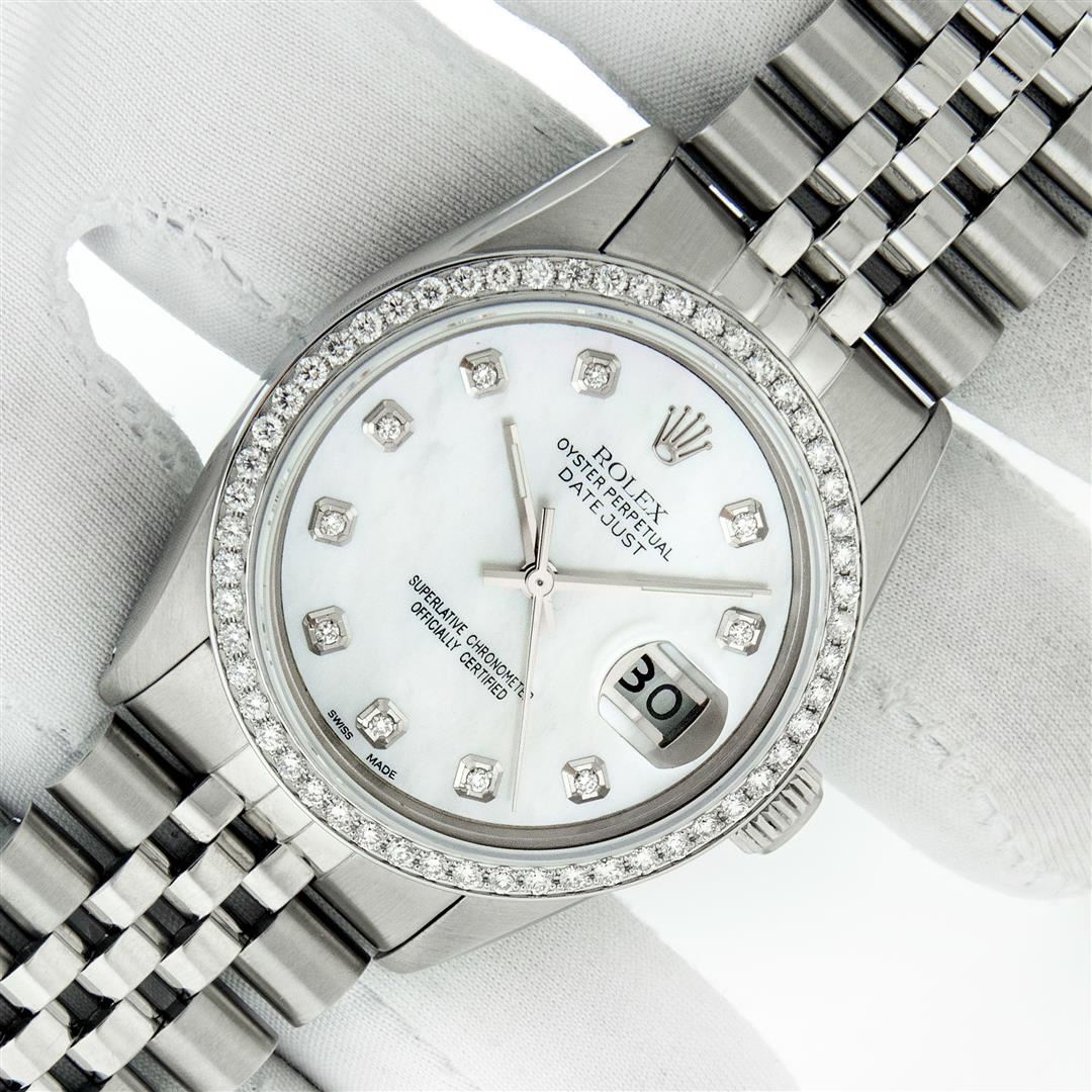 One Men's Rolex Stainless Steel Datejust Polished Bright with Satin Finish, This Watch Has Been Serviced & Electronically Tested, Rolex Stainless Steel Case: 36mm, Rolex Stainless Steel Crown, Custom Bezel: New Stainless Steel Beadset Diamond Bezel, Diamond Count: 54 Diamonds In Bezel, Total Weight 1.00 Carat, Clarity: SI-VS, Color: G to H. Custom Crystal: New Sapphire With Magnified Date Window. Custom Hands: New Luminescent Hands. Rolex Movement: Automatic Winding Movement. Custom Dial: Mother Of Pearl Diamond Dial, Diamond Count: 10 Diamonds On Dial, Color: G to H, Clarity: VS2-SI1. Date Window: 3 O'clock Position Date Display, Quickset, Model: Datejust. Condition: G-6 Extra Fine. Rolex Bracelet: Stainless Steel Jubilee Band. Bright Polish & Satin Finish. 7.0 Inch Length, Adjustable. Standard Clasp, With Rolex Logo. This Pre Owned Watch Has Been Serviced Time Tested And Is In Excellent Condition It Is Free Of All Scratches And Dent. This Watch Comes With A Rolex Box.