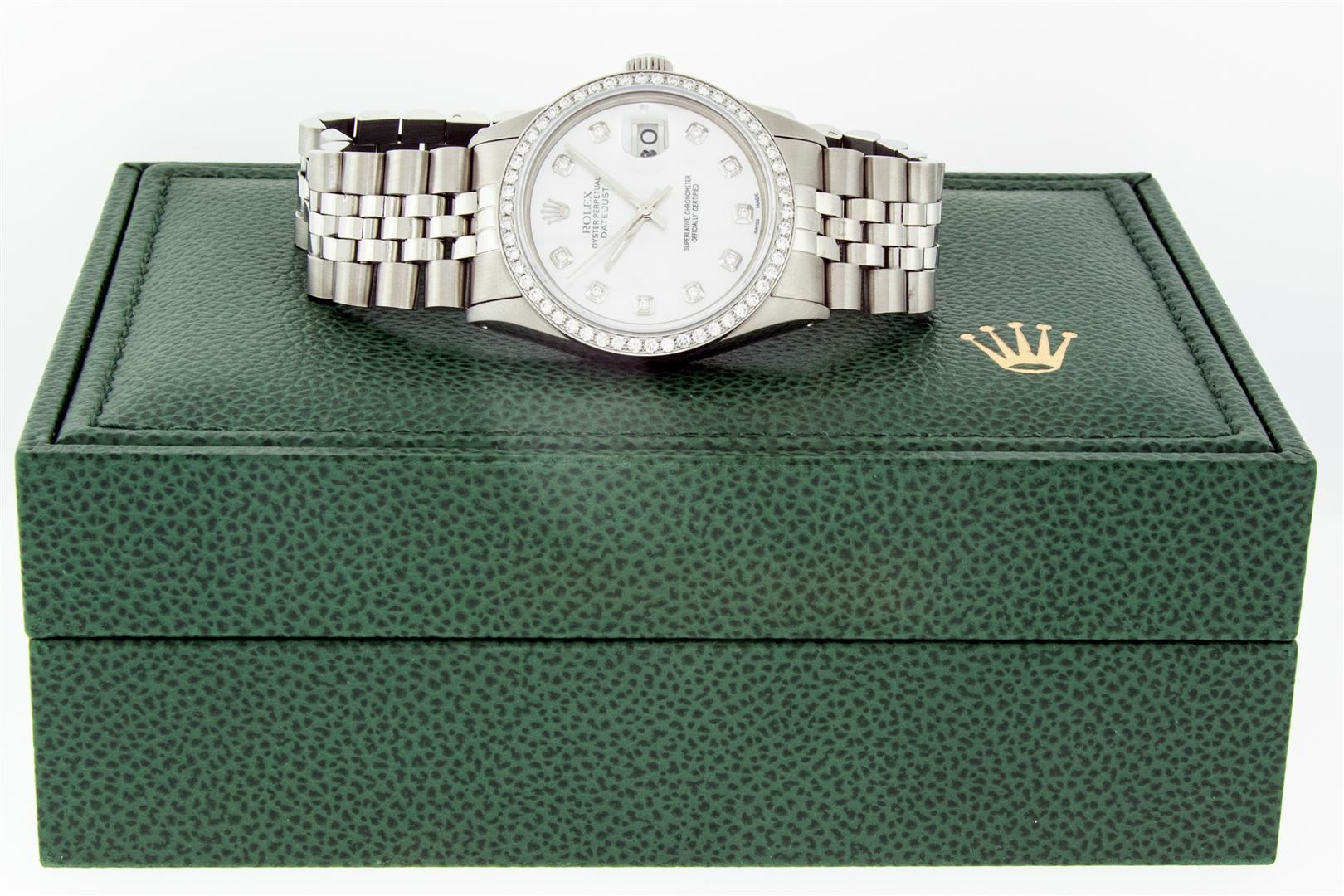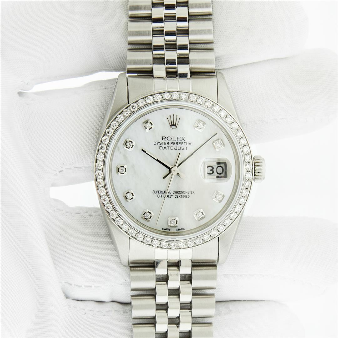 One Men's Rolex Stainless Steel Datejust Polished Bright with Satin Finish, This Watch Has Been Serviced & Electronically Tested, Rolex Stainless Steel Case: 36mm, Rolex Stainless Steel Crown, Custom Bezel: New Stainless Steel Beadset Diamond Bezel, Diamond Count: 54 Diamonds In Bezel, Total Weight 1.00 Carat, Clarity: SI-VS, Color: G to H. Custom Crystal: New Sapphire With Magnified Date Window. Custom Hands: New Luminescent Hands. Rolex Movement: Automatic Winding Movement. Custom Dial: Mother Of Pearl Diamond Dial, Diamond Count: 10 Diamonds On Dial, Color: G to H, Clarity: VS2-SI1. Date Window: 3 O'clock Position Date Display, Quickset, Model: Datejust. Condition: G-6 Extra Fine. Rolex Bracelet: Stainless Steel Jubilee Band. Bright Polish & Satin Finish. 7.0 Inch Length, Adjustable. Standard Clasp, With Rolex Logo. This Pre Owned Watch Has Been Serviced Time Tested And Is In Excellent Condition It Is Free Of All Scratches And Dent. This Watch Comes With A Rolex Box.