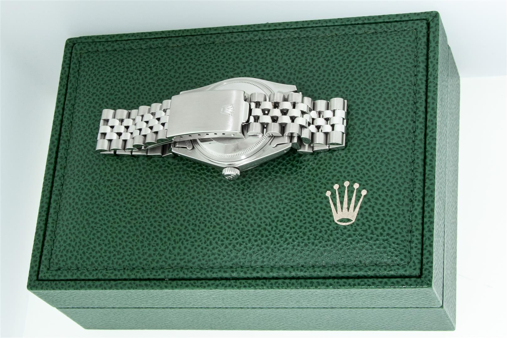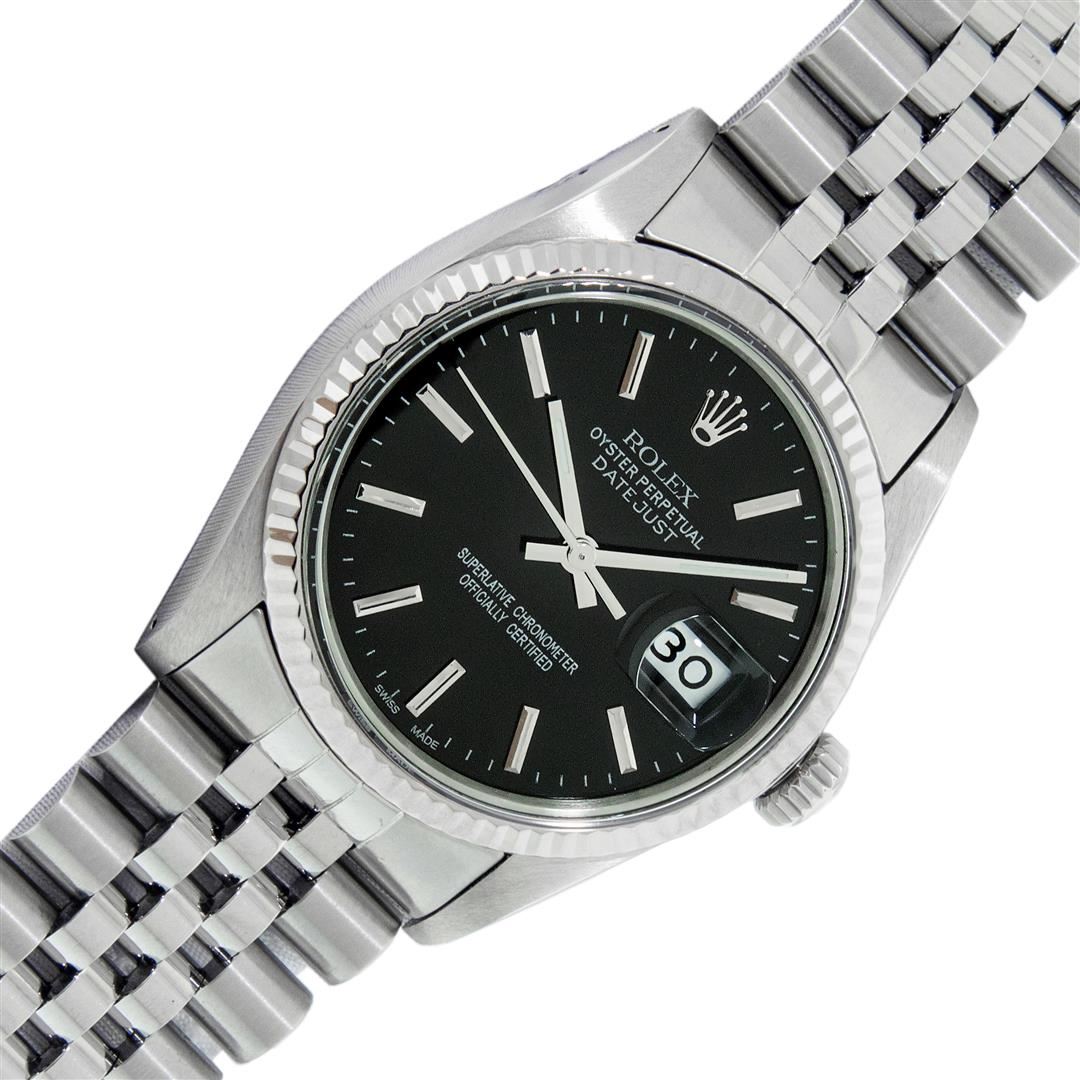 One Men's Pre Owned Rolex Datejust Polished, Serviced & Electronically Tested, Rolex Stainless Steel Case: 36mm, Rolex Stainless Steel Crown, Rolex Bezel: 14K White Gold Fluted Bezel. Custom Crystal: Acrylic Cyclops Lens. Custom Hands: New Luminescent Hands. Rolex Movement: Automatic Winding Movement. Custom Dial: Refinished To Black Dial With Index Hour Markers With Line Track. Date Window: 3 O'Clock Position Date Display, Quickset, Model: Datejust, Condition: G-6 Extra Fine. Rolex Bracelet: Stainless Steel Jubilee Band. Bright Polish & Satin Finish. 7.0 Inch Length, Adjustable. Standard Clasp, With Rolex Logo. Watch Has Been Serviced And Polished It Is Free Of All Scratches And Dents. This Watch Comes With A Rolex Box.