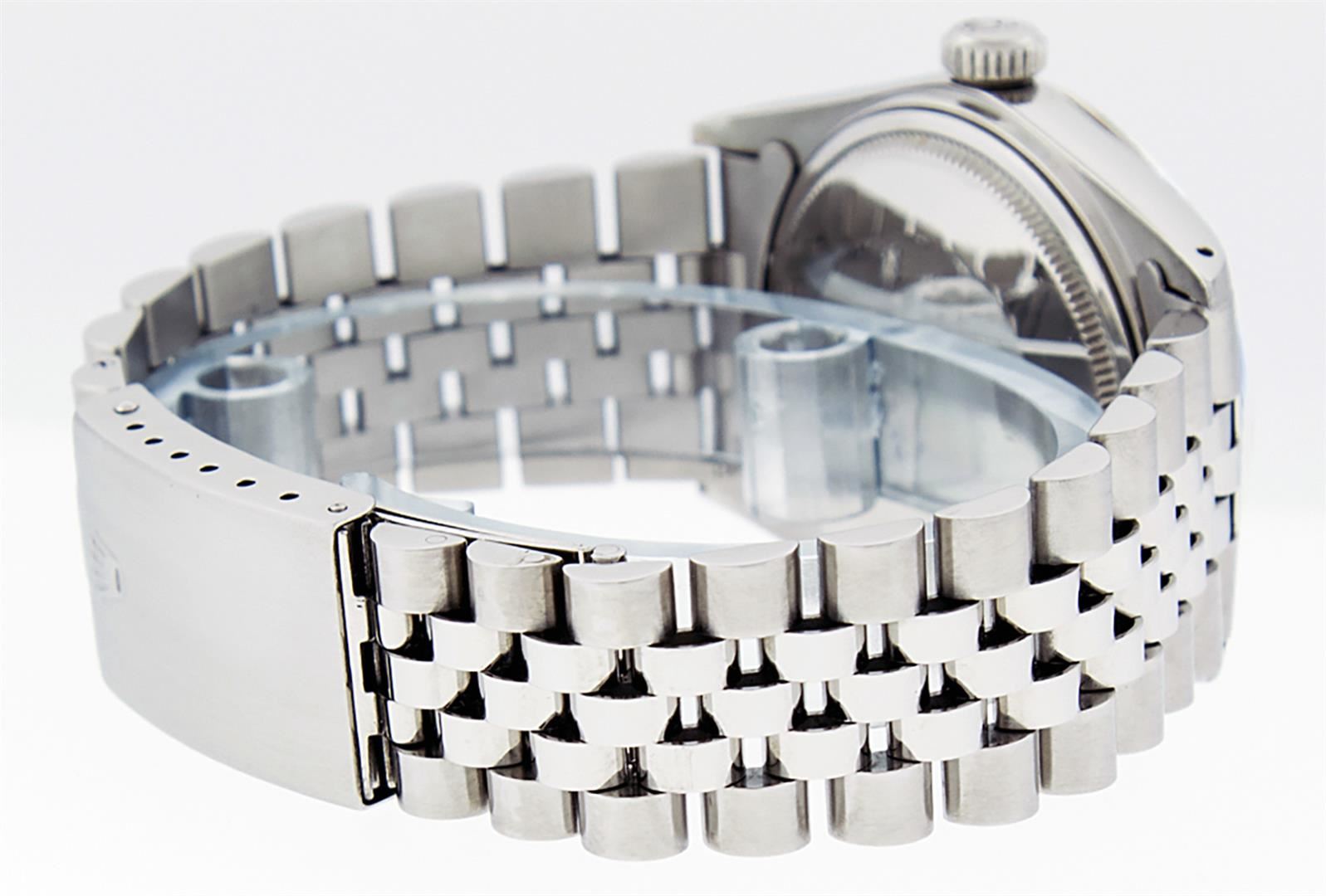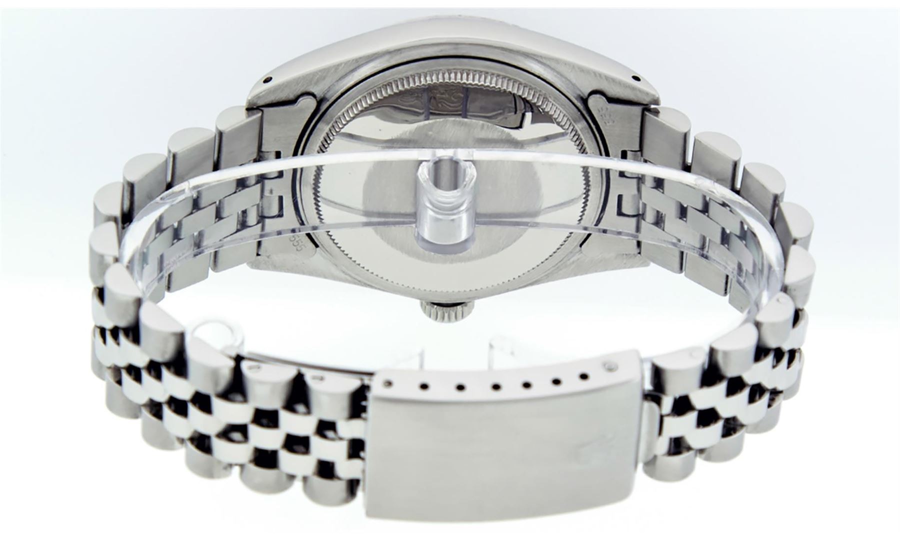 One Men's Stainless Steel Rolex Datejust Polished Bright with Satin Finish, This Watch Has Been Serviced & Electronically Tested, Stainless Steel Case: 36mm, Stainless Steel Crown, Bezel: 14K White Gold Fluted Bezel. Custom Crystal: New Acrylic Cyclops Lens. Custom Hands: New Luminescent Hands. Movement: Automatic Winding Movement Caliber 3035. Custom Dial: Ice Pink Diamond Dial With Diamond Hour Markers, Diamond Count: 10 Diamonds in Dial G To H In Color, SI-VS Clarity. Date Window: 3 O'clock Position Date Display, Quickset, Model: Datejust, Condition: G-6 Extra Fine. Bracelet: Stainless Steel Jubilee. Bright Polish & Satin Finish. 7.0 Inch Length, Adjustable. Standard Clasp, With Rolex Logo. This Watch Has Been Serviced Time Tested And Is In Excellent Condition It Is Free Of All Scratches And Dents