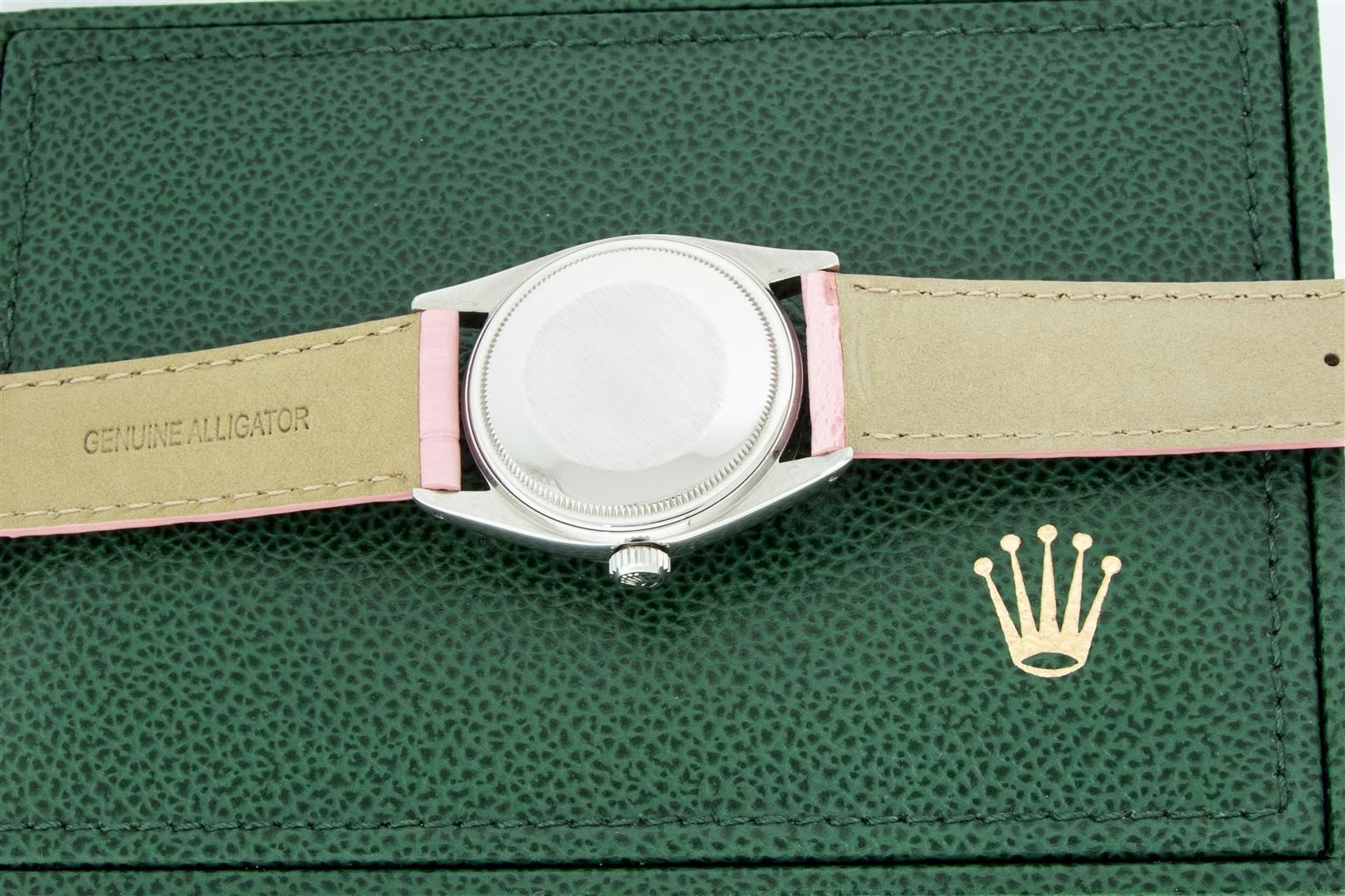 One Stainless Steel Rolex Datejust Polished Bright with Satin Finish, This Watch Has Been Serviced & Electronically Tested, Rolex Stainless Steel Case: 36mm, Rolex Stainless Steel Crown, Rolex Bezel: Rolex White Gold Fluted Bezel. Custom Crystal: New Acrylic With Magnified Date Window. Custom Hands: New Luminescent Hands. Rolex Movement: Self-Winding Movement. Custom Dial: Refinished To Pink With Custom Added Diamond Dials, Diamond Count: 10 Diamonds In Dial, G To H In Color, SI-VS Clarity. Date Window: 3 O'clock Position Date Display, Quickset, Model: Datejust, Condition: G-6 Extra Fine. Custom Band: Pink Leather Strap With Custom Buckle. Fits Up To 7.5 Inch Length. This Pre Owned Watch Has Been Serviced Time Tested And Is In Excellent Condition It Is Free Of All Scratches And Dents. This Watch Comes With A Rolex Box.