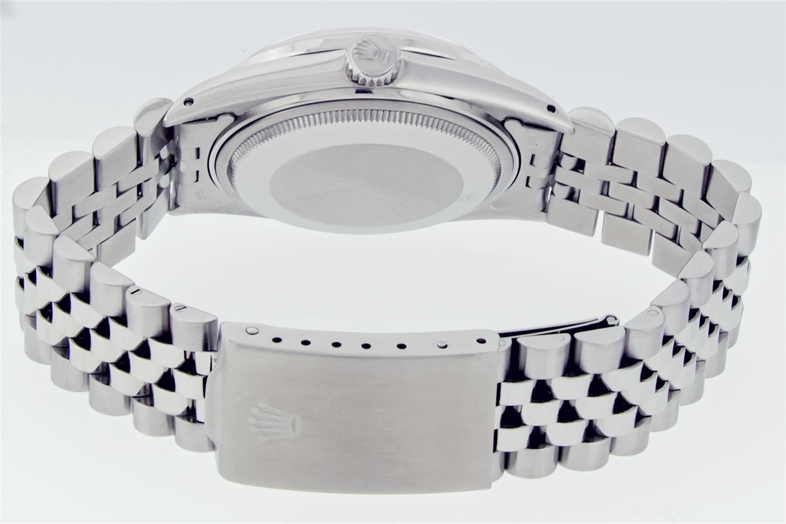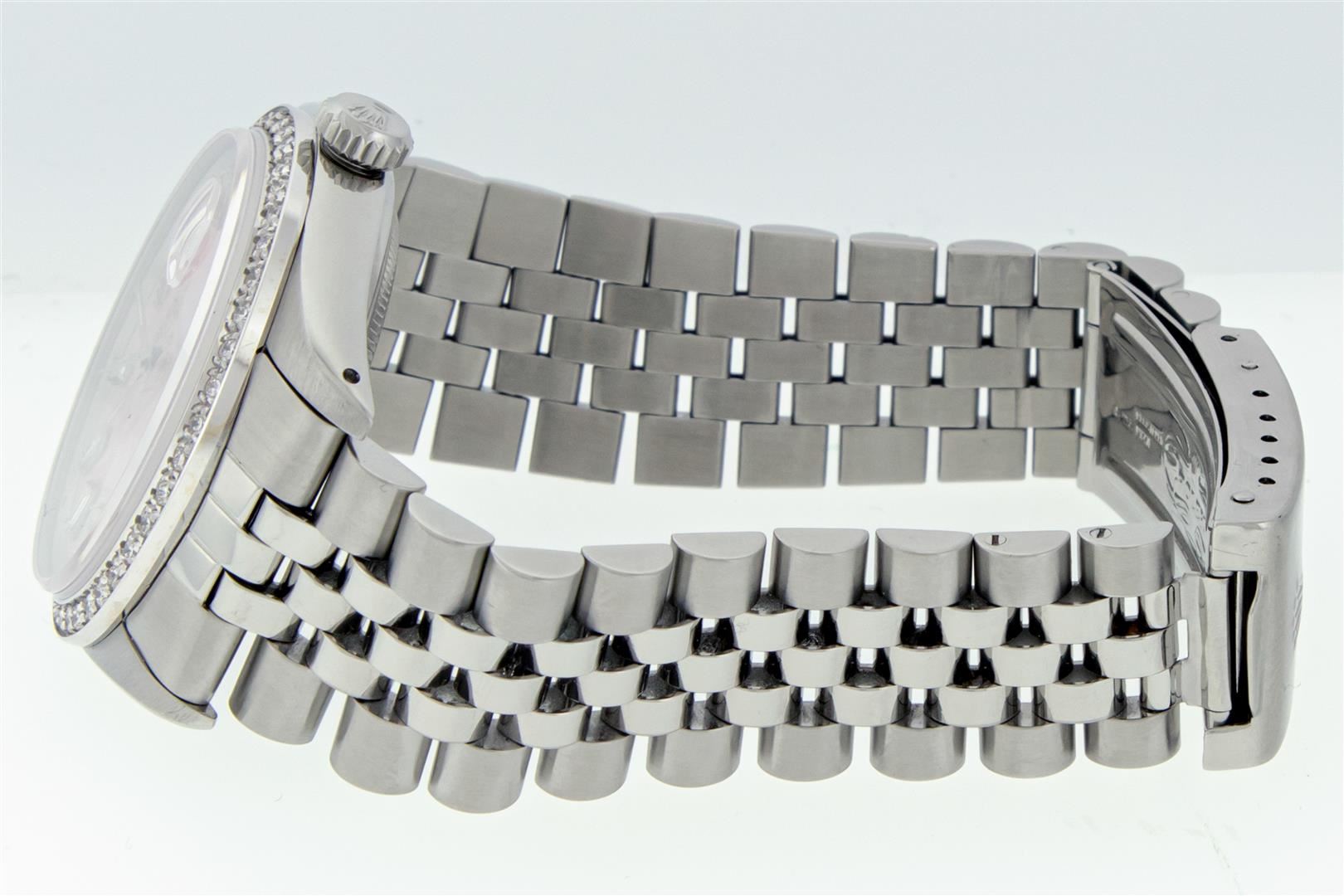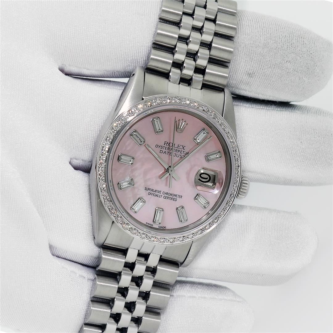 One Men's Stainless Steel Rolex Datejust Polished, Serviced & Electronically Tested, Stainless Steel Case: 36mm, Rolex Stainless Steel Crown, New Custom Bezel: 18K White Gold Beadset Diamond Bezel, Diamond Count: 44 Diamonds. Total Weight 1.00 Carat, Clarity: SI-VS, Color: G to H. Custom Crystal: New Sapphire With Magnified Date Window. Custom Hands: New Luminescent Hands. Rolex Movement: Automatic Winding Movement. Custom Dial: Refinished To Pink Mother Of Pearl With Baguette Diamond Hour Markers, Stone Count: 10 Baguette Diamonds On Dial. G To H In Color, Clarity: SI-VS. Date Window: 3 O'clock Position Date Display, Quickset, Model: Datejust. Condition: G-6 Extra Fine. Rolex Bracelet: Stainless Steel Jubilee Band. Bright Polish & Satin Finish. 7.0 Inch Length, Adjustable. Standard Clasp, With Rolex Logo. This Pre Owned Watch Has Been Serviced Time Tested And Is In Excellent Condition It Is Free Of All Scratches And Dents. This Watch Comes With A Rolex Box.