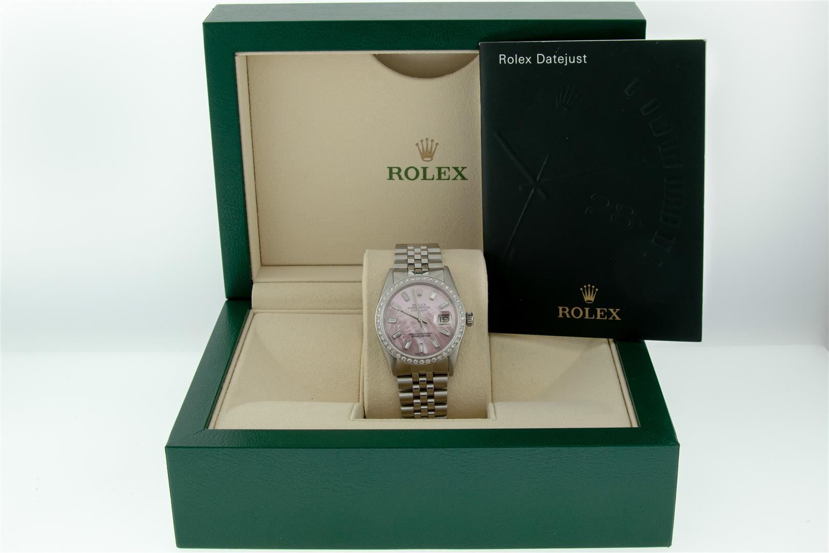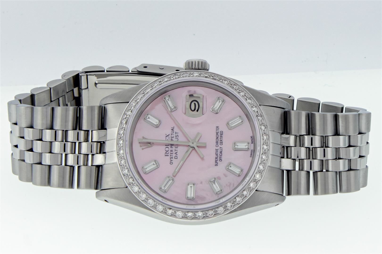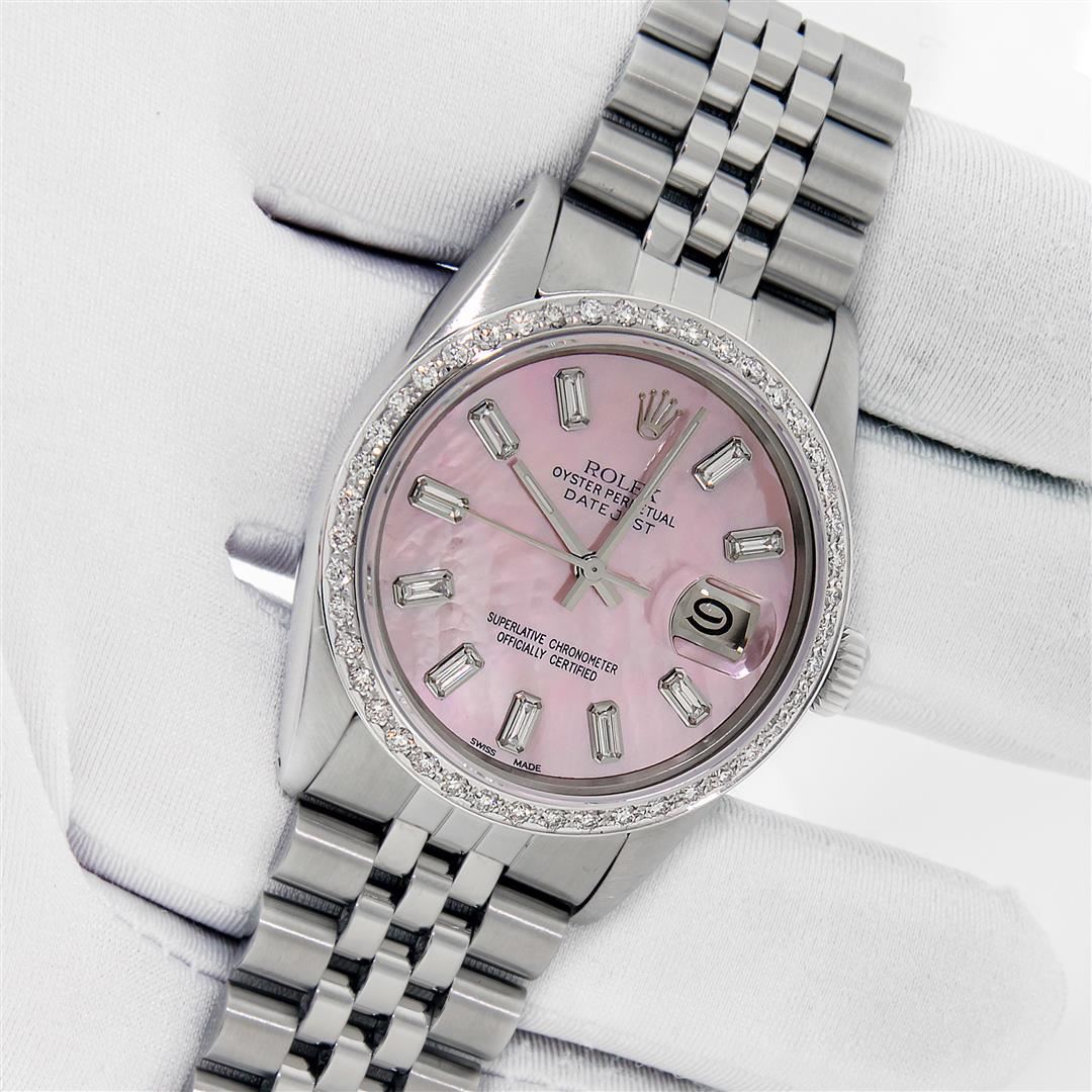 One Men's Stainless Steel Rolex Datejust Polished, Serviced & Electronically Tested, Stainless Steel Case: 36mm, Rolex Stainless Steel Crown, New Custom Bezel: 18K White Gold Beadset Diamond Bezel, Diamond Count: 44 Diamonds. Total Weight 1.00 Carat, Clarity: SI-VS, Color: G to H. Custom Crystal: New Sapphire With Magnified Date Window. Custom Hands: New Luminescent Hands. Rolex Movement: Automatic Winding Movement. Custom Dial: Refinished To Pink Mother Of Pearl With Baguette Diamond Hour Markers, Stone Count: 10 Baguette Diamonds On Dial. G To H In Color, Clarity: SI-VS. Date Window: 3 O'clock Position Date Display, Quickset, Model: Datejust. Condition: G-6 Extra Fine. Rolex Bracelet: Stainless Steel Jubilee Band. Bright Polish & Satin Finish. 7.0 Inch Length, Adjustable. Standard Clasp, With Rolex Logo. This Pre Owned Watch Has Been Serviced Time Tested And Is In Excellent Condition It Is Free Of All Scratches And Dents. This Watch Comes With A Rolex Box.