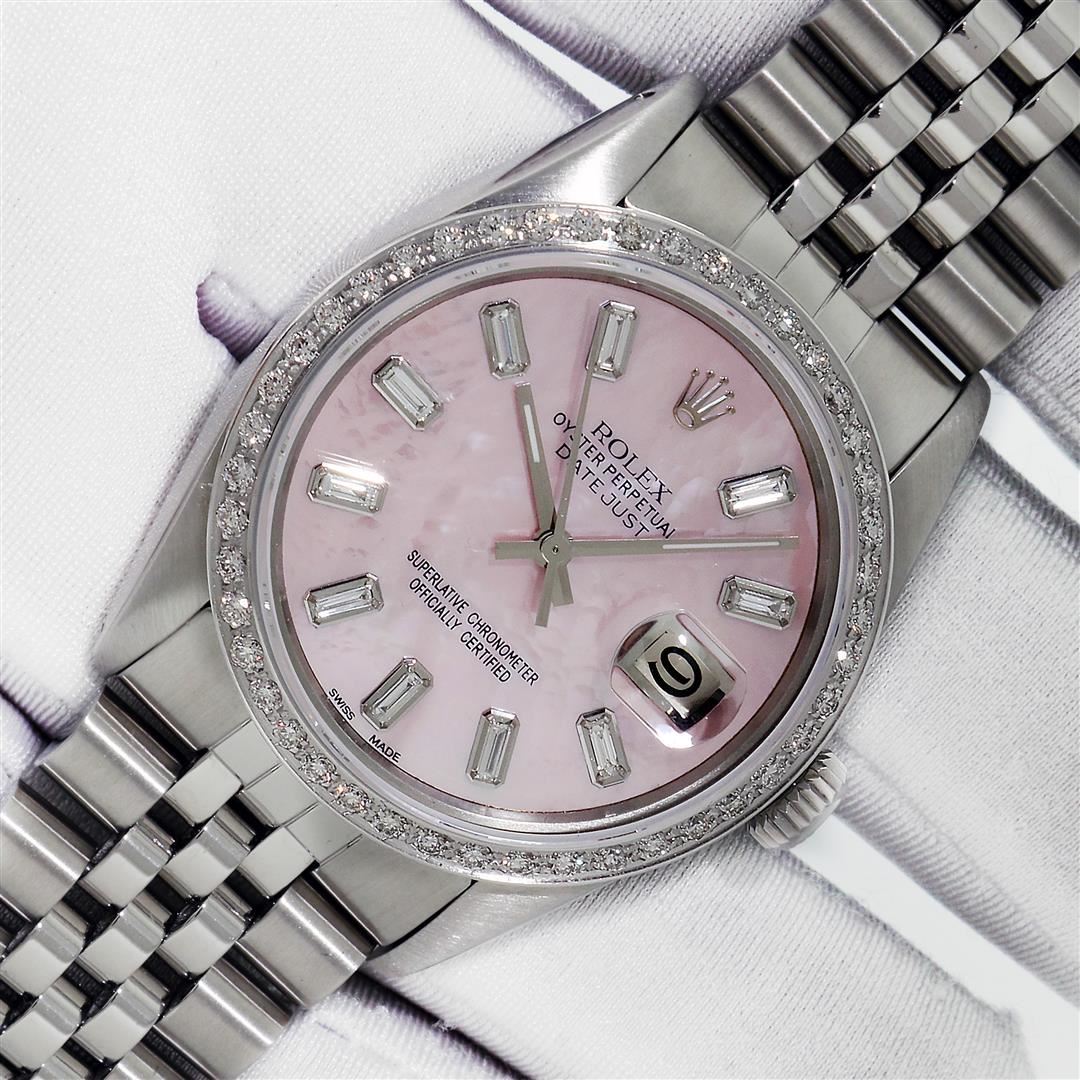 One Men's Stainless Steel Rolex Datejust Polished, Serviced & Electronically Tested, Stainless Steel Case: 36mm, Rolex Stainless Steel Crown, New Custom Bezel: 18K White Gold Beadset Diamond Bezel, Diamond Count: 44 Diamonds. Total Weight 1.00 Carat, Clarity: SI-VS, Color: G to H. Custom Crystal: New Sapphire With Magnified Date Window. Custom Hands: New Luminescent Hands. Rolex Movement: Automatic Winding Movement. Custom Dial: Refinished To Pink Mother Of Pearl With Baguette Diamond Hour Markers, Stone Count: 10 Baguette Diamonds On Dial. G To H In Color, Clarity: SI-VS. Date Window: 3 O'clock Position Date Display, Quickset, Model: Datejust. Condition: G-6 Extra Fine. Rolex Bracelet: Stainless Steel Jubilee Band. Bright Polish & Satin Finish. 7.0 Inch Length, Adjustable. Standard Clasp, With Rolex Logo. This Pre Owned Watch Has Been Serviced Time Tested And Is In Excellent Condition It Is Free Of All Scratches And Dents. This Watch Comes With A Rolex Box.