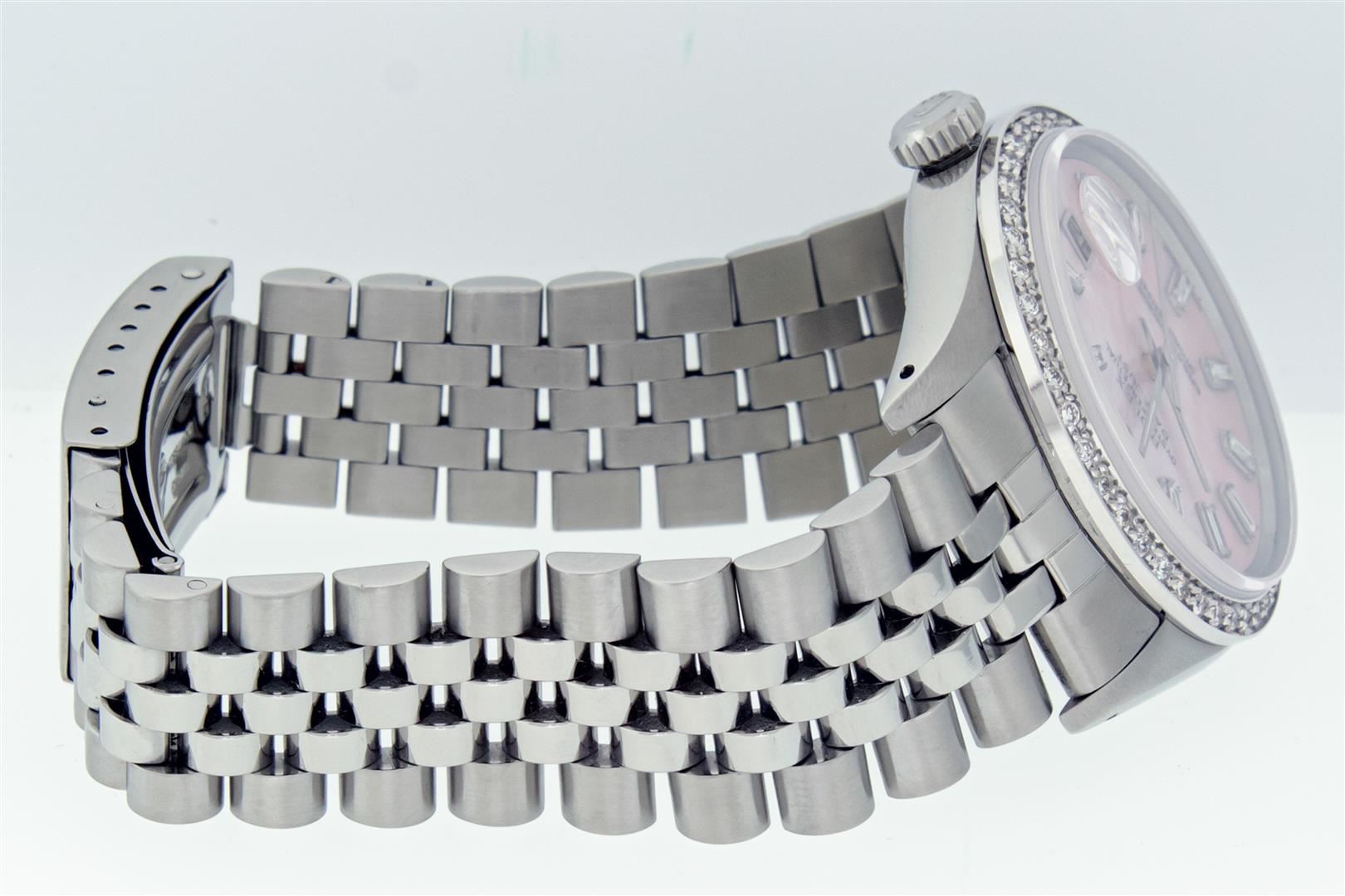 One Men's Stainless Steel Rolex Datejust Polished, Serviced & Electronically Tested, Stainless Steel Case: 36mm, Rolex Stainless Steel Crown, New Custom Bezel: 18K White Gold Beadset Diamond Bezel, Diamond Count: 44 Diamonds. Total Weight 1.00 Carat, Clarity: SI-VS, Color: G to H. Custom Crystal: New Sapphire With Magnified Date Window. Custom Hands: New Luminescent Hands. Rolex Movement: Automatic Winding Movement. Custom Dial: Refinished To Pink Mother Of Pearl With Baguette Diamond Hour Markers, Stone Count: 10 Baguette Diamonds On Dial. G To H In Color, Clarity: SI-VS. Date Window: 3 O'clock Position Date Display, Quickset, Model: Datejust. Condition: G-6 Extra Fine. Rolex Bracelet: Stainless Steel Jubilee Band. Bright Polish & Satin Finish. 7.0 Inch Length, Adjustable. Standard Clasp, With Rolex Logo. This Pre Owned Watch Has Been Serviced Time Tested And Is In Excellent Condition It Is Free Of All Scratches And Dents. This Watch Comes With A Rolex Box.