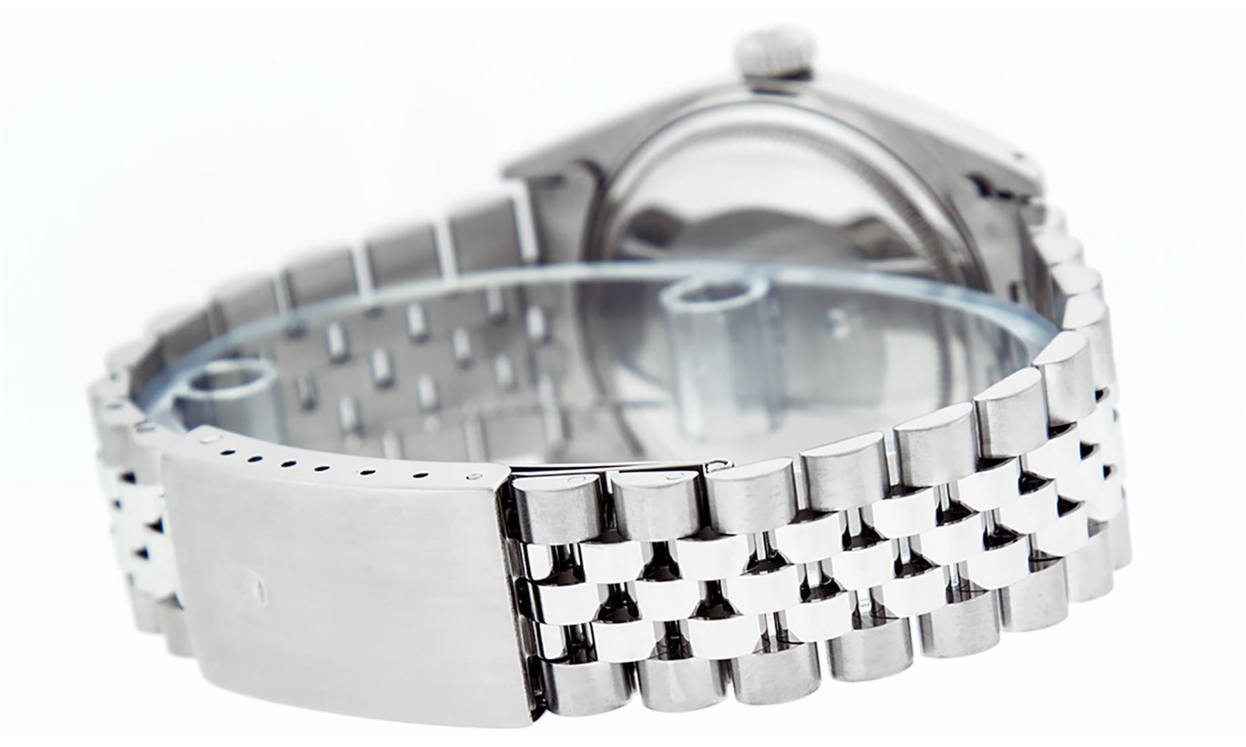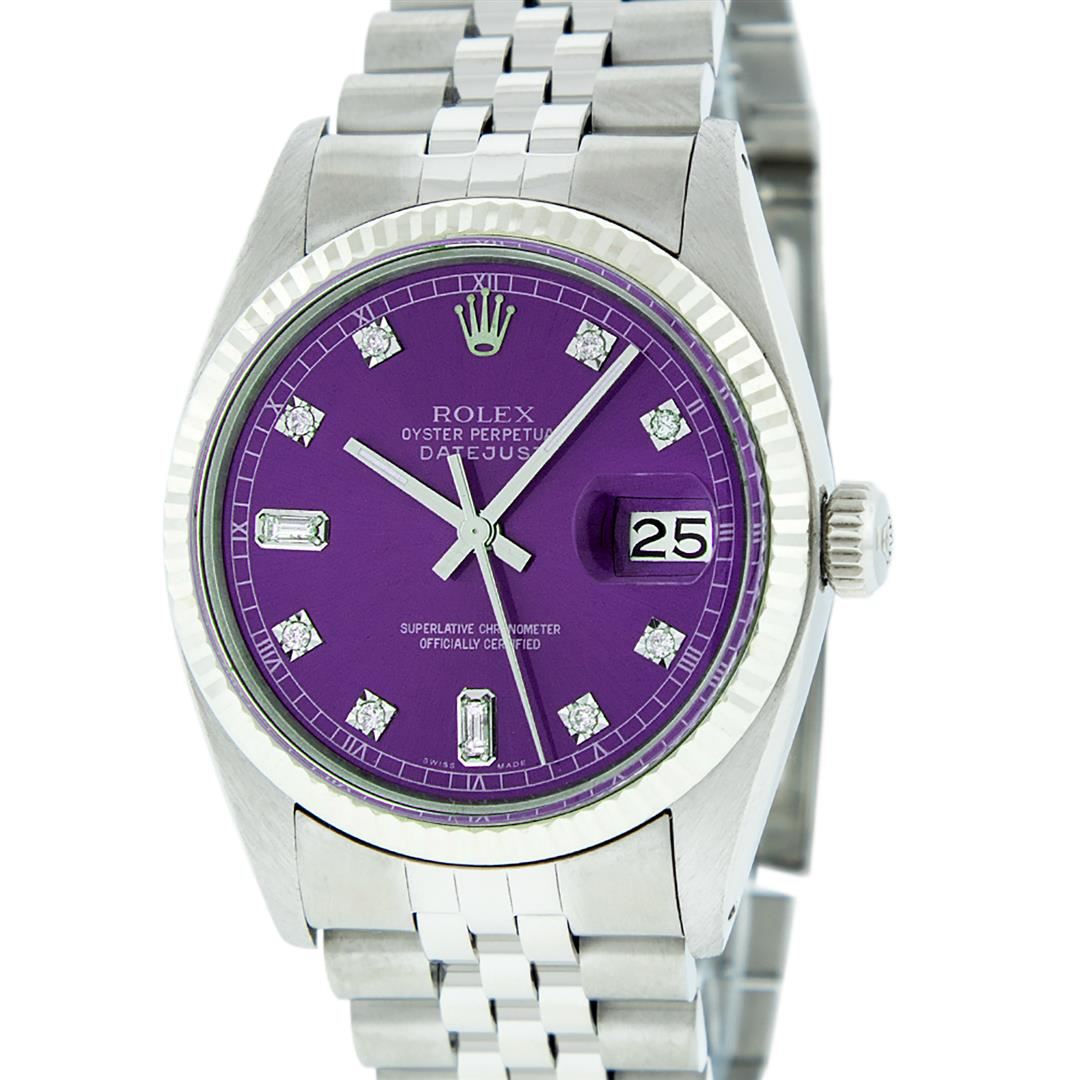 One Men's Pre Owned Stainless Steel Rolex Datejust Polished Bright with Satin Finish, This Watch Has Been Serviced & Electronically Tested, Rolex Stainless Steel Case: 36mm, Rolex Stainless Steel Crown, Rolex Bezel: 14K White Gold Fluted Bezel. Custom Crystal: New Acrylic Cyclops Lens. Custom Hands: New Luminescent Hands. Rolex Movement: Automatic Winding Movement. Custom Dial: Dial Refinished To Purple With Custom Added Genuine Diamonds, Diamond Count: 8 Diamonds + 2 Baguettes in Dial G To H In Color, SI-VS Clarity. Date Window: 3 O'clock Position Date Display, Quickset, Model: Datejust, Condition: G-6 Extra Fine. Rolex Bracelet: Stainless Steel Jubilee Band. Bright Polish & Satin Finish. 7.0 Inch Length, Adjustable. Standard Clasp, With Rolex Logo. This Watch Has Been Serviced Time Tested And Is In Excellent Condition It Is Free Of All Scratches And Dents.