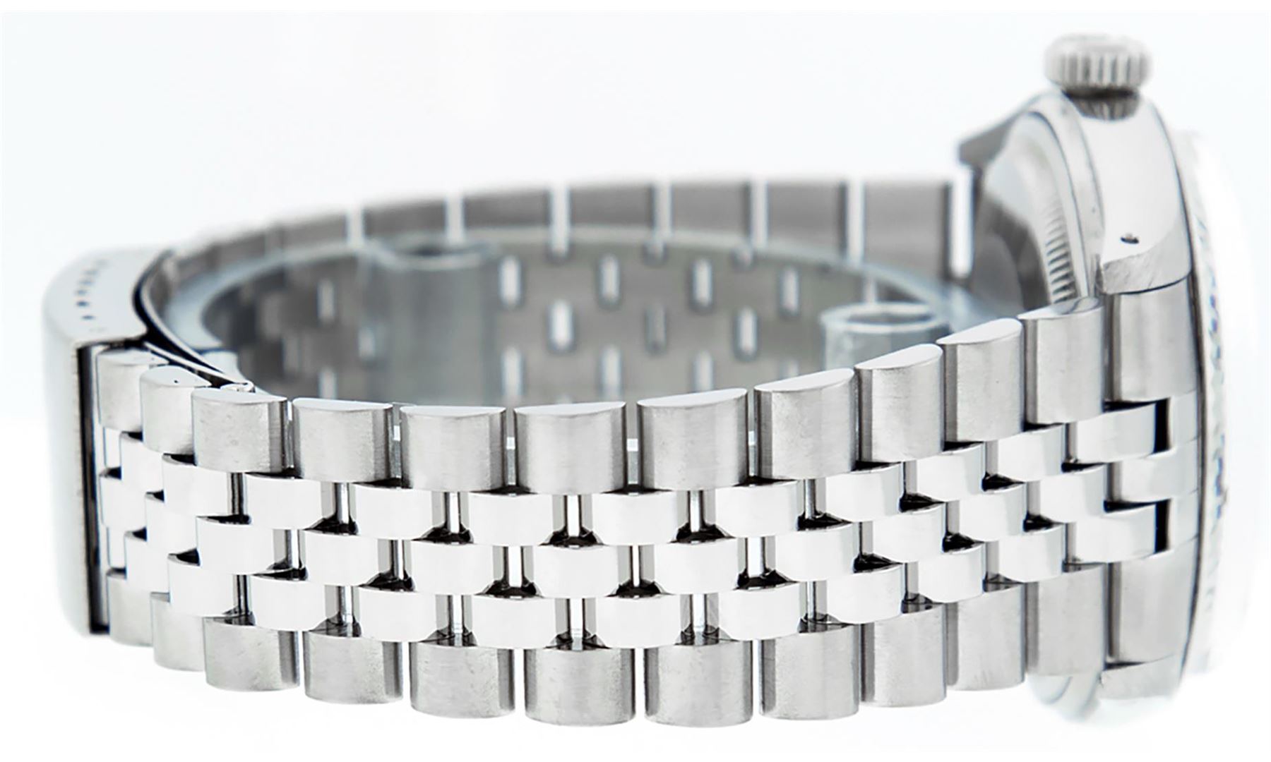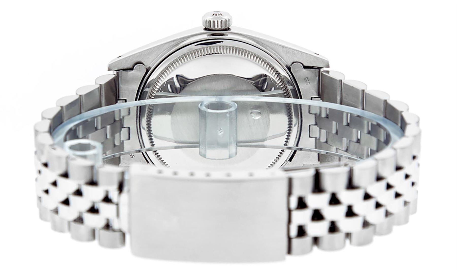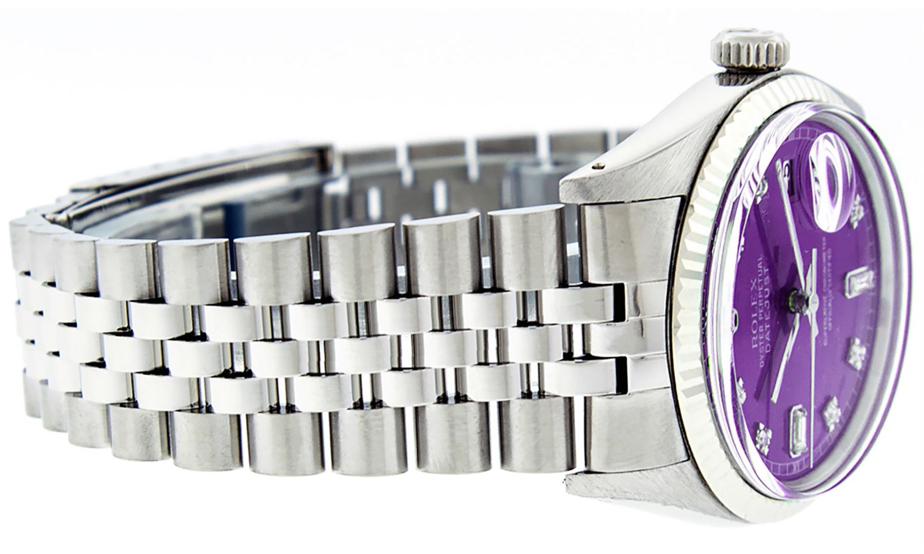 One Men's Pre Owned Stainless Steel Rolex Datejust Polished Bright with Satin Finish, This Watch Has Been Serviced & Electronically Tested, Rolex Stainless Steel Case: 36mm, Rolex Stainless Steel Crown, Rolex Bezel: 14K White Gold Fluted Bezel. Custom Crystal: New Acrylic Cyclops Lens. Custom Hands: New Luminescent Hands. Rolex Movement: Automatic Winding Movement. Custom Dial: Dial Refinished To Purple With Custom Added Genuine Diamonds, Diamond Count: 8 Diamonds + 2 Baguettes in Dial G To H In Color, SI-VS Clarity. Date Window: 3 O'clock Position Date Display, Quickset, Model: Datejust, Condition: G-6 Extra Fine. Rolex Bracelet: Stainless Steel Jubilee Band. Bright Polish & Satin Finish. 7.0 Inch Length, Adjustable. Standard Clasp, With Rolex Logo. This Watch Has Been Serviced Time Tested And Is In Excellent Condition It Is Free Of All Scratches And Dents.