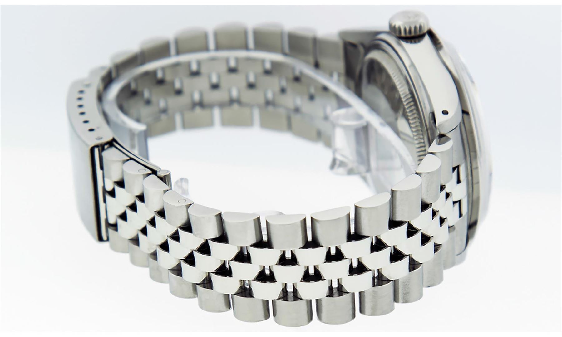 One Men's Rolex Stainless Steel Datejust Polished Bright with Satin Finish, This Watch Has Been Serviced & Electronically Tested, Stainless Steel Case: 36mm, Stainless Steel Crown, Custom Bezel: New Stainless Steel Beadset Diamond Bezel, Diamond Count: 54 Diamonds, Total Weight 1.00 Carat, Clarity: SI-VS, Color: G to H. Custom Crystal: New Synthetic Sapphire Cyclops Lens. Custom Hands: New Luminescent Hands. Movement: Automatic Winding Movement Caliber 3035. Custom Dial: Purple String Diamond Dial, Diamond Count: 58 Diamonds In Dial, Color: G to H, Clarity: VS2-SI1. Date Window: 3 O'clock Position Date Display, Quickset, Model: Datejust. Condition: G-6 Extra Fine. Bracelet: Stainless Steel Jubilee Band. Bright Polish & Satin Finish. 7.0 Inch Length, Adjustable. Standard Clasp, With Rolex Logo. This Watch Has Been Serviced Time Tested And Is In Excellent Condition It Is Free Of All Scratches And Dents.