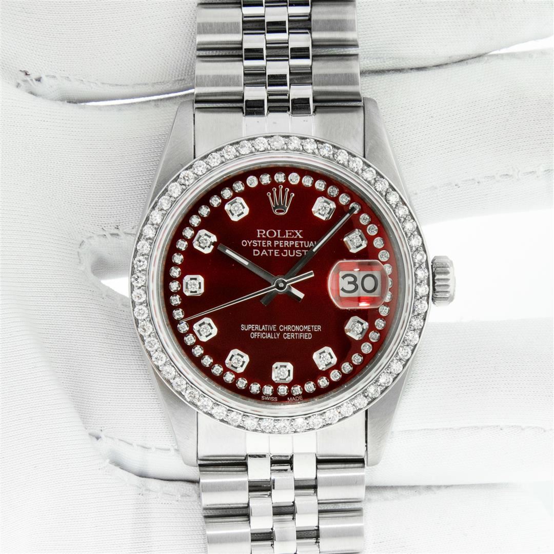 One Men's Rolex Stainless Steel Datejust Polished Bright with Satin Finish, This Watch Has Been Serviced & Electronically Tested, Rolex Stainless Steel Case: 36mm, Stainless Steel Crown, Custom Bezel: New Stainless Steel Beadset Diamond Bezel, Diamond Count: 54 Diamonds In Bezel, Total Weight 1.00 Carat, Clarity: SI-VS, Color: G to H. Custom Crystal: New Sapphire With Magnified Date Window. Custom Hands: New Luminescent Hands. Rolex Movement: Automatic Winding Movement. Custom Dial: Refinished To Red With Custom Added Diamond Hour Markers, Diamond Count: 58 Diamonds In Dial, Color: G to H, Clarity: VS2-SI1. Date Window: 3 O'clock Position Date Display, Quickset, Model: Datejust. Condition: G-6 Extra Fine. Rolex Bracelet: Stainless Steel Jubilee Band. Bright Polish & Satin Finish. 7.0 Inch Length, Adjustable. Standard Clasp, With Rolex Logo. This Pre Owned Watch Has Been Serviced Time Tested And Is In Excellent Condition It Is Free Of All Scratches And Dents. This Watch Comes With A Rolex Box.