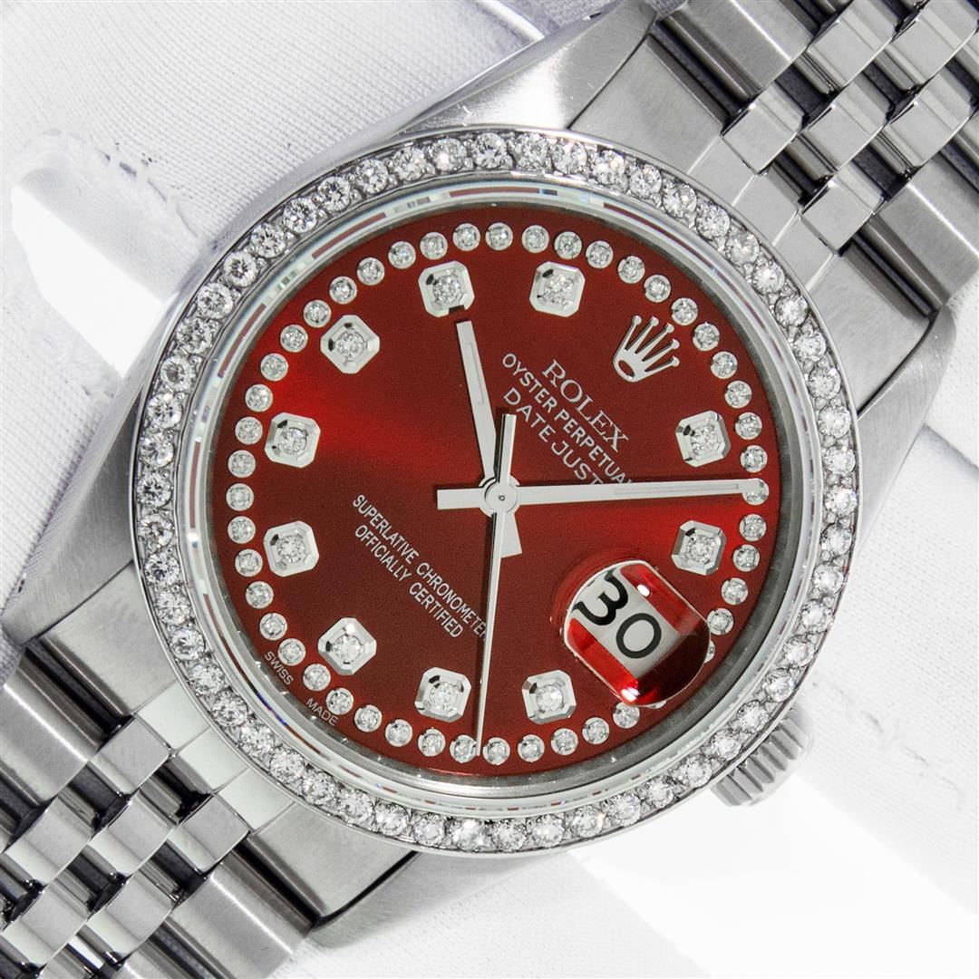 One Men's Rolex Stainless Steel Datejust Polished Bright with Satin Finish, This Watch Has Been Serviced & Electronically Tested, Rolex Stainless Steel Case: 36mm, Stainless Steel Crown, Custom Bezel: New Stainless Steel Beadset Diamond Bezel, Diamond Count: 54 Diamonds In Bezel, Total Weight 1.00 Carat, Clarity: SI-VS, Color: G to H. Custom Crystal: New Sapphire With Magnified Date Window. Custom Hands: New Luminescent Hands. Rolex Movement: Automatic Winding Movement. Custom Dial: Refinished To Red With Custom Added Diamond Hour Markers, Diamond Count: 58 Diamonds In Dial, Color: G to H, Clarity: VS2-SI1. Date Window: 3 O'clock Position Date Display, Quickset, Model: Datejust. Condition: G-6 Extra Fine. Rolex Bracelet: Stainless Steel Jubilee Band. Bright Polish & Satin Finish. 7.0 Inch Length, Adjustable. Standard Clasp, With Rolex Logo. This Pre Owned Watch Has Been Serviced Time Tested And Is In Excellent Condition It Is Free Of All Scratches And Dents. This Watch Comes With A Rolex Box.