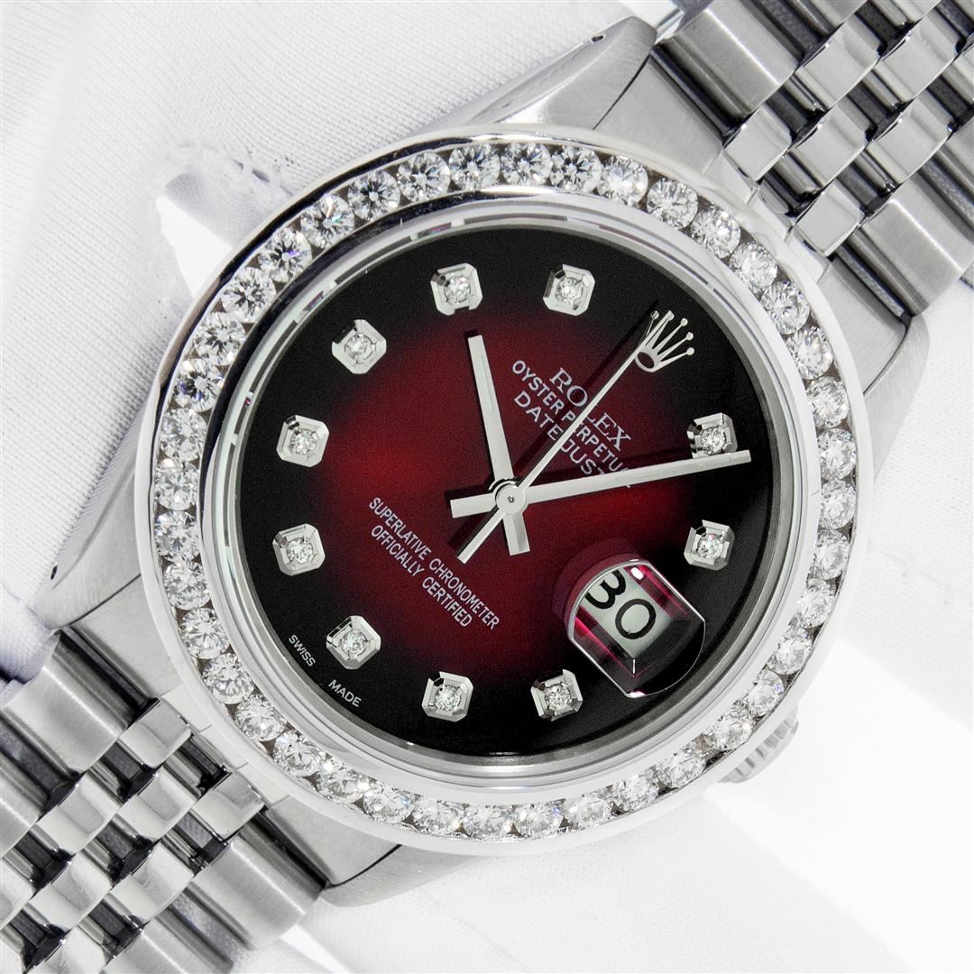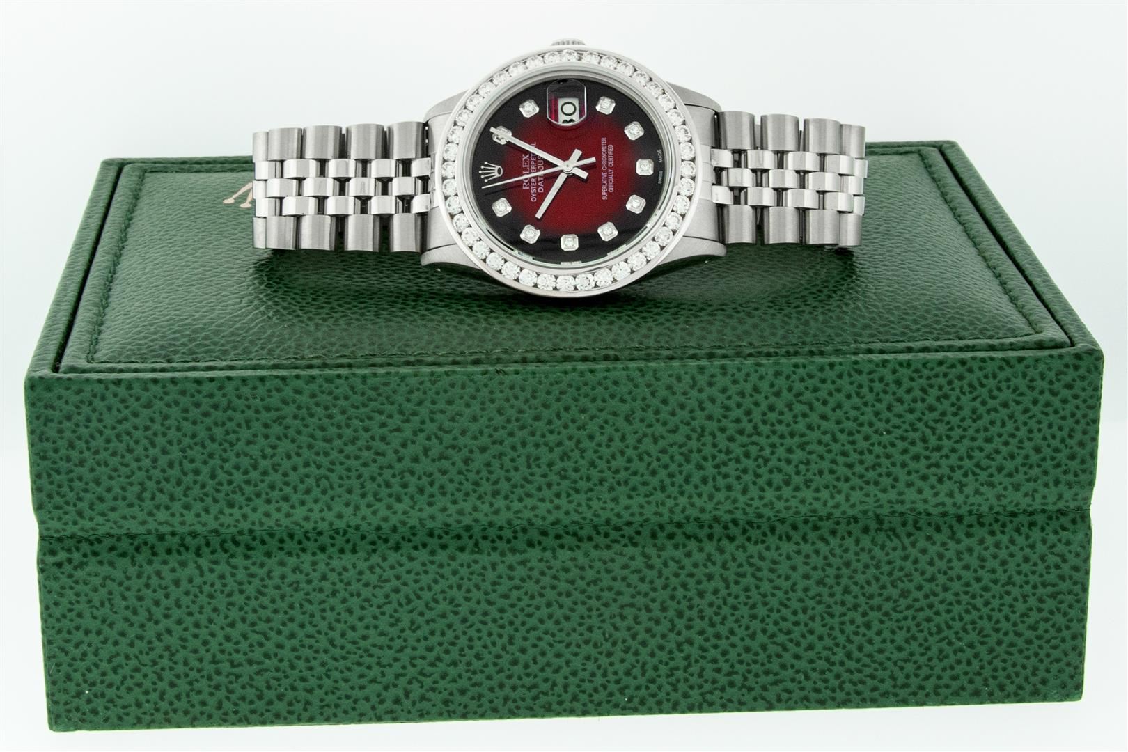 One Mens Stainless Steel Rolex Datejust Polished Bright with Satin Finish, Fully Serviced & Electronically Tested, Stainless Steel Case: 36mm, Rolex Stainless Steel Crown, Custom Bezel: New 18K White Gold 3.00 Ctw Diamond Bezel, Diamond Count: 40 Diamonds, Total Weight 3.0 Carat, Clarity: SI-VS, Color: G to H. Custom Crystal: New Sapphire With Magnified Date Window. Custom Hands: New Luminescent Hands. Rolex Movement: Automatic Winding Movement. Custom Dial: Refinished To Red Vignette With Added Diamond Hour Markers, 10 Diamonds in Dial, G To H In Color, Clarity: SI-VS. Date Window: 3 O'Clock Position Date Display, Quickset, Model: Datejust 36mm, Condition: G-6 Extra Fine. Rolex Bracelet: Rolex Stainless Steel Jubilee Band. Bright Polish & Satin Finish. 7.0 Inch Length, Adjustable. Standard Clasp, With Rolex Logo. This Pre Owned Watch Has Been Serviced And Polished It Is Free Of All Scratches And Dents. This Watch Comes With A Rolex Box.