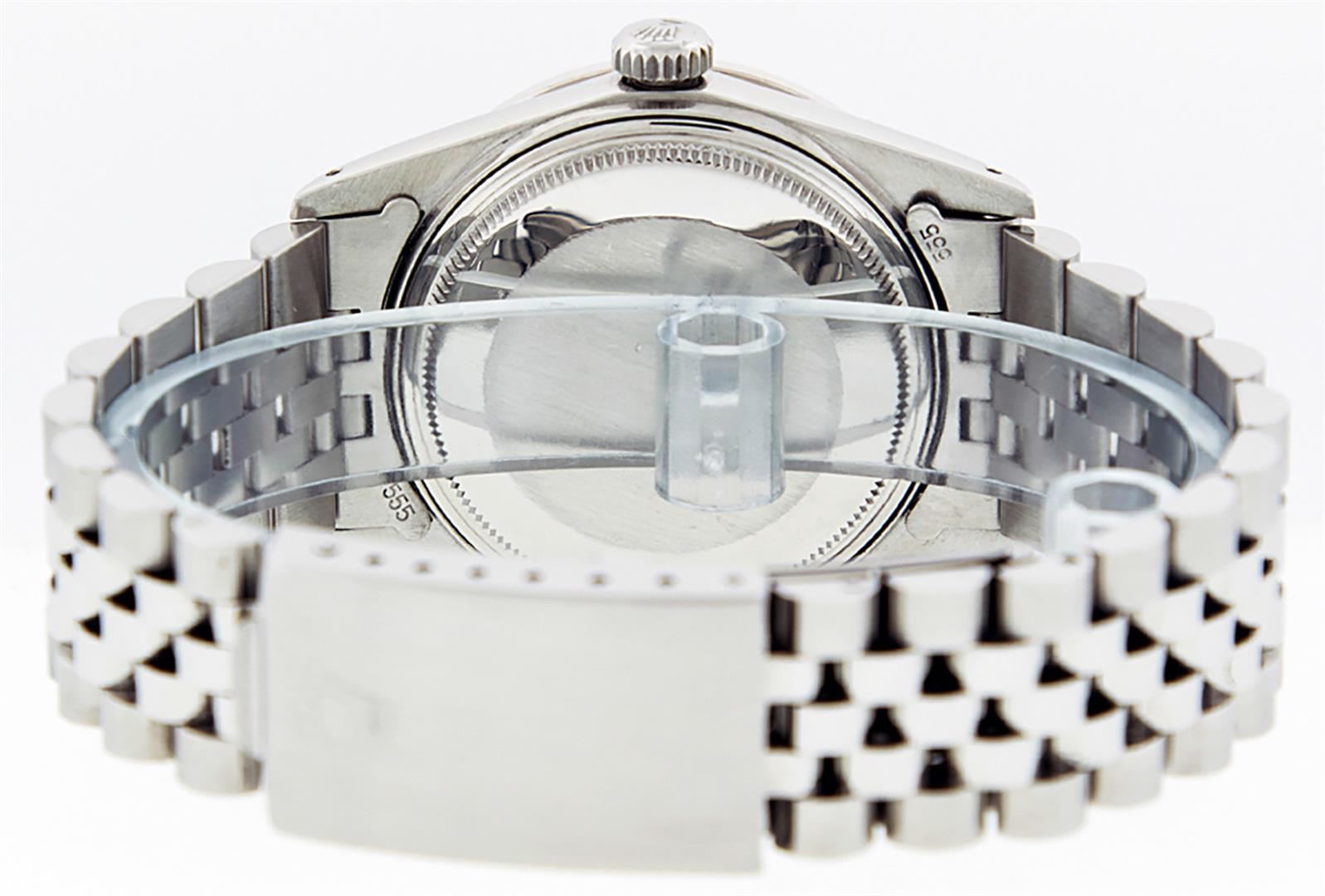 One Men's Stainless Steel Rolex Datejust Polished, Serviced & Electronically Tested, Stainless Steel Case: 36mm, Stainless Steel Crown, Custom Bezel: New 18K White Gold Ruby Beadset Diamond Bezel, Diamond + Gem Count: 36 Diamonds + 4 Rubies Total Weight 1.00 Carat, Clarity: SI-VS, Color: G to H. Custom Crystal: New Synthetic Sapphire Cyclops Lens. Custom Hands: New Luminescent Hands. Movement: Automatic Winding Movement Caliber 3035. Custom Dial: Red Vignette With Diamond Hour Markers, 10 Diamonds in Dial, G To H In Color, Clarity: SI-VS. Date Window: 3 O'clock Position Date Display, Quickset, Model: Datejust. Condition: G-6 Extra Fine. Bracelet: Stainless Steel Jubilee. Bright Polish & Satin Finish. 7.0 Inch Length, Adjustable. Standard Clasp, With Rolex Logo. This Watch Has Been Serviced Time Tested And Is In Excellent Condition It Is Free Of All Scratches And Dents