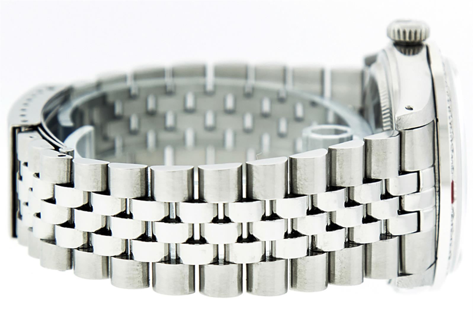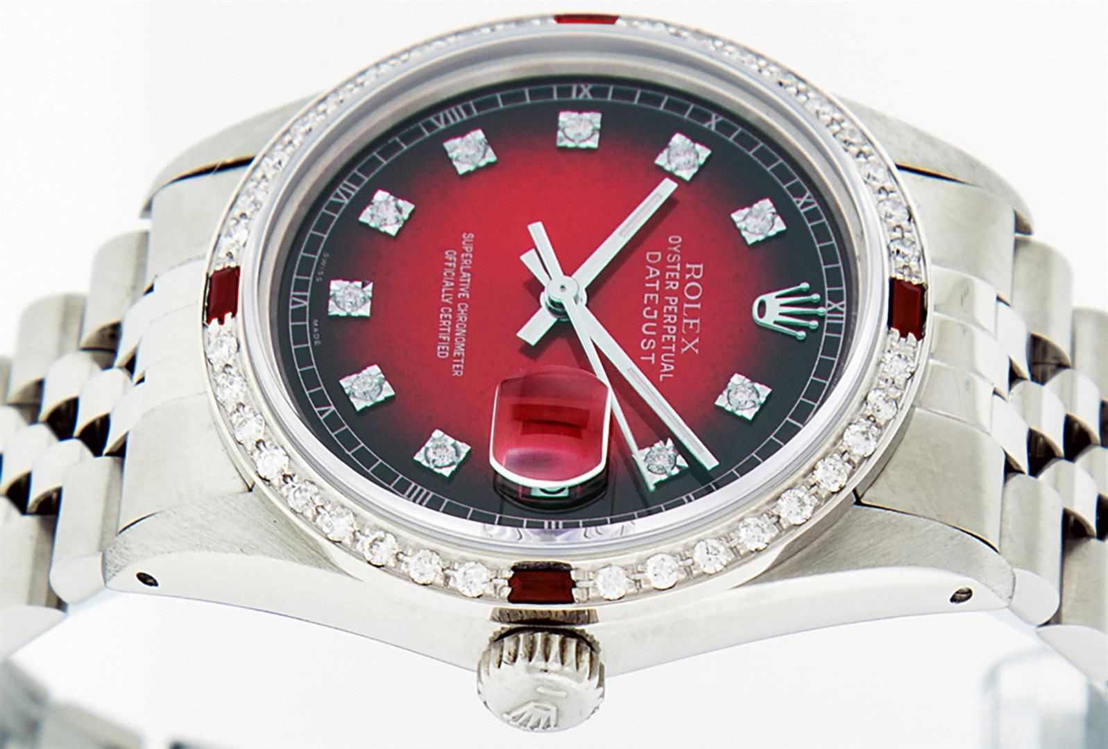 One Men's Stainless Steel Rolex Datejust Polished, Serviced & Electronically Tested, Stainless Steel Case: 36mm, Stainless Steel Crown, Custom Bezel: New 18K White Gold Ruby Beadset Diamond Bezel, Diamond + Gem Count: 36 Diamonds + 4 Rubies Total Weight 1.00 Carat, Clarity: SI-VS, Color: G to H. Custom Crystal: New Synthetic Sapphire Cyclops Lens. Custom Hands: New Luminescent Hands. Movement: Automatic Winding Movement Caliber 3035. Custom Dial: Red Vignette With Diamond Hour Markers, 10 Diamonds in Dial, G To H In Color, Clarity: SI-VS. Date Window: 3 O'clock Position Date Display, Quickset, Model: Datejust. Condition: G-6 Extra Fine. Bracelet: Stainless Steel Jubilee. Bright Polish & Satin Finish. 7.0 Inch Length, Adjustable. Standard Clasp, With Rolex Logo. This Watch Has Been Serviced Time Tested And Is In Excellent Condition It Is Free Of All Scratches And Dents