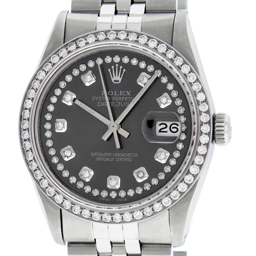 One Men's Rolex Stainless Steel Datejust Polished Bright with Satin Finish, This Watch Has Been Serviced & Electronically Tested, Stainless Steel Case: 36mm, Stainless Steel Crown, Custom Bezel:�New Stainless Steel�Beadset Diamond Bezel, Diamond Count:�54 Diamonds, Total Weight 1.00 Carat, Clarity: SI-VS, Color: G to H. Custom Crystal: New Synthetic Sapphire Cyclops Lens. Custom Hands: New Luminescent Hands. Movement: Automatic Winding Movement Caliber 3035. Custom Dial: Rhodium String Diamond Dial, Diamond Count: 58 Diamonds In Dial, Color: G to H, Clarity: VS2-SI1. Date Window: 3 O'clock Position Date Display, Quickset, Model: Datejust. Condition: G-6 Extra Fine. Bracelet: Stainless Steel Jubilee Band. Bright Polish & Satin Finish.�7.0 Inch Length, Adjustable. Standard Clasp, With Rolex Logo. This Watch Has Been Serviced Time Tested And Is In Excellent Condition It Is Free Of All Scratches And Dents.