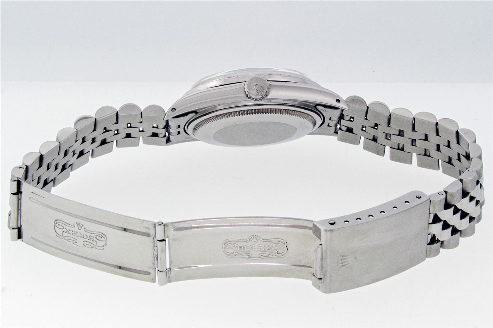 One Men's Rolex Stainless Steel Datejust Polished Bright with Satin Finish, This Watch Has Been Serviced & Electronically Tested, Rolex Stainless Steel Case: 36mm, Rolex Stainless Steel Crown, Custom Bezel: New 18K White Gold Ruby Beadset Diamond Bezel, Stone Count: 36 Diamonds + Sapphires In Bezel, Total Weight 1.00 Carat, Clarity: SI-VS, Color: G to H. Custom Crystal: New Sapphire With Magnified Date Window. Custom Hands: New Luminescent Hands. Rolex Movement: Automatic Winding Movement. Custom Dial: Refinished To Silver With Added Baguettes Diamonds On Dial, Stone Count: 10 Baguette Diamonds On Dial, Color: G to H, Clarity: VS2-SI1. Date Window: 3 O'clock Position Date Display, Quickset, Model: Datejust. Condition: G-6 Extra Fine. Rolex Bracelet: Stainless Steel Jubilee Band. Bright Polish & Satin Finish. 7.0 Inch Length, Adjustable. Standard Clasp, With Rolex Logo. This Pre Owned Watch Has Been Serviced Time Tested And Is In Excellent Condition It Is Free Of All Scratches And Dents.