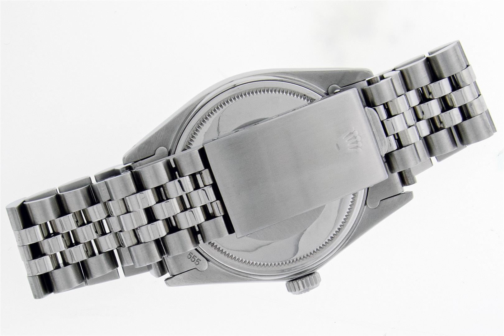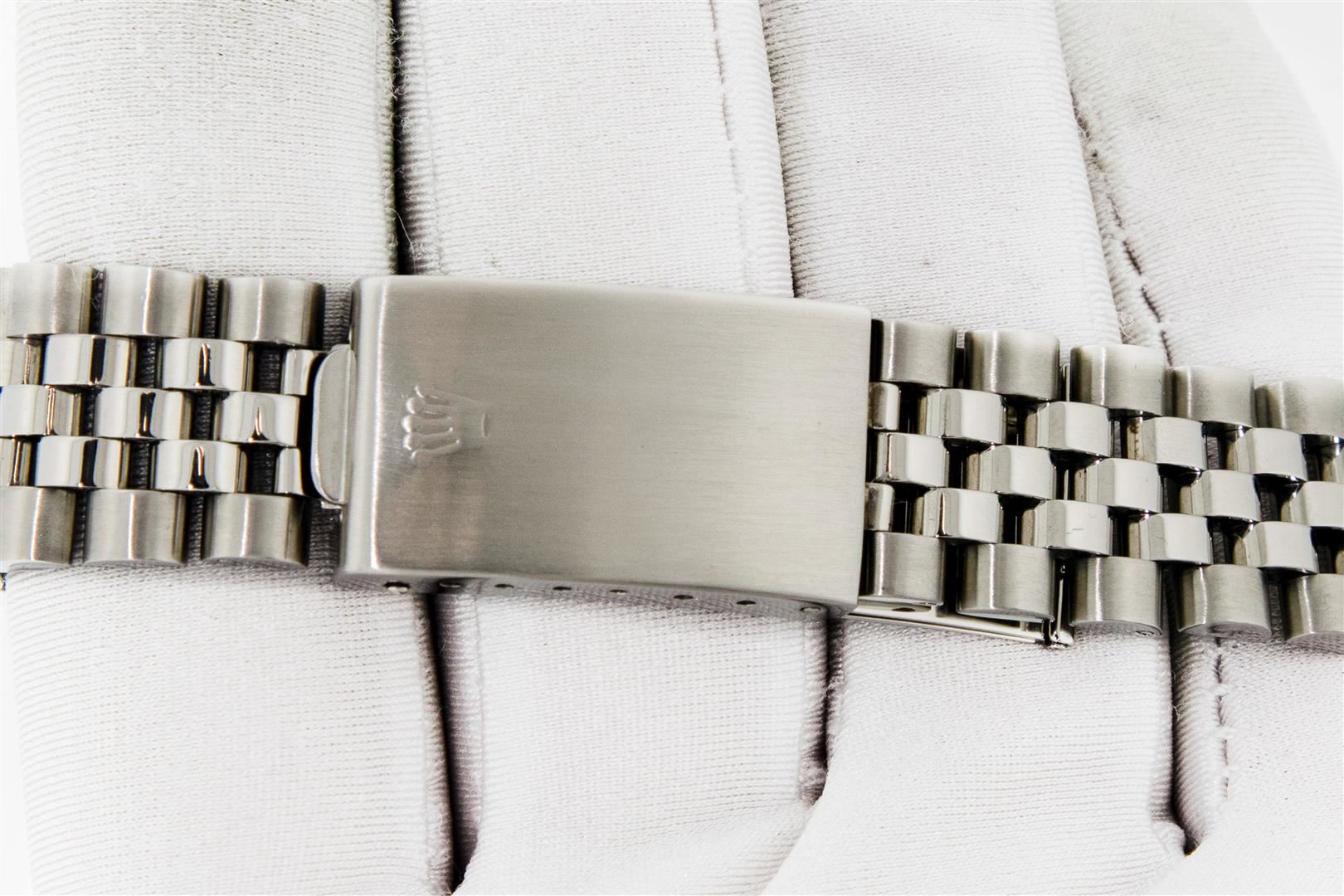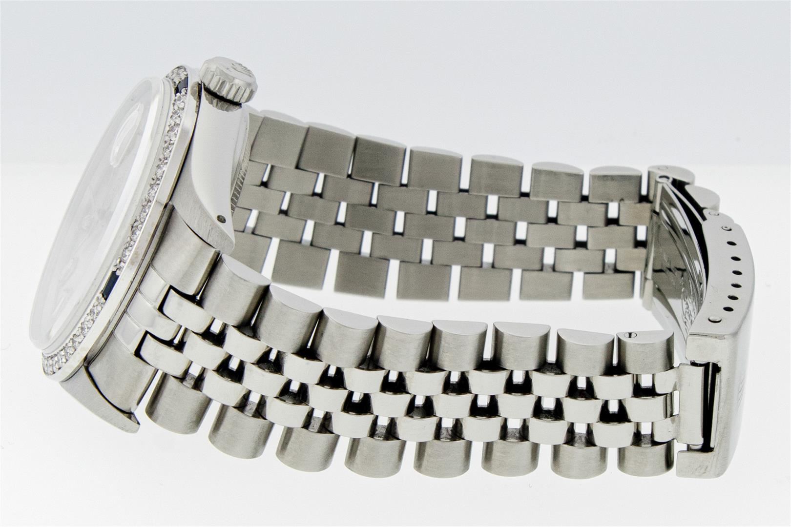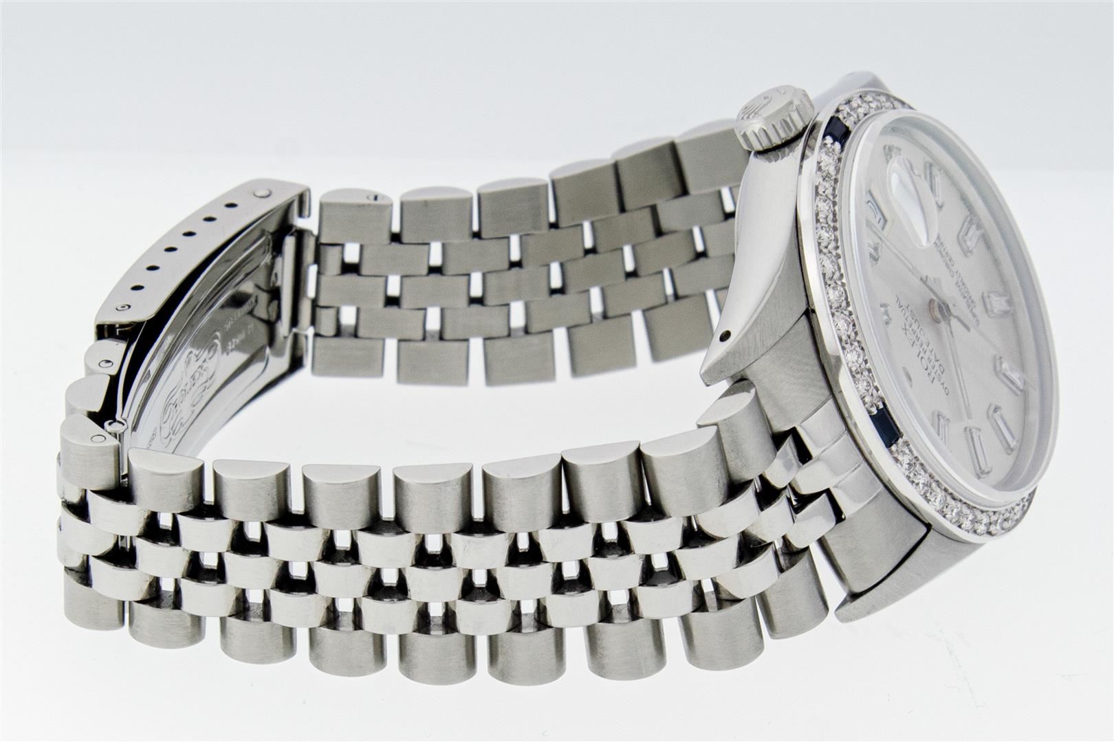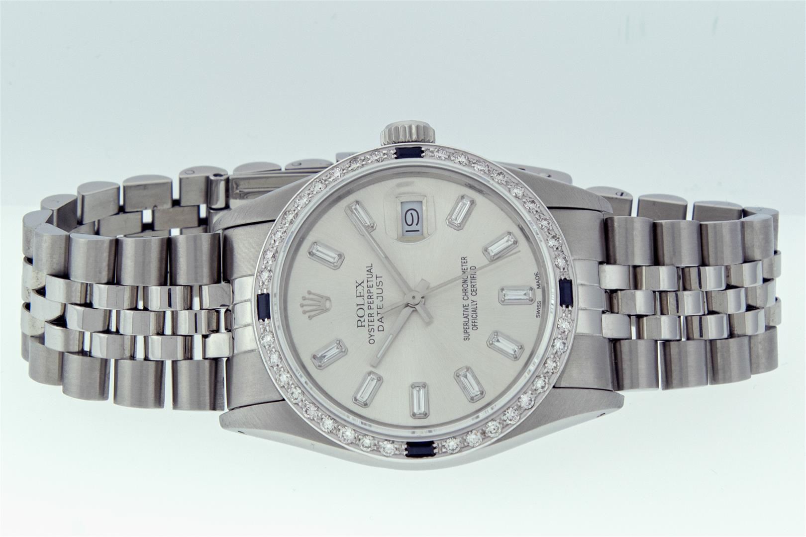 One Men's Rolex Stainless Steel Datejust Polished Bright with Satin Finish, This Watch Has Been Serviced & Electronically Tested, Rolex Stainless Steel Case: 36mm, Rolex Stainless Steel Crown, Custom Bezel: New 18K White Gold Ruby Beadset Diamond Bezel, Stone Count: 36 Diamonds + Sapphires In Bezel, Total Weight 1.00 Carat, Clarity: SI-VS, Color: G to H. Custom Crystal: New Sapphire With Magnified Date Window. Custom Hands: New Luminescent Hands. Rolex Movement: Automatic Winding Movement. Custom Dial: Refinished To Silver With Added Baguettes Diamonds On Dial, Stone Count: 10 Baguette Diamonds On Dial, Color: G to H, Clarity: VS2-SI1. Date Window: 3 O'clock Position Date Display, Quickset, Model: Datejust. Condition: G-6 Extra Fine. Rolex Bracelet: Stainless Steel Jubilee Band. Bright Polish & Satin Finish. 7.0 Inch Length, Adjustable. Standard Clasp, With Rolex Logo. This Pre Owned Watch Has Been Serviced Time Tested And Is In Excellent Condition It Is Free Of All Scratches And Dents.
