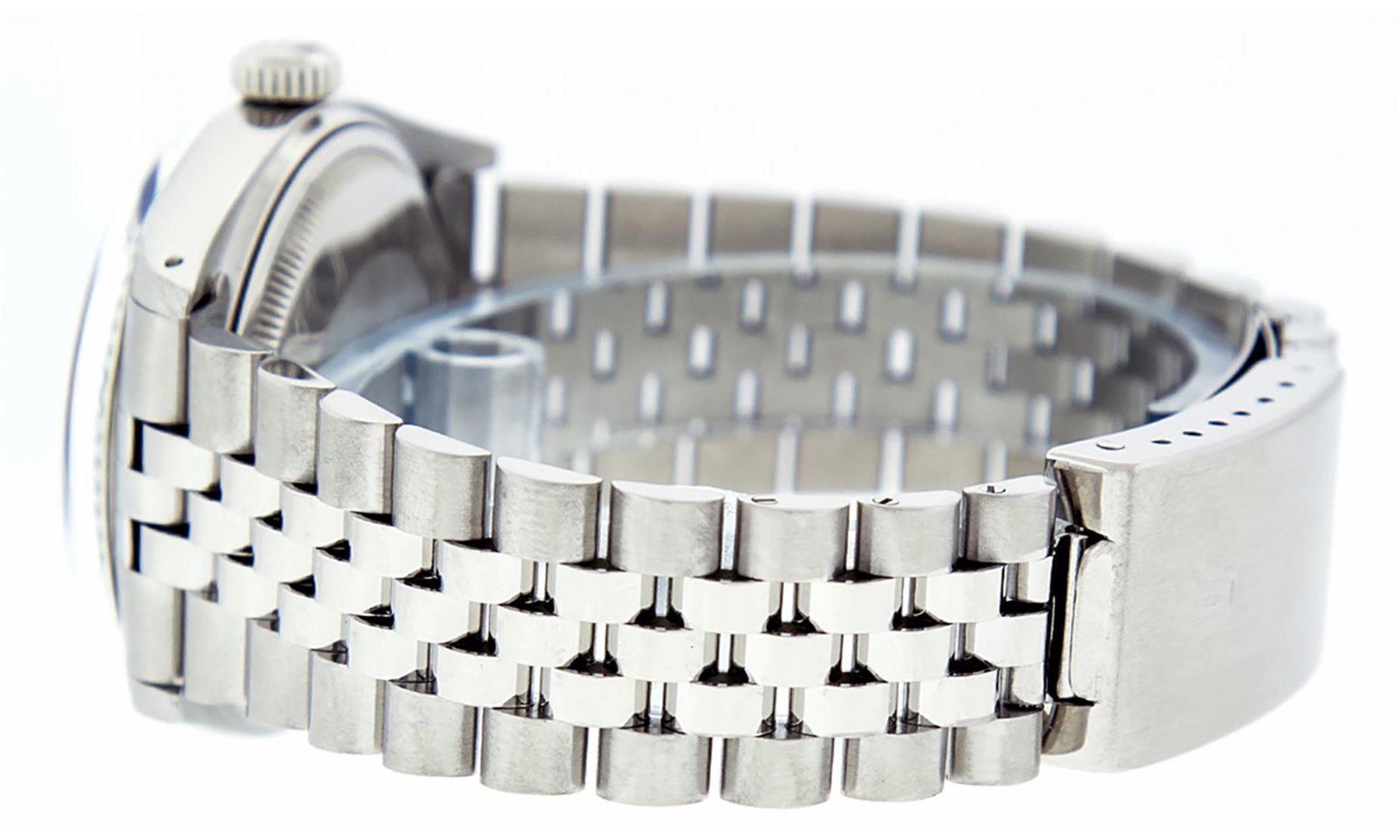 One Mens Rolex Datejust Polished Bright with Satin Finish, Serviced & Electronically Tested, Stainless Steel Case: 36mm, Stainless Steel Crown, Bezel: 14K White Gold Fluted Bezel. Custom Crystal: New Acrylic Cyclops Lens. Custom Hands: New Hands. Movement: Automatic Winding Movement Caliber 3035. Custom Dial: Silver Diamond Dial, Diamond Count: 10 Diamonds in Dial, G To H In Color, Si-VS Clarity. Date Window: 3 O'Clock Position Date Display, Quickset, Model: Datejust, Condition: G-6 Extra Fine. Bracelet:Stainless Steel Jubilee. Bright Polish & Satin Finish. 7.0 Inch Length, Adjustable. Standard Clasp, With Rolex Logo. Watch Has Been Serviced And Polished It Is Free Of All Scratches And Dents.