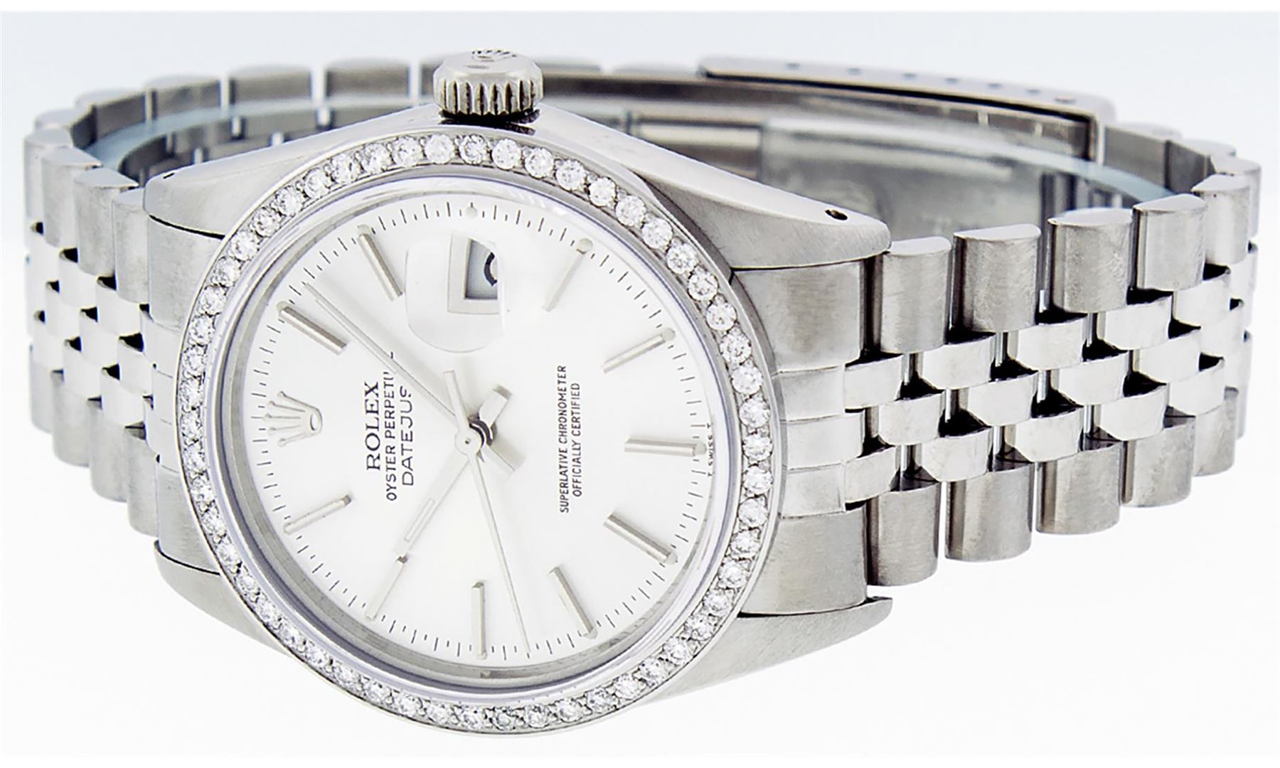 One Men's Rolex Stainless Steel Datejust Polished Bright with Satin Finish, This Watch Has Been Serviced & Electronically Tested, Stainless Steel Case: 36mm, Stainless Steel Crown, Custom Bezel: New Stainless Steel Beadset Diamond Bezel, Diamond Count: 54 Diamonds, Total Weight 1.00 Carat, Clarity: SI-VS, Color: G to H. Custom Crystal: New Synthetic Sapphire Cyclops Lens. Custom Hands: New Luminescent Hands. Movement: Automatic Winding Movement.. Custom Dial: Silver Index Dial With Lumi Dots & Dash Track. Date Window: 3 O'clock Position Date Display, Quickset, Model: Datejust. Condition: G-6 Extra Fine. Bracelet: Stainless Steel Jubilee Band. Bright Polish & Satin Finish. 7.0 Inch Length, Adjustable. Standard Clasp, With Rolex Logo. This Watch Has Been Serviced Time Tested And Is In Excellent Condition It Is Free Of All Scratches And Dents.